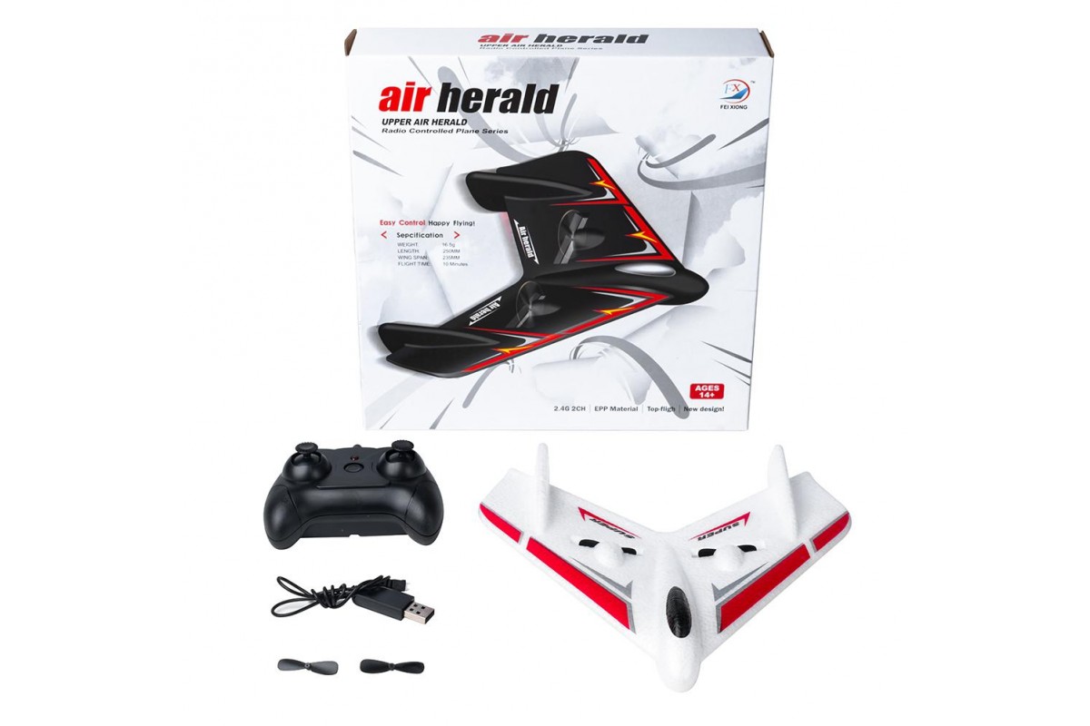 Радиоуправляемый двухканальный самолет типа ''летающее крыло'' выпускается в различных вариантах окраски, оснащен двумя мощными электродвигателями с толкающими пропеллерами и способен летать как внутри просторных помещений, так и на улице в безветренную погоду.