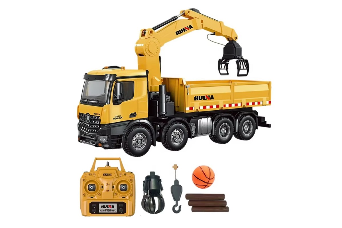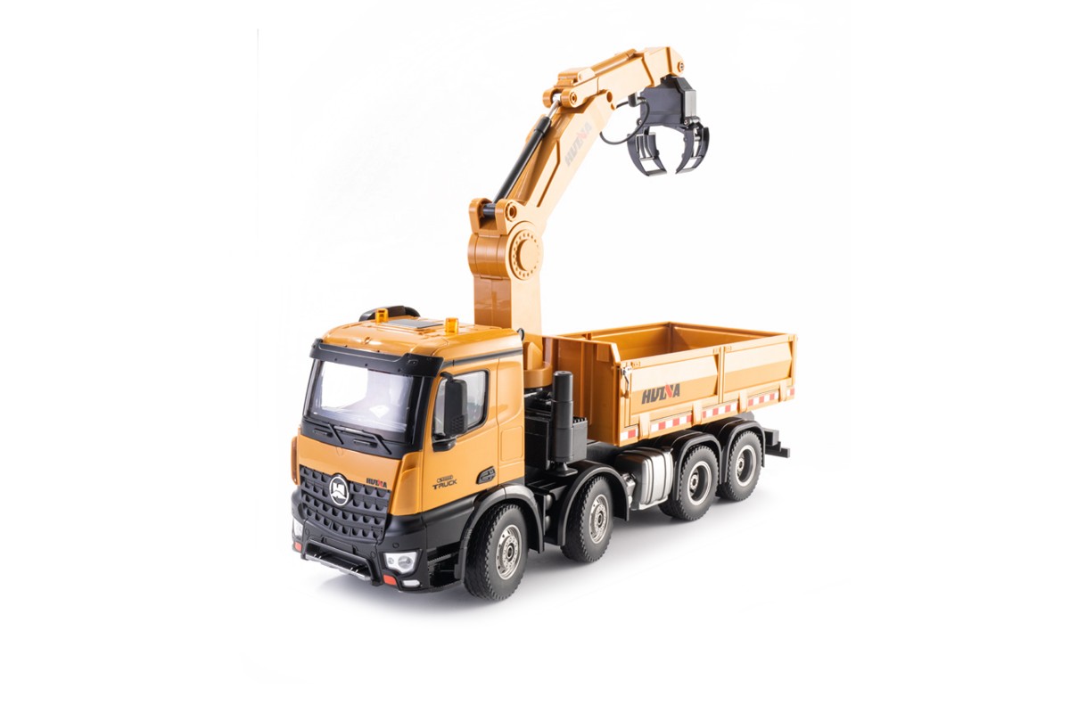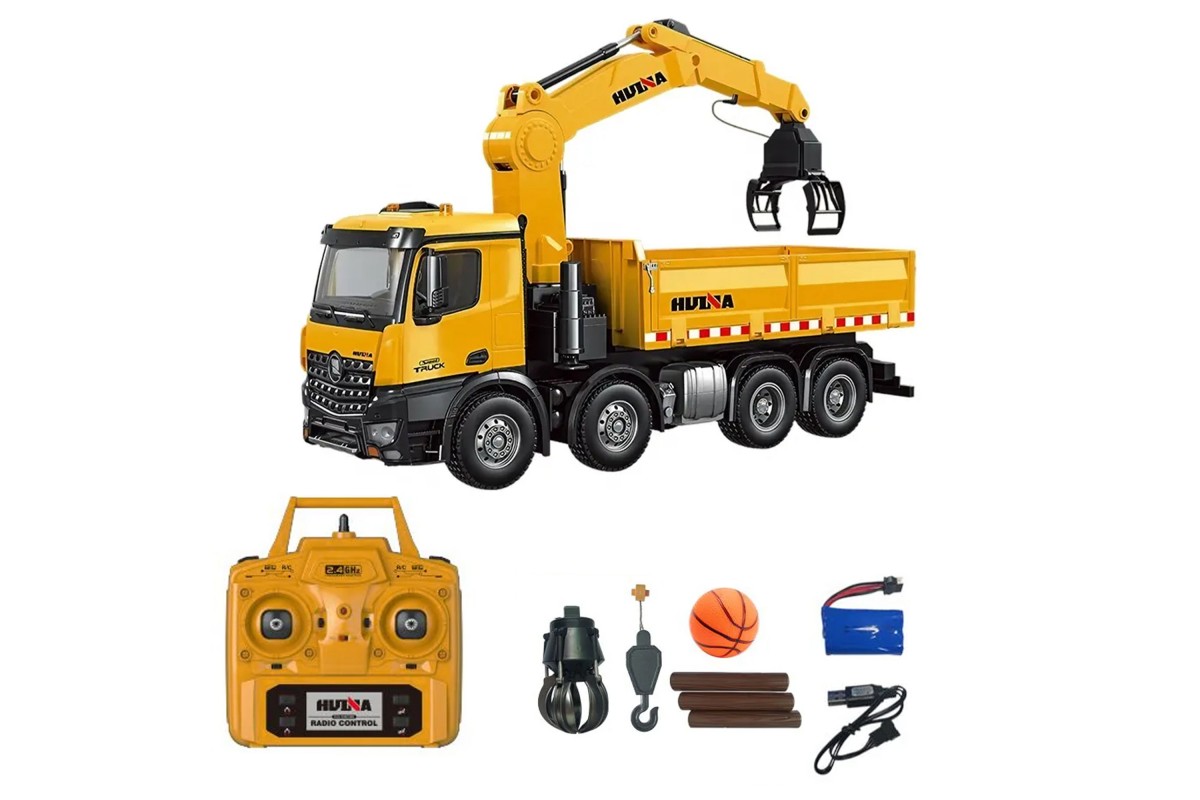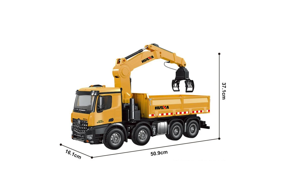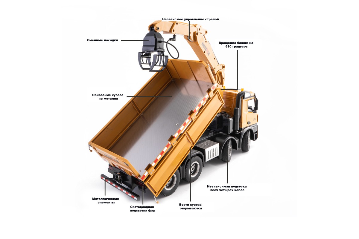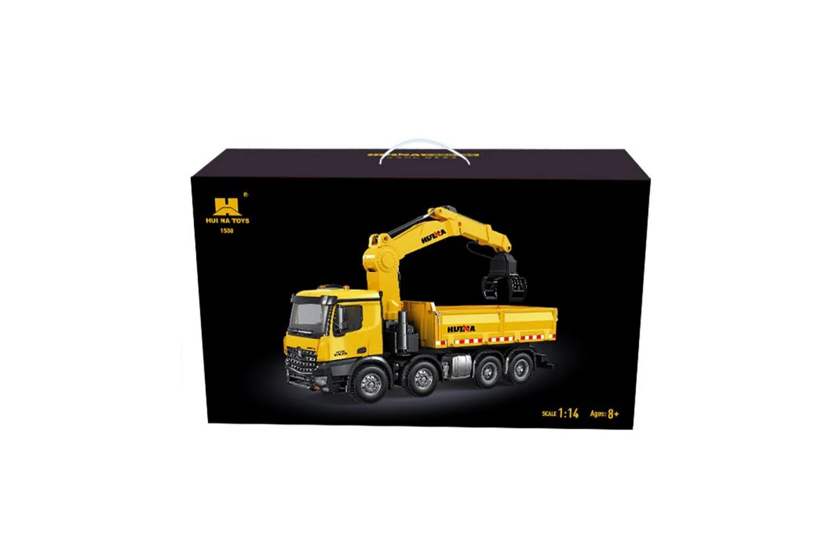 Радиоуправляемый самосвал-кран-погрузчик HuiNa Toys 1:14 - HN1538 - это миниатюрная копия самосвала с вместительным кузовом и краном погрузчиком. Самосвал выполнен очень реалистично и полностью функционирует. Машина обладает высокой проходимостью, благодаря приводу на 4 задние колеса. Такое решение позволяет избежать проскальзывания задних колес. Управлять устройством можно при помощи пульта на частоте 2,4 ГГц, который работает от пальчиковых батареек. Так же с пульта управляется поднятие кузова грузовика. Вы сможете загрузить кузов вручную или при помощи погрузочного крана, перевести на нужное место и выгрузить автоматически. В комплекте сменные насадки для создания сразу трех моделей. Функциональность игрушки не оставит равнодушным даже взрослого. Машина имитирует звуковые сигналы рева мотора, поднимает и опускает кузов, а также оснащена светящимися фарами. Управление происходит на расстоянии 30 метров, а время работы на одном заряде составляет около 30 минут. С этим самосвалом будет интересно играть как взрослому, так и ребенку, ведь вы будете управлять настоящей строительной техникой
