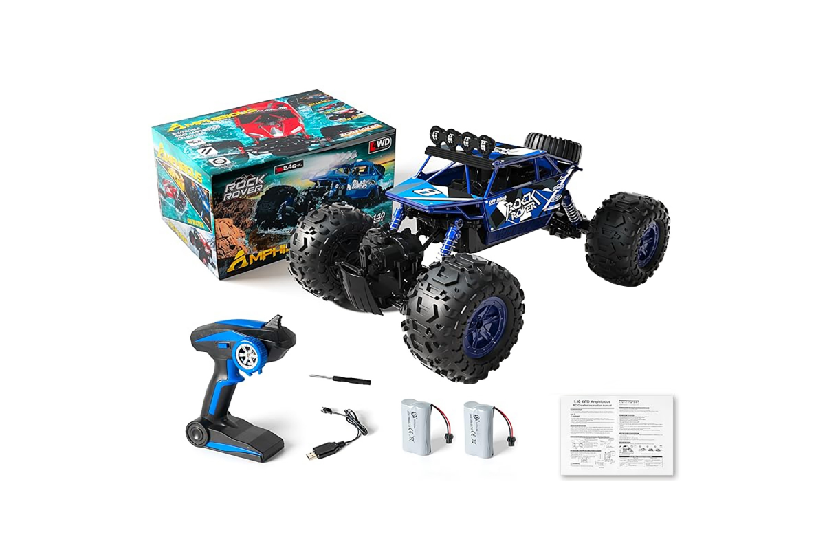 Радиоуправляемый синий краулер амфибия (2 АКБ 7.4В, свет, 1:10) - C1201W-BLUE-V2 - представляет собой краулер амфибия - это универсальный автомобиль, отличающийся высокими показателями проходимости трассы, проложенной на пересеченной местности и влагозащитой электроники. Автомобиль имеет металлическую кабину, усиленную раму жесткости. Движется при помощи 4 довольно больших колес, оснащенных шинами с глубоким рисунком протектора.