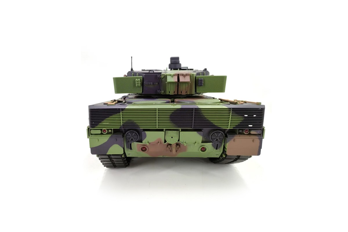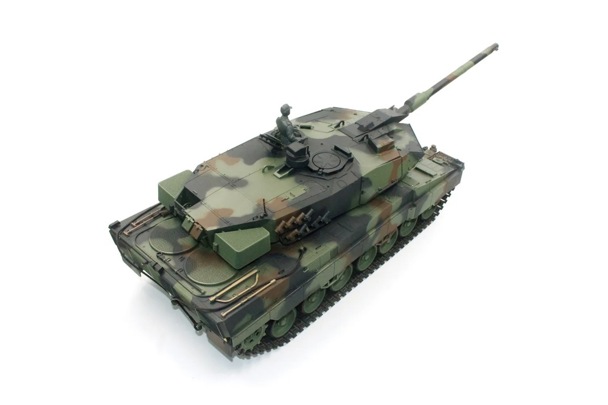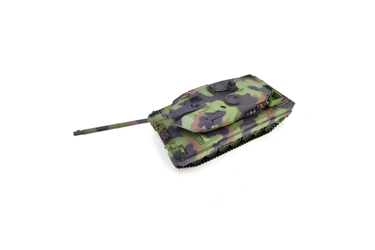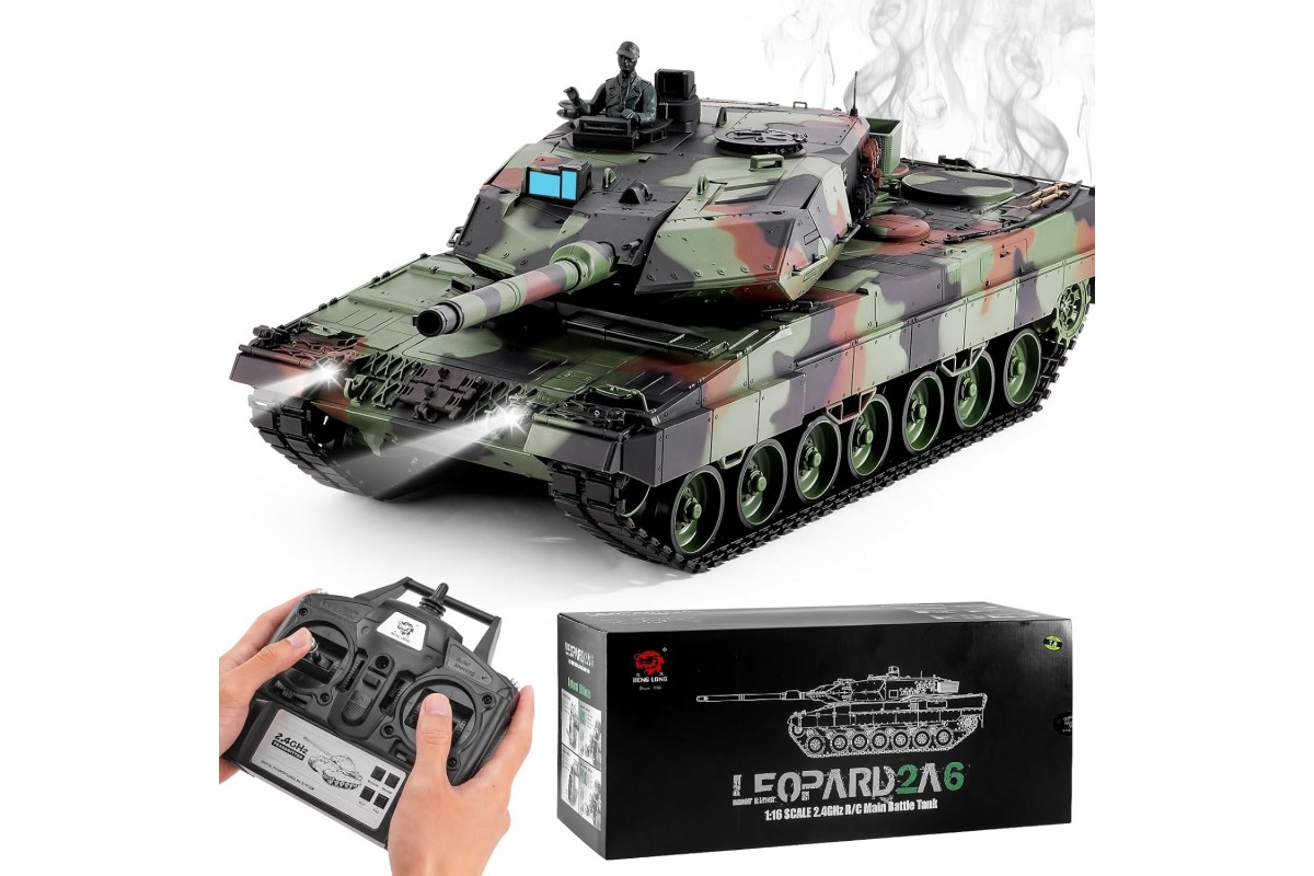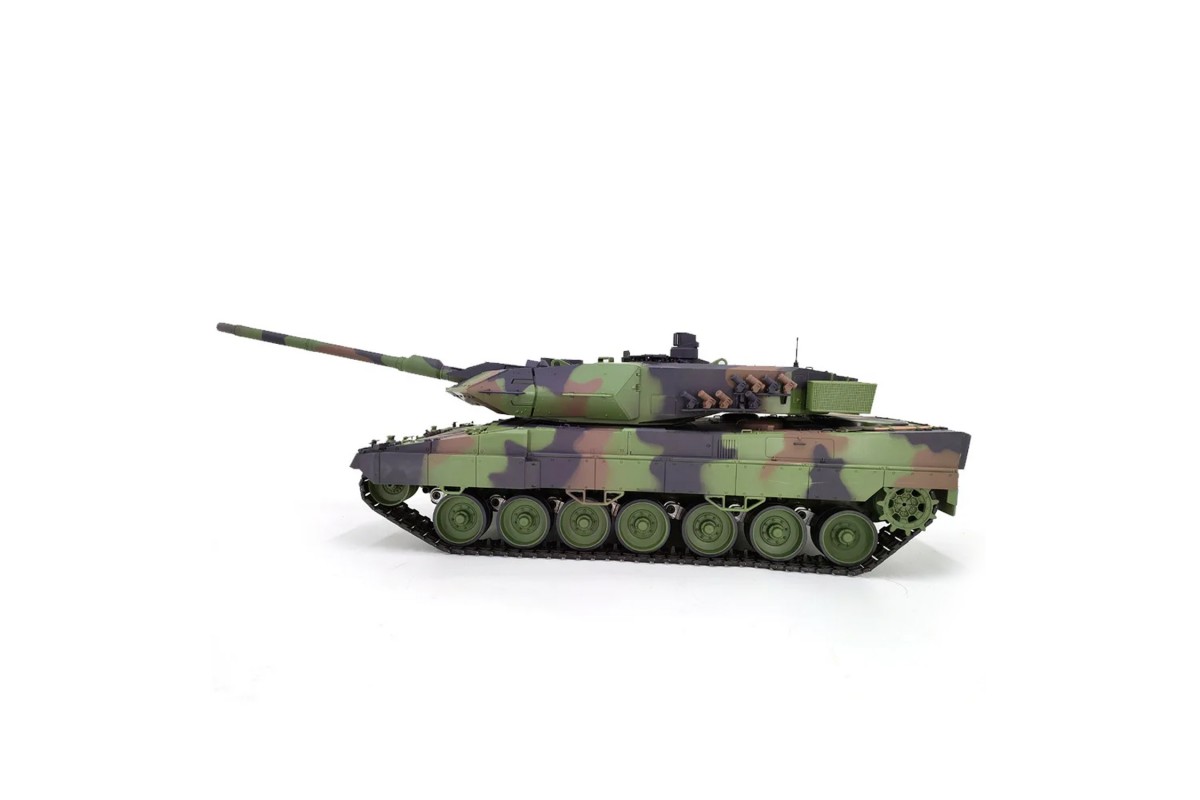 Радиоуправляемый танк Heng Long Leopard 2A6 V7.0 1:16 RTR 2.4GHz - HL-3889-1-V7 - это танк Леопард 2 - немецкий основной боевой танк на радиоуправлении в масштабе 1:16. Развитие Leopard 2 датируется 1970 годом, параллельно с продолжением совместного проекта США и ФРГ MBT-70. Целью был современный и мобильный боевой танк, который должен заменить Leopard 1. По итогам всех испытаний и конструктивных доработок в 1977 году было принято решение о производстве 1800 танков в пяти сериях. В 1979 году он поступил на вооружение. C 2001 года модернизируется до уровня самого современного немецкого ОБТ, уровня Леопард 2А6. Новый танк получил усиленное бронирование башни и дополнительную противоминную защиту. Главным отличием новой модели является орудие Rhl 120/L55 с увеличенной на 11 калибров (1320 мм) длиной ствола.