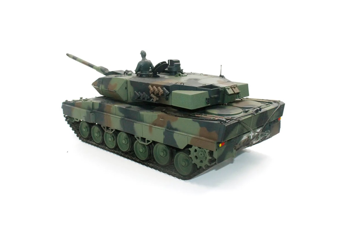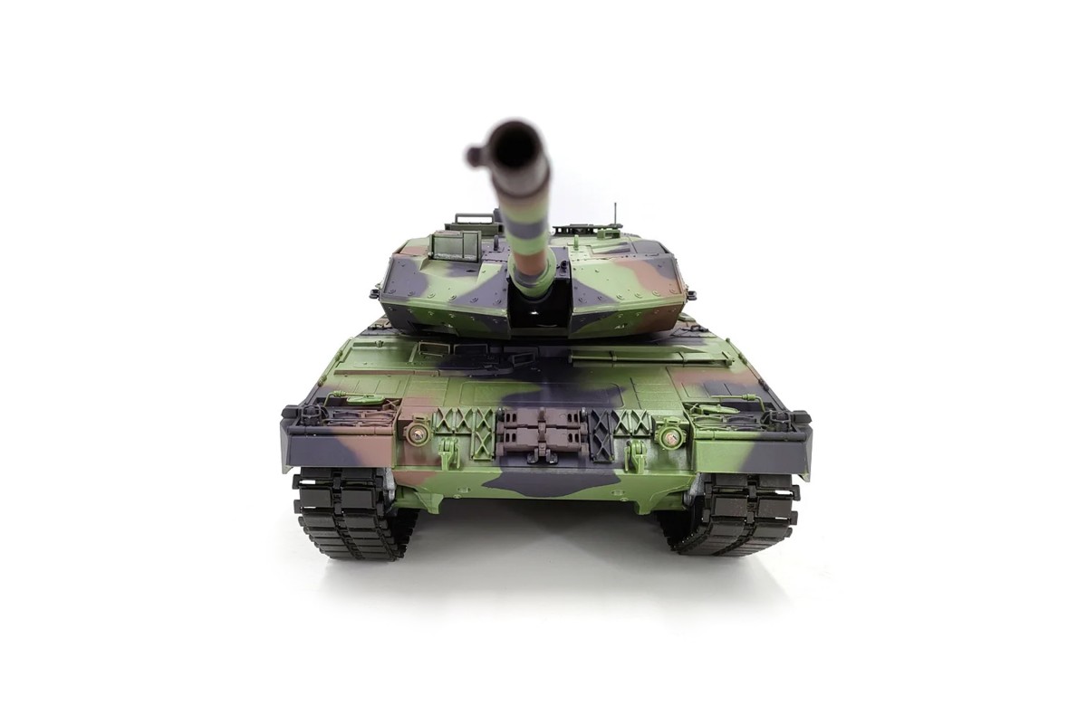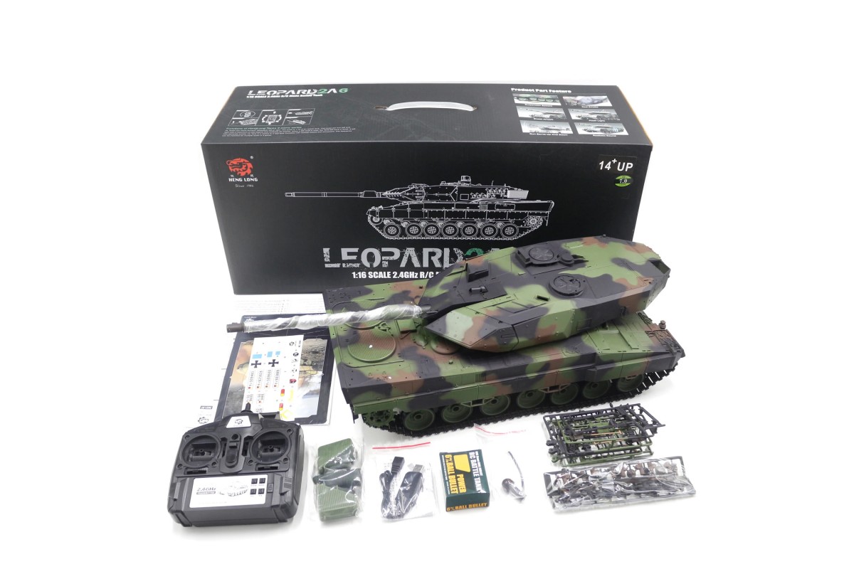 Радиоуправляемый танк Heng Long Leopard 2 A6 приближен к своей реальной копии танка. Оснащен пневматической и ик-пушками. Танк Heng Long совершает движения вперед и назад на 2-х скоростях, разворот на 360, вращающаяся башня с поднимающимся-опускающимся дулом. Мощные тяговые двигатели на модели танка придают этой игрушке довольно большие параметры по проходимости и маневренности. Башня танка управляется с пульта, дуло поднимается и опускается – стрелять можно пластиковыми шариками на расстояние до 30 метров.