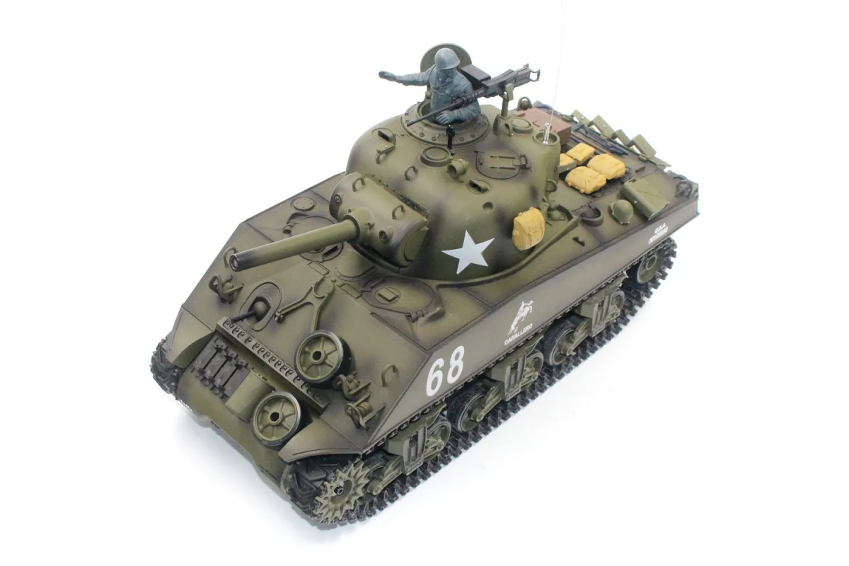 Радиоуправляемая модель танка Heng Long Ginzzu M4A3 Sherman с совмещенной пневмо- и ИК-пушкой и аппаратурой управления 2.4GHz версии 7.0. Возможность настроить передатчики на разные частоты позволяет участвовать в сражении до 3-х танков одновременно.