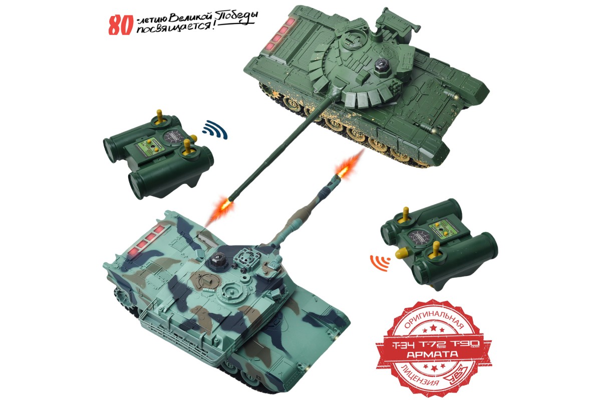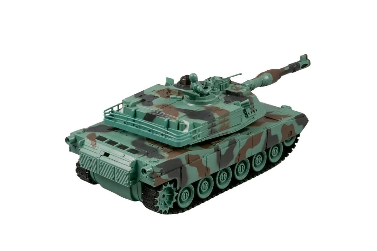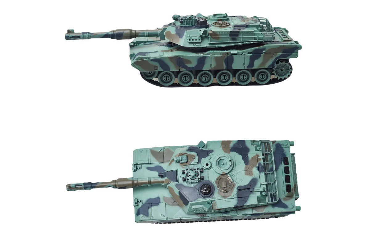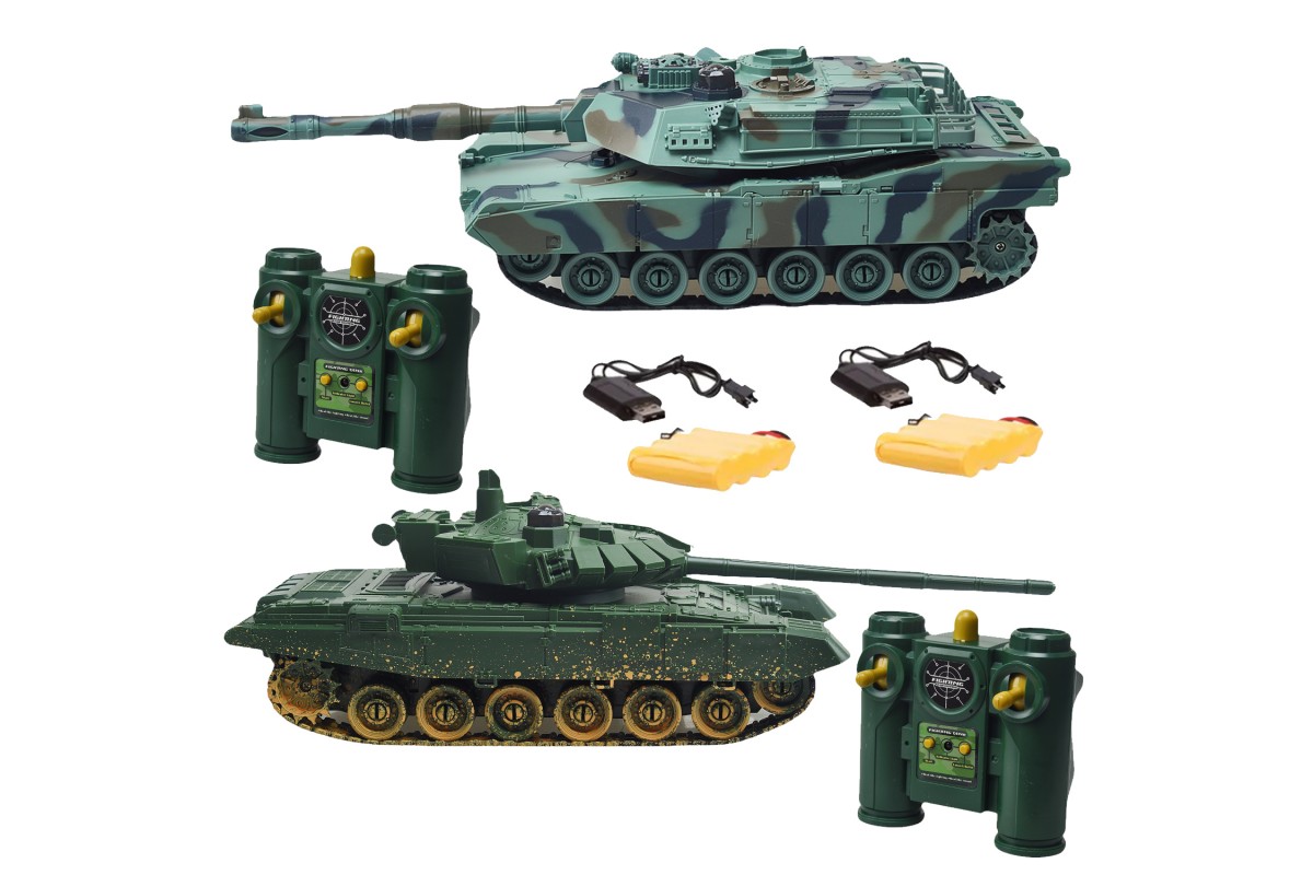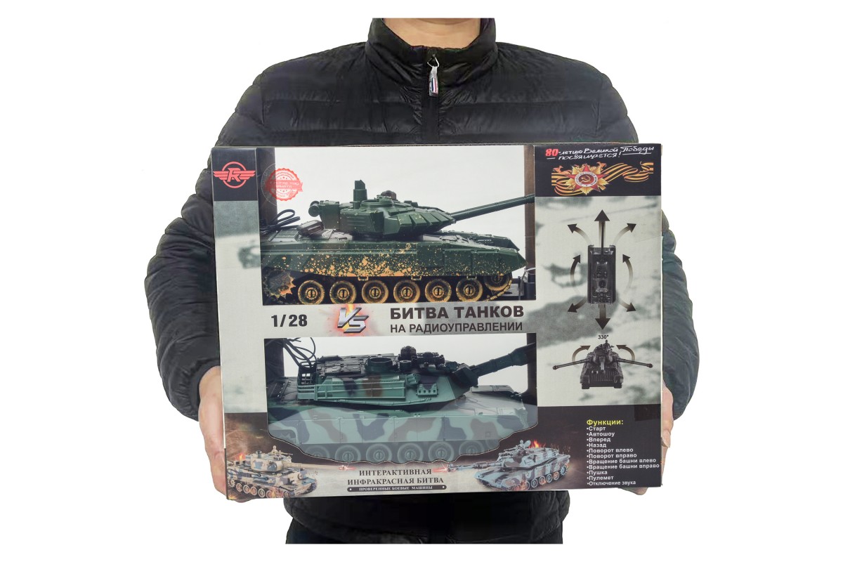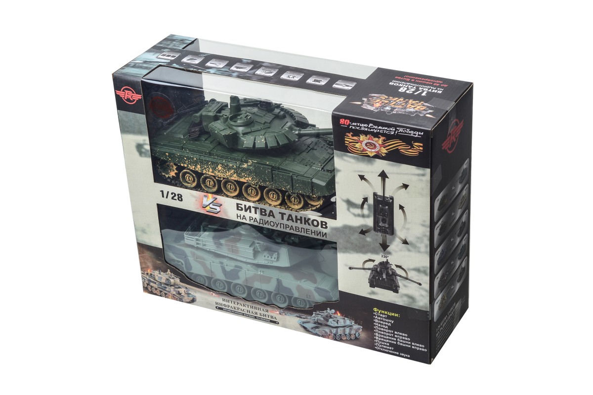 Радиоуправляемый танковый бой (советский T72 + M1 Абрамс США) - RWG99851 - это набор из двух радиоуправляемых моделей танков, которые работают на частоте 2.4G. Стрельба осуществляется инфракрасным лучом на расстояние до 3 м в секторе до 10 градусов. Имитируется выстрел пушки. На задней части башни 5 светодиодов жизнеспособности танка. Танк издает звук работы двигателя и звук выстрела орудия. Питание танка происходит от аккумулятора 4.8v 700mAh, а зарядное устройство входит в комплект поставки.