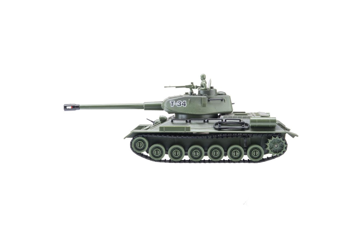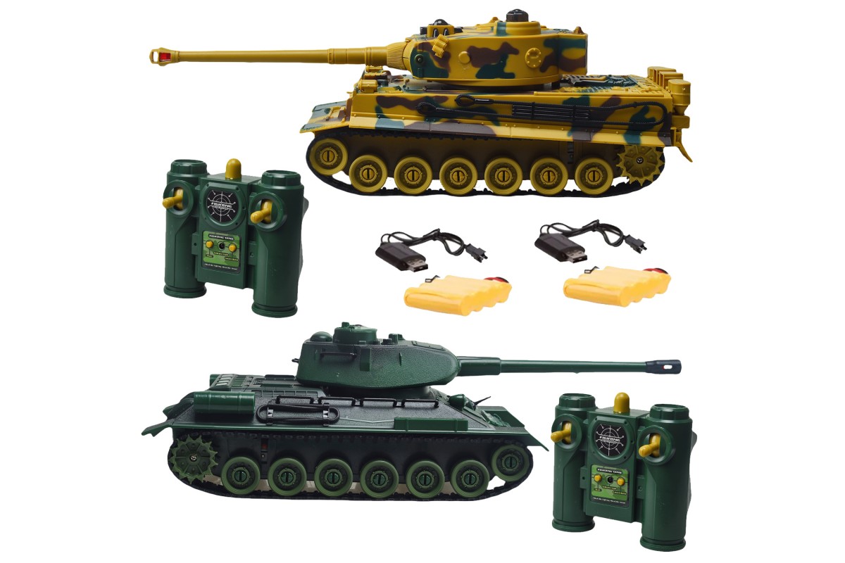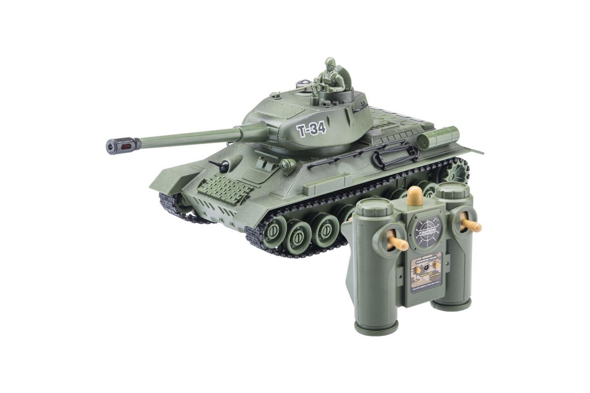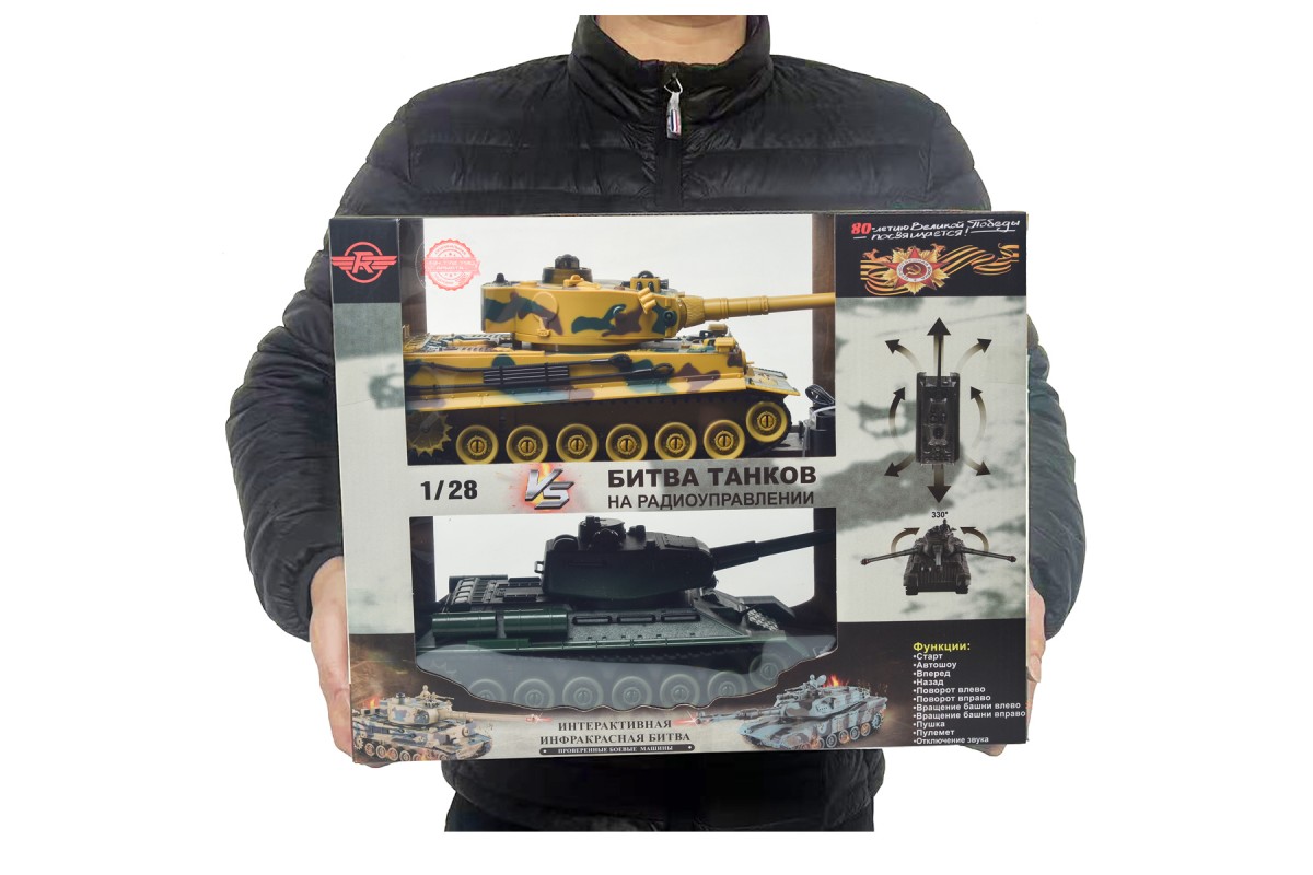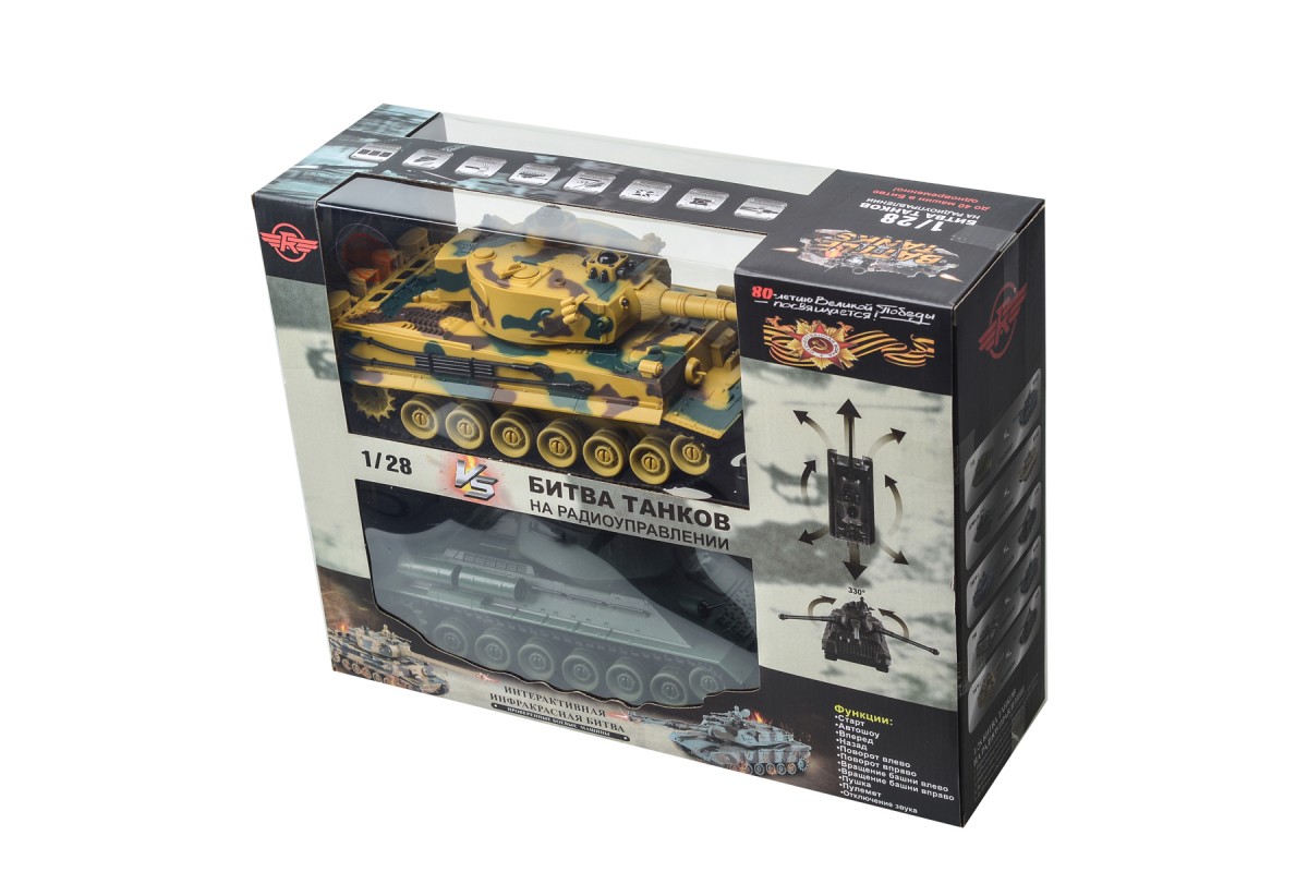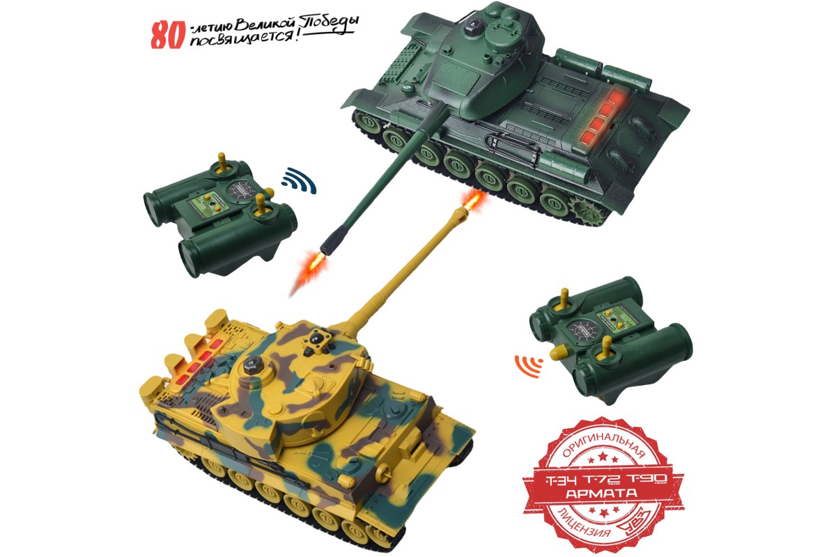 Радиоуправляемый танковый бой (ТИГР I + Т-34) - RWG99854 - это набор из двух радиоуправляемых моделей танков, которые работают на частоте 2.4G. Стрельба осуществляется инфракрасным лучом на расстояние до 3 м в секторе до 10 градусов. Имитируется выстрел пушки. На задней части башни 5 светодиодов жизнеспособности танка. Танк издает звук работы двигателя и звук выстрела орудия. Питание танка происходит от аккумулятора 4.8v 700mAh, а зарядное устройство входит в комплект поставки.