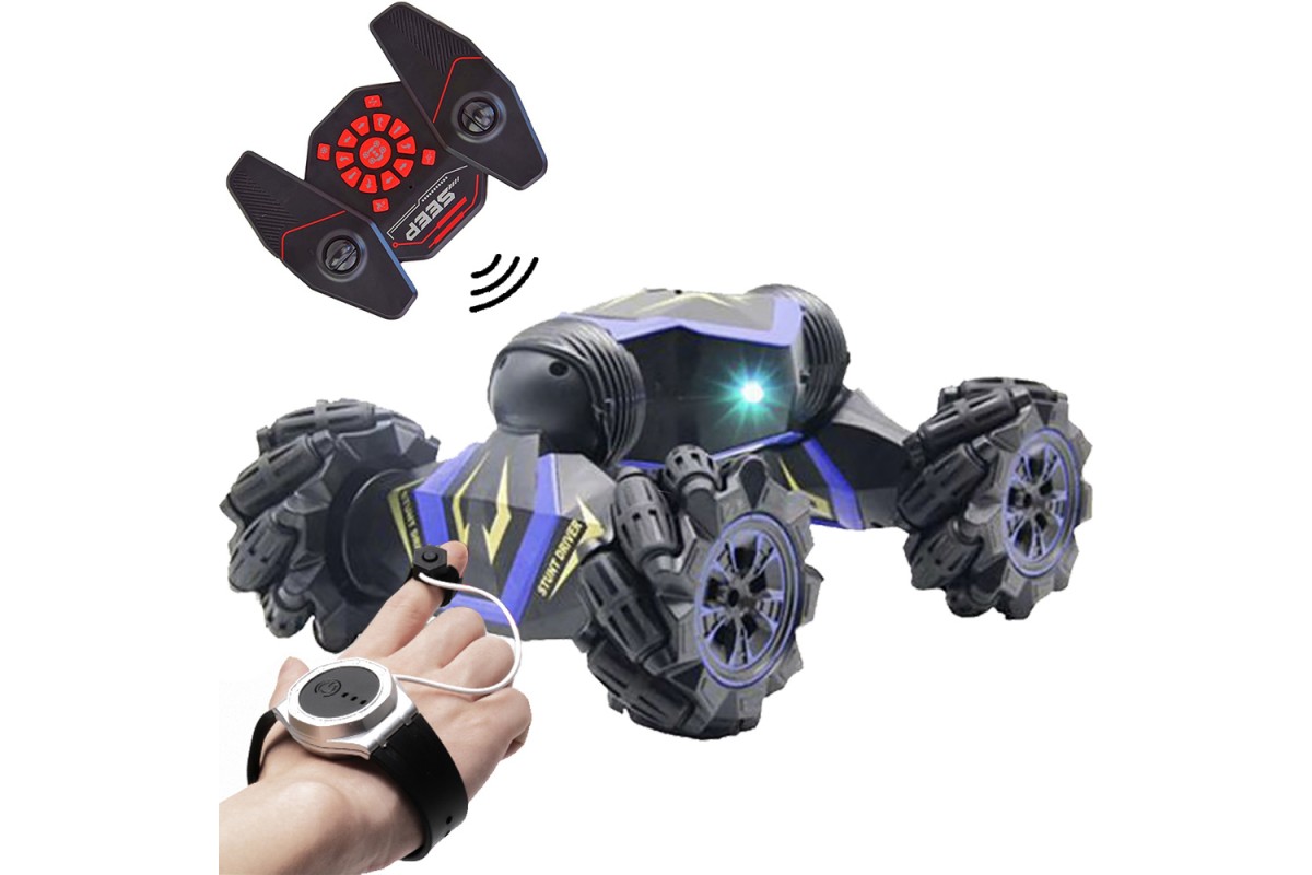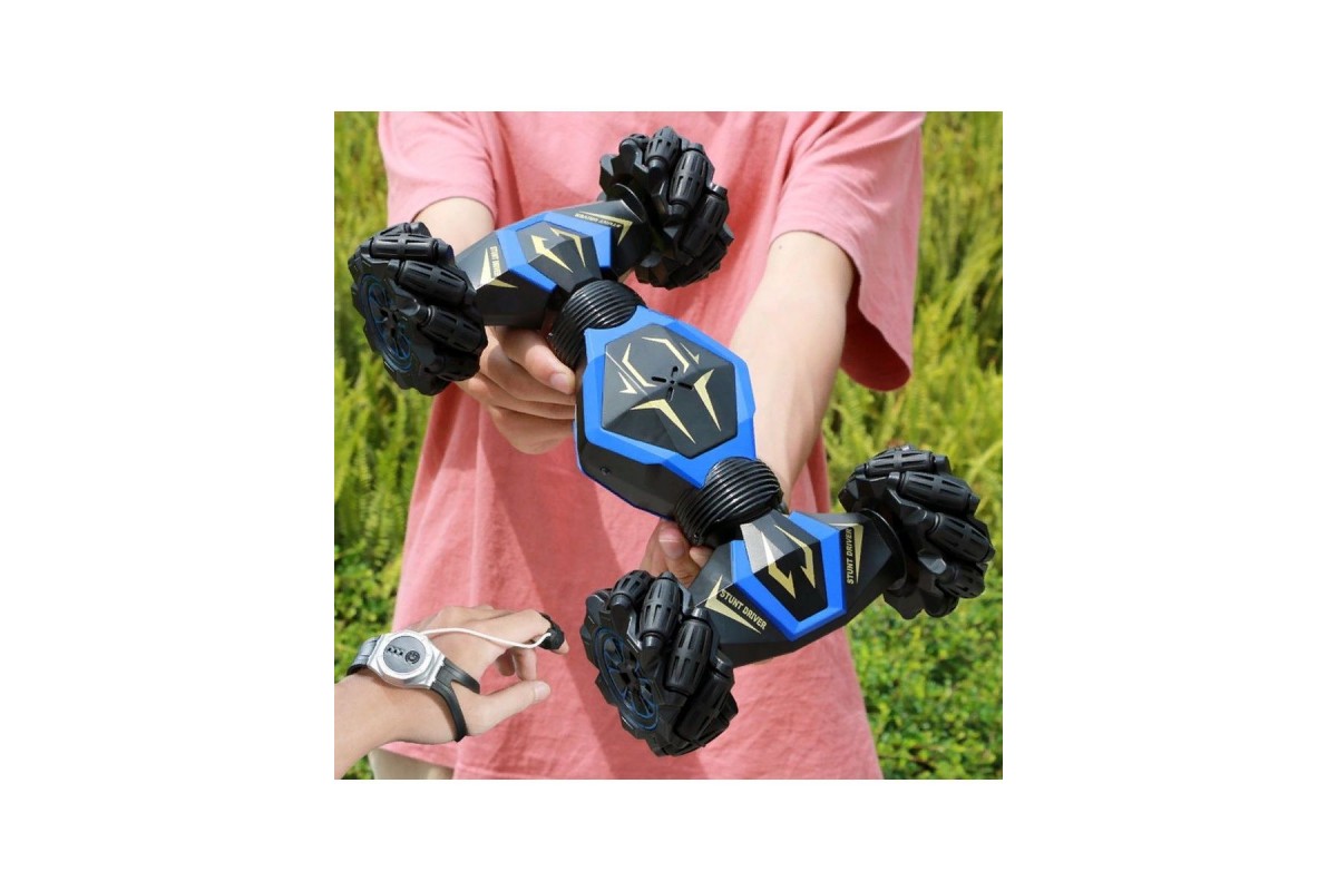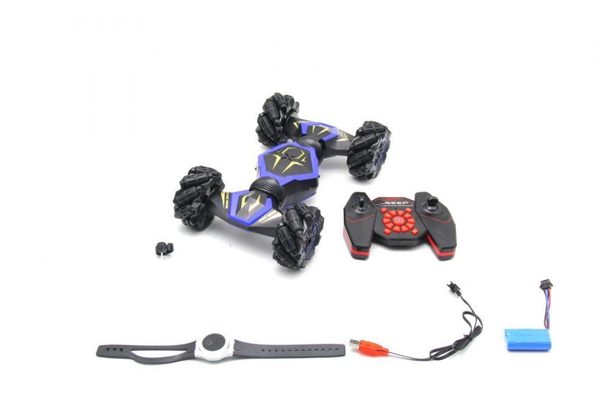 Радиоуправляемый внедорожник-перевертыш MZ масштаб 1:14, синий - MZ-YY2018-BLUE - это радиоуправляемый внедорожник-перевертыш создан для трюков и контролируется как при помощи классического пульта управления, так и с помощью жестов посредством браслета, стилизованного под часы. В скоростной конфигурации эта машина едет довольно быстро, а если дистанционно изменить дорожный просвет, для нее не будет преград. Полноприводный автомобиль-трансформер способен мчаться по асфальту, а если машина перевернется, она сможет спокойно ехать в перевернутом состоянии. Колеса машины настолько огромны, что кузов в любом положении не касается земли!