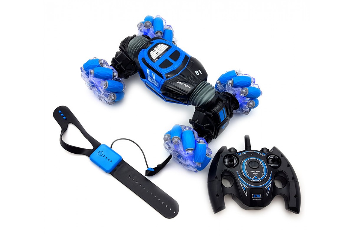 Радиоуправляемый внедорожник Твистер (часы + пульт) 1:16 - UD2196A-BLUE - это машинка перевертыш Hyper Skidding, которая является несомненным хитом продаж среди радиоуправляемых моделей. Обновленная версия стала еще лучше. О такой машинке мечтает каждый мальчик. Возможности машинки Hyper Skidding просто невероятны. Она может ездить, крутиться на месте, переворачиваться и ехать дальше, приподниматься и даже танцевать. Но главная особенность заключается в управлении. Данной машинкой можно управлять жестами при помощи специального браслета, который входит в комплект с машинкой Hyper Skidding. Увлекательный процесс управления понравится не только детям, но и взрослым. И все это будет сопровождаться звуками работающего мотора, яркой подсветкой колес и песнями. Особенно эффектно машинка смотрится в темноте.