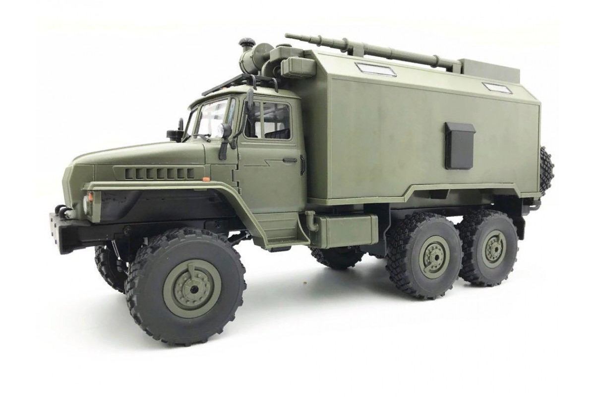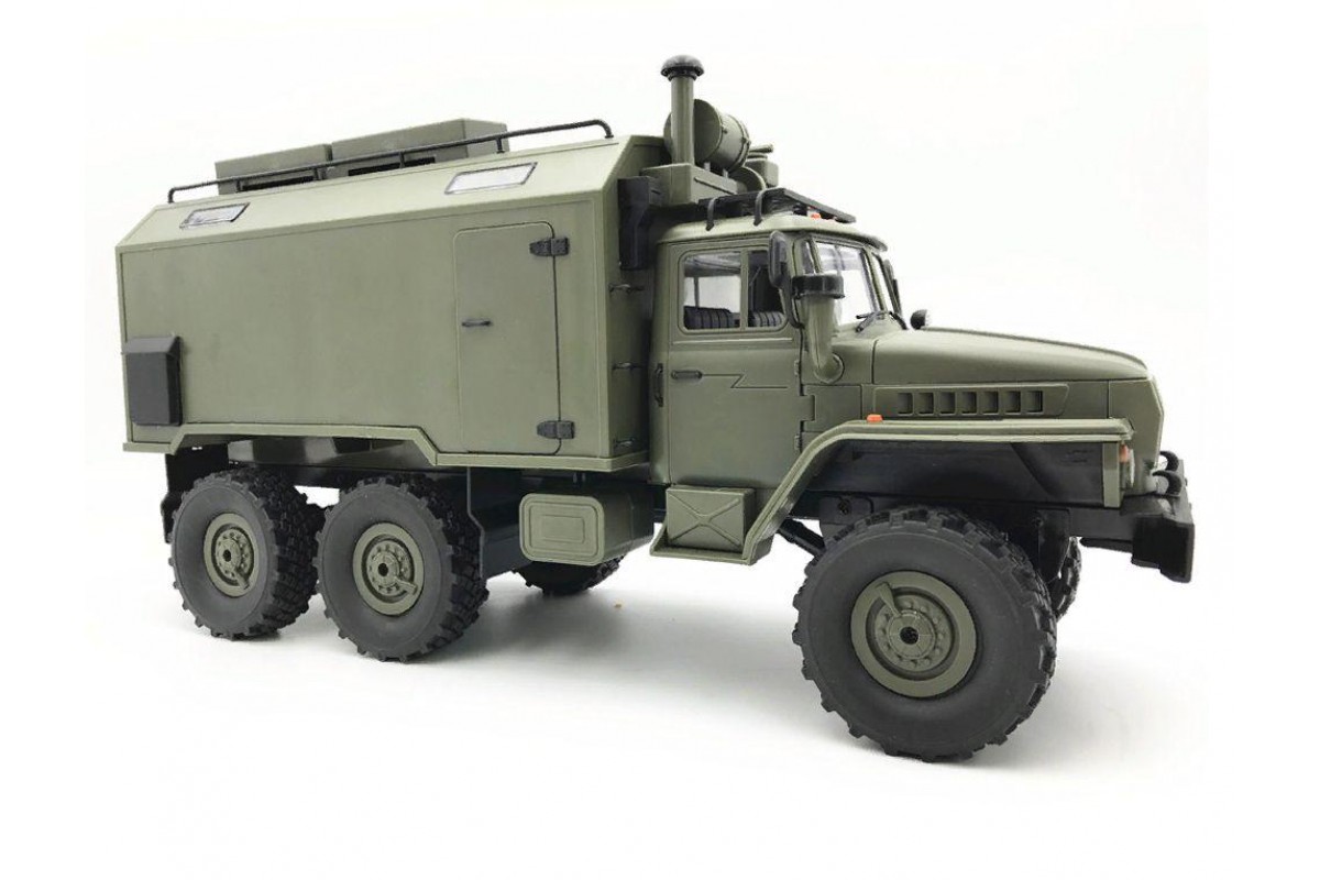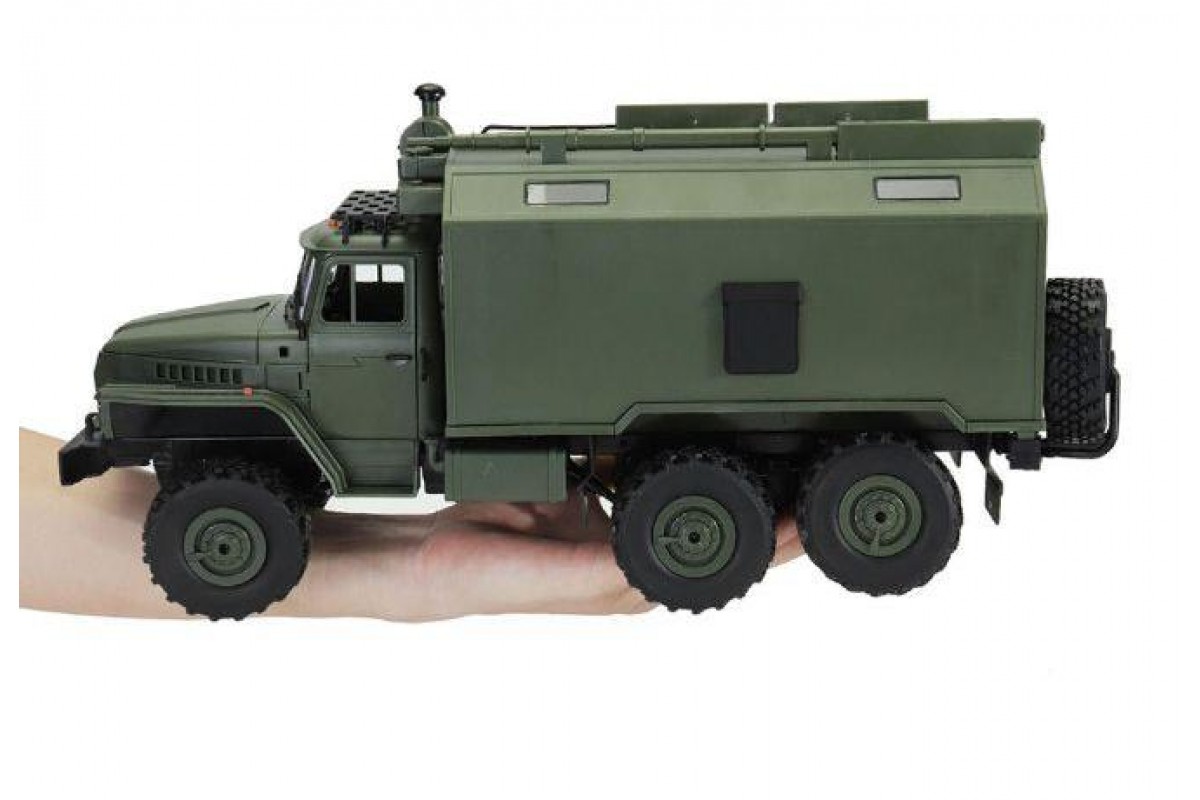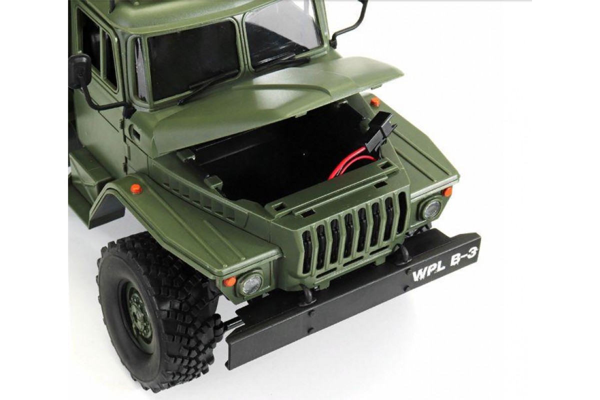 Радиоуправляемый внедорожник WPL Советский военный грузовик Урал 4WD 1:16 2.4G - WPLB-36 - это полукопия легендарного советского грузовика Урал выполнена в масштабе 1/16, оснащена полным приводом, действующей рессорной подвеской и мощным коллекторным электромотором. Радиоуправляемый Урал имеет богатую деталировку, в кабине можно увидеть руль и интерьер. Кунг и кабина изготовлены из прочного АВS пластика и установлены на прочную раму. Литиевый аккумулятор 7.2В, 500мАч спрятан под открывающийся капот, там, где у настоящего автомобиля Урал расположен мотор.