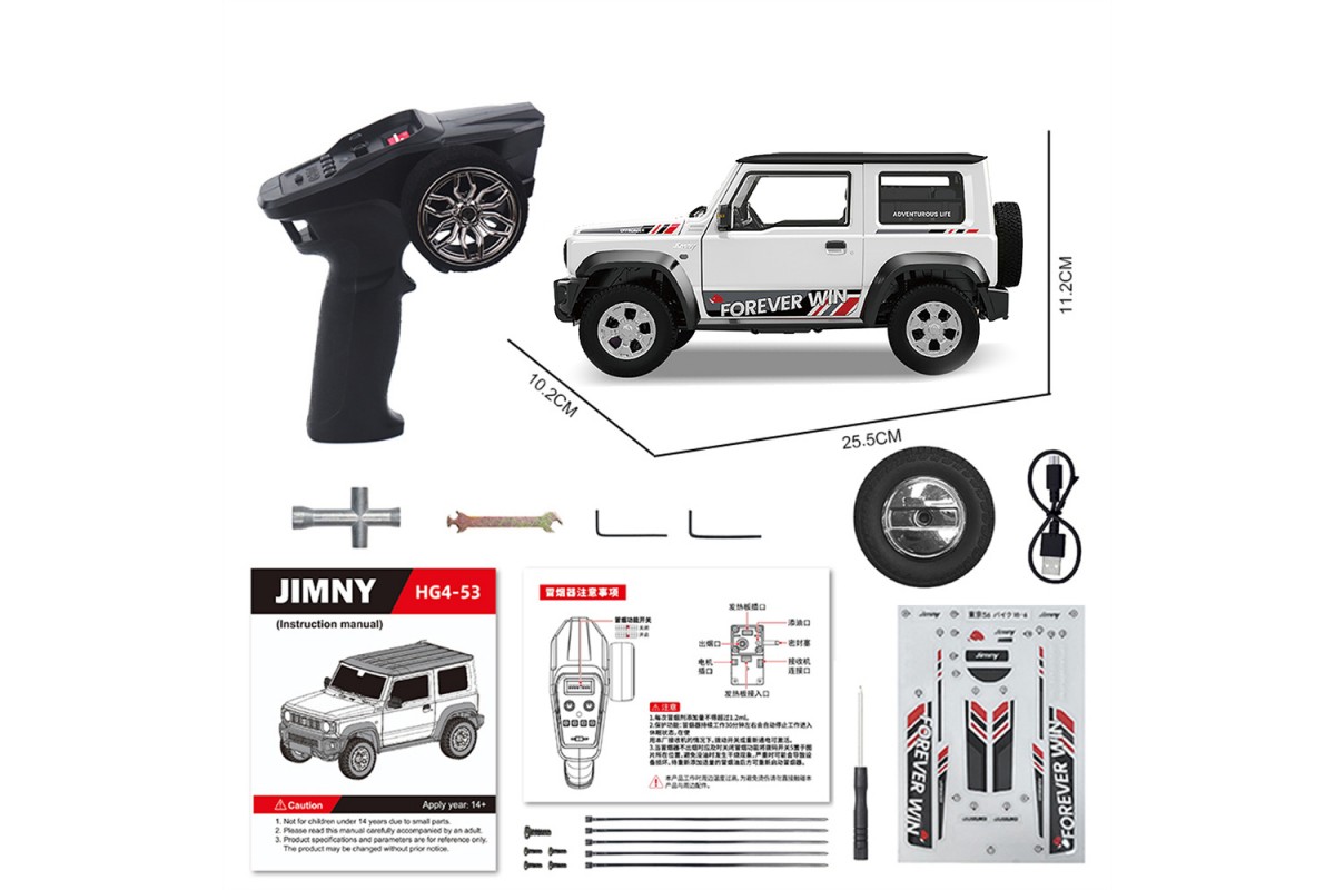 Радиоуправляемый внедрожник Suzuki Jimny PRO (свет, выхлоп, Li-Po 5C) - HG4-53-PRO-WHITE - это лицензионная модель внедорожника на пульте управления в масштабе 1/16 оснащен полным приводом и мощным коллекторным электромотором. Внедорожник имеет богатую деталировку и оборудован светящимися фарами. Кузов изготовлен из прочного АВS пластика, в кабине можно увидеть сиденья, руль и интерьер.