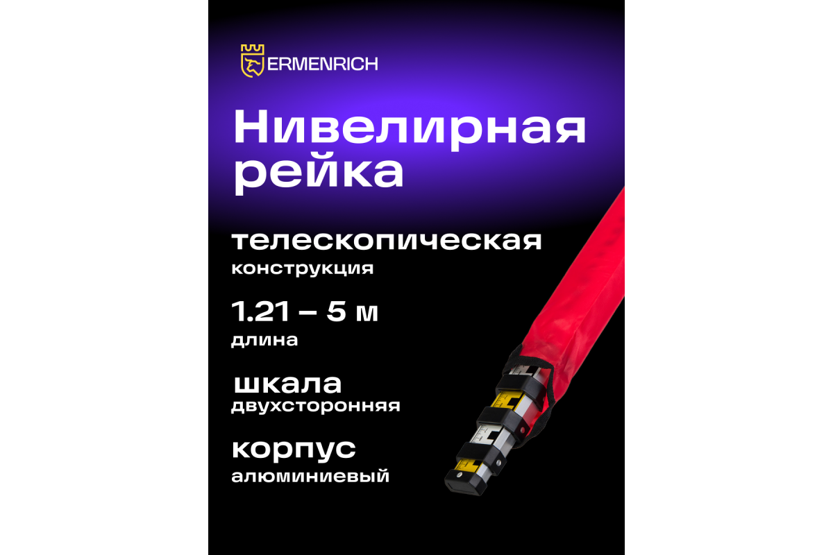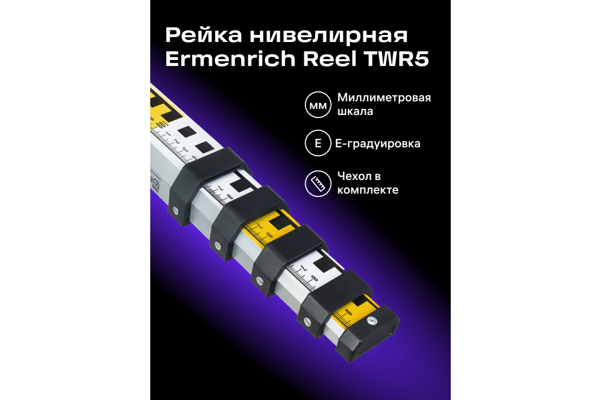 Телескопическая рейка Ermenrich Reel TWR5 предназначена для работы с нивелирами. Она изготовлена из легкого алюминия, но обладает большой плочностью и устойчивостью к повреждениям. Шкала нанесена с двух сторон полотна: с одной стороны дана разметка в миллиметрах, с другой – Е-градуировка.