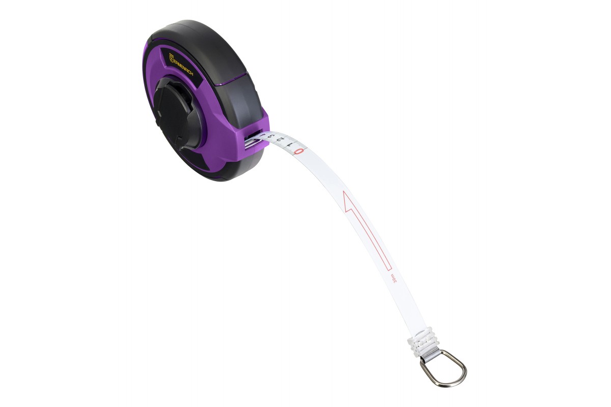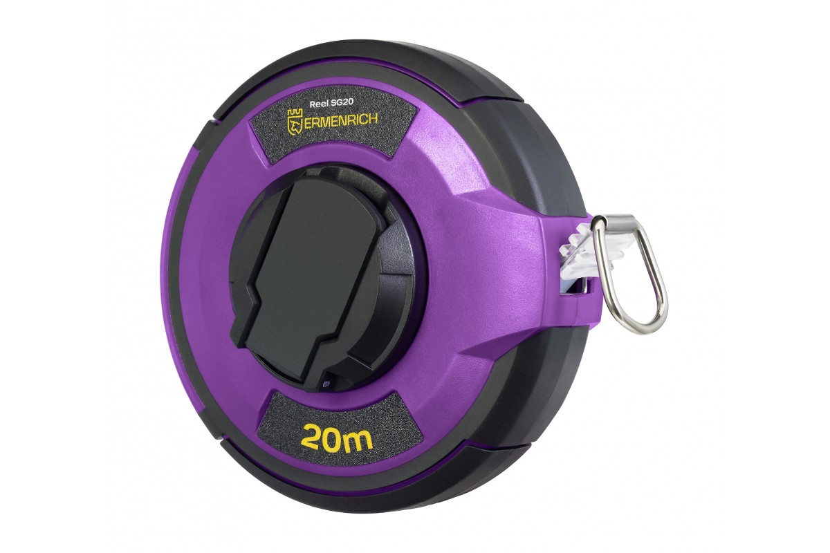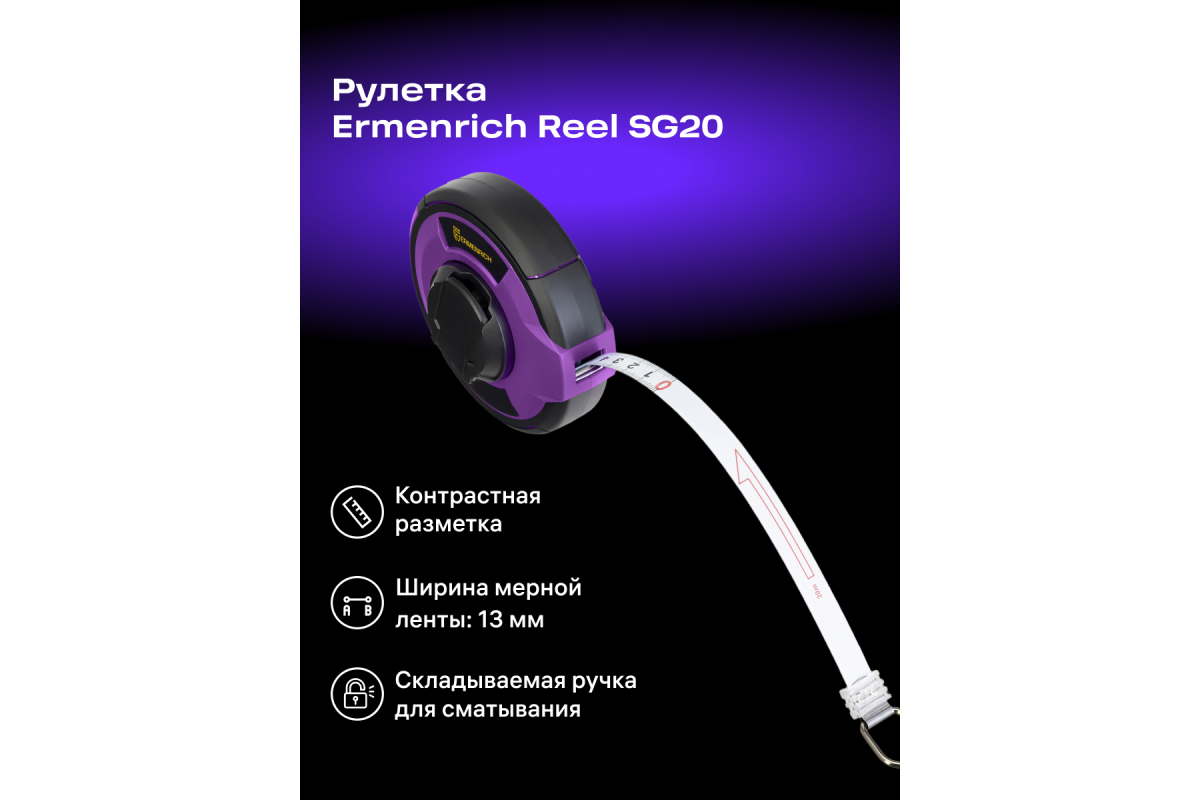 Дополнительным аспектом надежности рулетки Ermenrich Reel SG20 является ее корпус, материалом которого выступает ABS-пластик повышенной прочности. Корпус обрезинен. Полотно белого цвета с односторонней шкалой удобно сворачивать обратно при помощи боковой ручки.