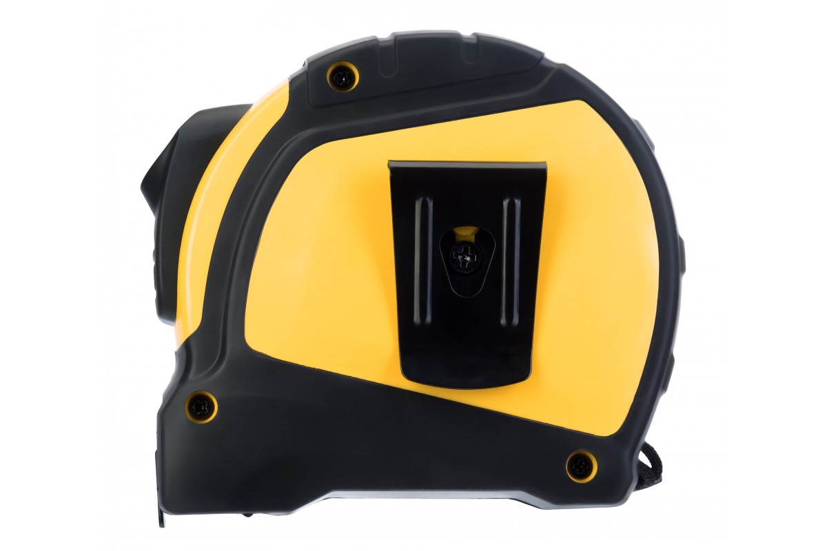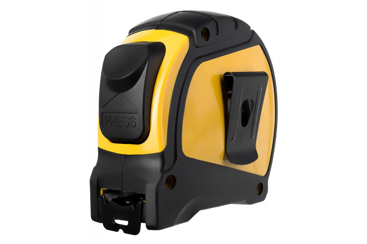 Рулетка самоблокирующаяся, механизм блокировки управляется с помощью эргономично расположенной кнопки, которая ложится прямо под пальцы. Наличие зацепа на ленте помогает в ее позиционировании и нанесении разметки. Материал одностороннего полотна – матовая сталь, а корпус сделан из ABS-пластика повышенной прочности с прорезиненным покрытием. Поясное крепление и наручный ремешок дают возможность выбрать наиболее удобный вариант для переноски инструмента.