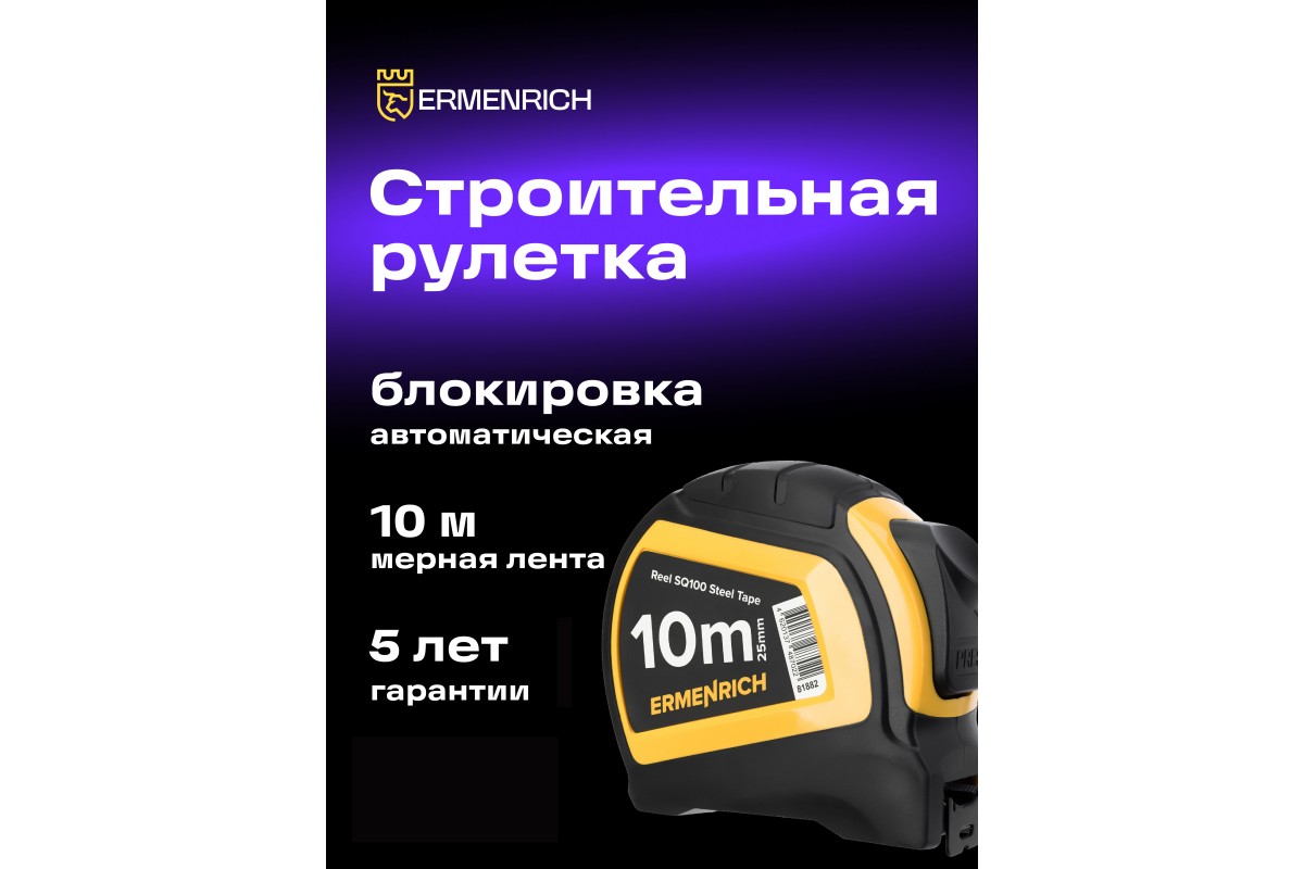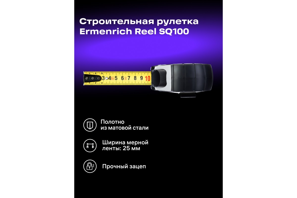 Рулетка Ermenrich Reel SQ100 – инструмент для измерений, который займет достойное место в арсенале профессионалов-строителей, мастеров отделочных работ, геодезистов, дизайнеров и других специалистов. Среди преимуществ модели стоит отметить большую длину полотна – 10 метров. Она позволяет охватить практически весь спектр измерительных работ на строящемся или ремонтируемом объекте. Универсальный инструмент найдет свое применение и в быту – это незаменимый помощник в квартире, гараже или загородном доме.