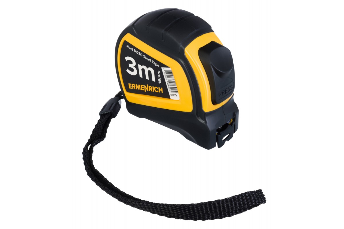 Полотно измерительной ленты выполнено из прочной матовой стали. Лента односторонняя, снабжена прочным зацепом. Механизм автоблокировки позволяет зафиксировать ленту, чтобы запомнить результат измерения, а эргономичное расположение кнопки фиксации облегчает длительную работу. Компактный корпус Ermenrich Reel SQ30 сделан из высокопрочного ABS-пластика, который отличается устойчивостью к повреждениям и не трескается при случайном ударе или падении. Для дополнительной защиты и удобства хвата корпус прорезинен.
