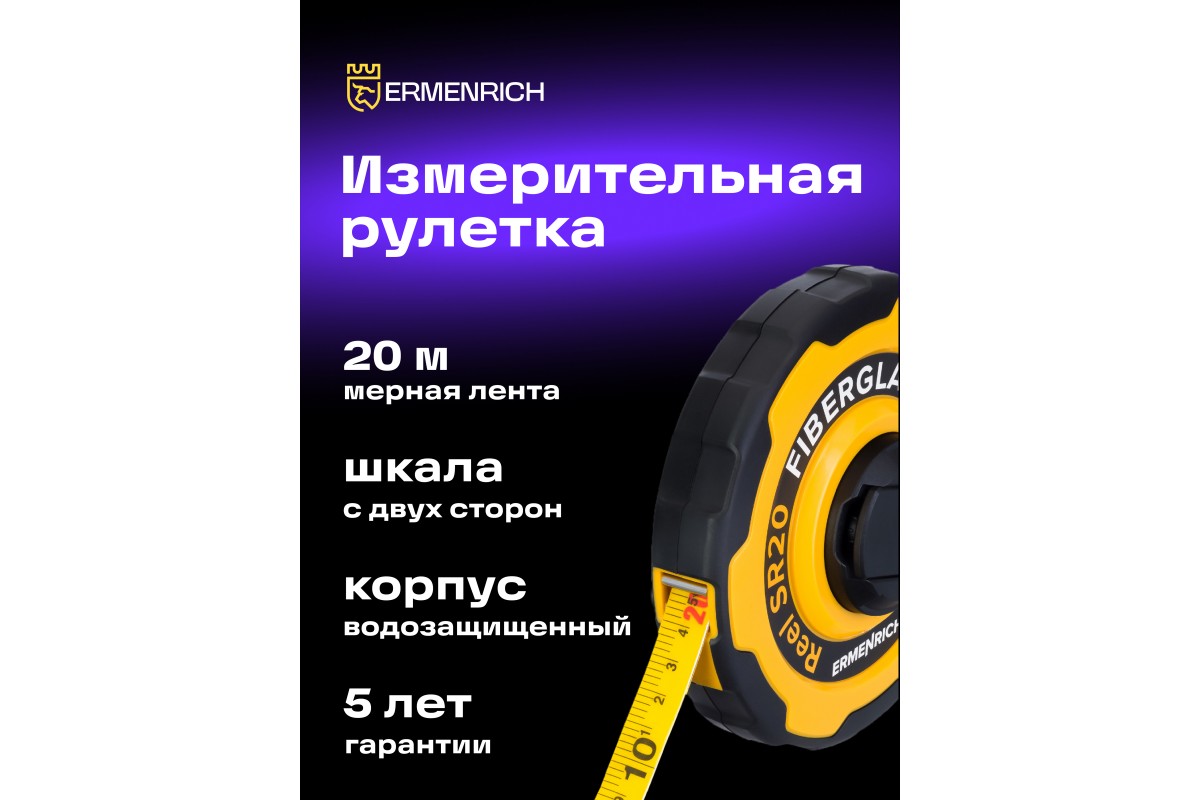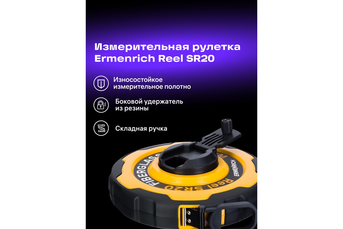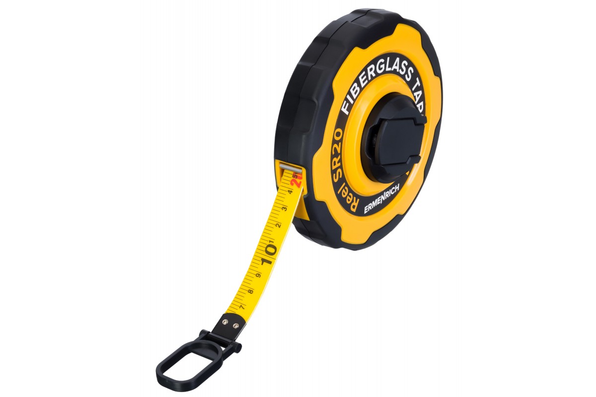 Ermenrich Reel SR20 – универсальная мерная лента с 20-метровым полотном, на которое нанесена двусторонняя шкала. Она может использоваться при выполнении строительных и землемерных работ, поможет в домашнем ремонте и декорировании помещений, станет отличным выбором для контроля размеров длинномерных материалов и деталей. Лента помещена в прочный дисковый корпус и дополнена удобным зацепом большого размера. Также она имеет складываемую катушечную ручку для сворачивания и боковой удерживатель, изготовленный из термопластичной резины (TPR).