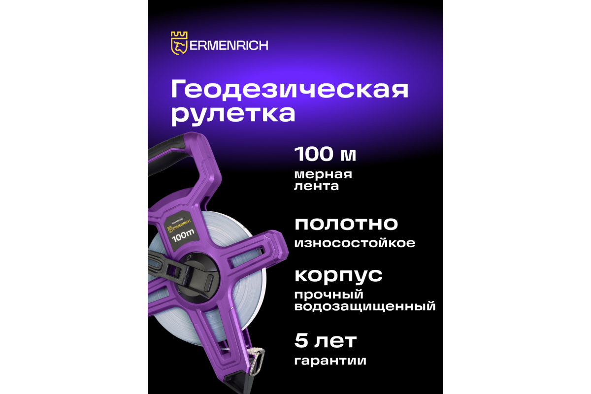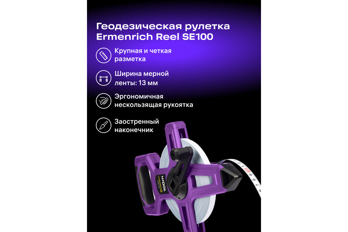 Если ранее вам не удавалось покрыть желаемое расстояние рулетками с полотном длиною в 30 и 50 метров, вашему выбору суждено лечь на профессиональный измерительный инструмент Ermenrich Reel SE100 – землемерную ленту с длиной полотна 100 метров. Она понравится мастерам-геодезистам, а также картографам, топографам и ландшафтным дизайнерам. Рулетке не страшны условия внешней среды: она обладает водозащищенностью и ударопрочностью. Заостренный наконечник корпуса позволяет фиксировать рулетку в почве.