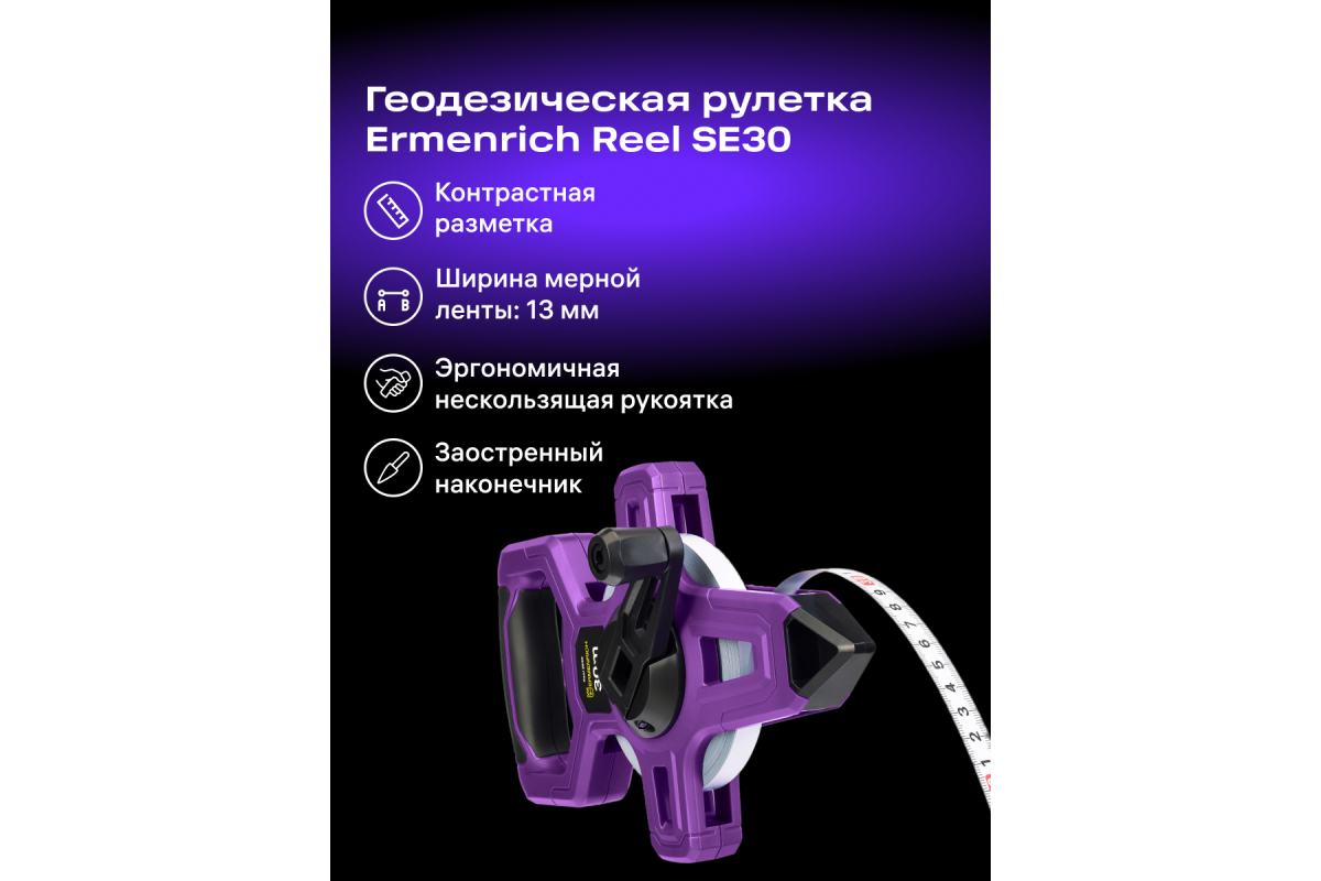 Первая модель из линейки землемерных мерных лент Ermenrich Reel SE, SE30 предоставляет пользователю полотно длиною в 30 метров для относительно длинномерных измерений. Подобные приборы используются большим числом профессионалов: будь то геодезист, картограф или ландшафтный дизайнер – для каждого этот инструмент окажется полезным. Внешний вид рулетки говорит сам за себя – она адаптирована для работы в полевых условиях: заостренный наконечник на корпусе предоставляет возможность зафиксировать рулетку в земле.