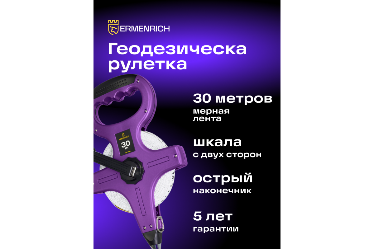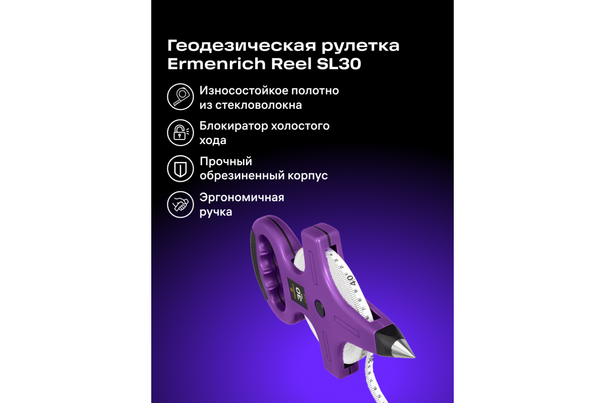 Землемерная (геодезическая) рулетка Ermenrich Reel SL30 может использоваться для любых измерений длины в пределах 30 метров. Это очень полезный инструмент при строительстве загородного дома, зонировании и межевании земельного участка, при выполнении картографических и топографических работ. Мерная лента помещена в ударопрочный корпус из ABS-пластика, который дополнен наконечником для закрепления в почве и эргономичной рукояткой с нескользящим покрытием.