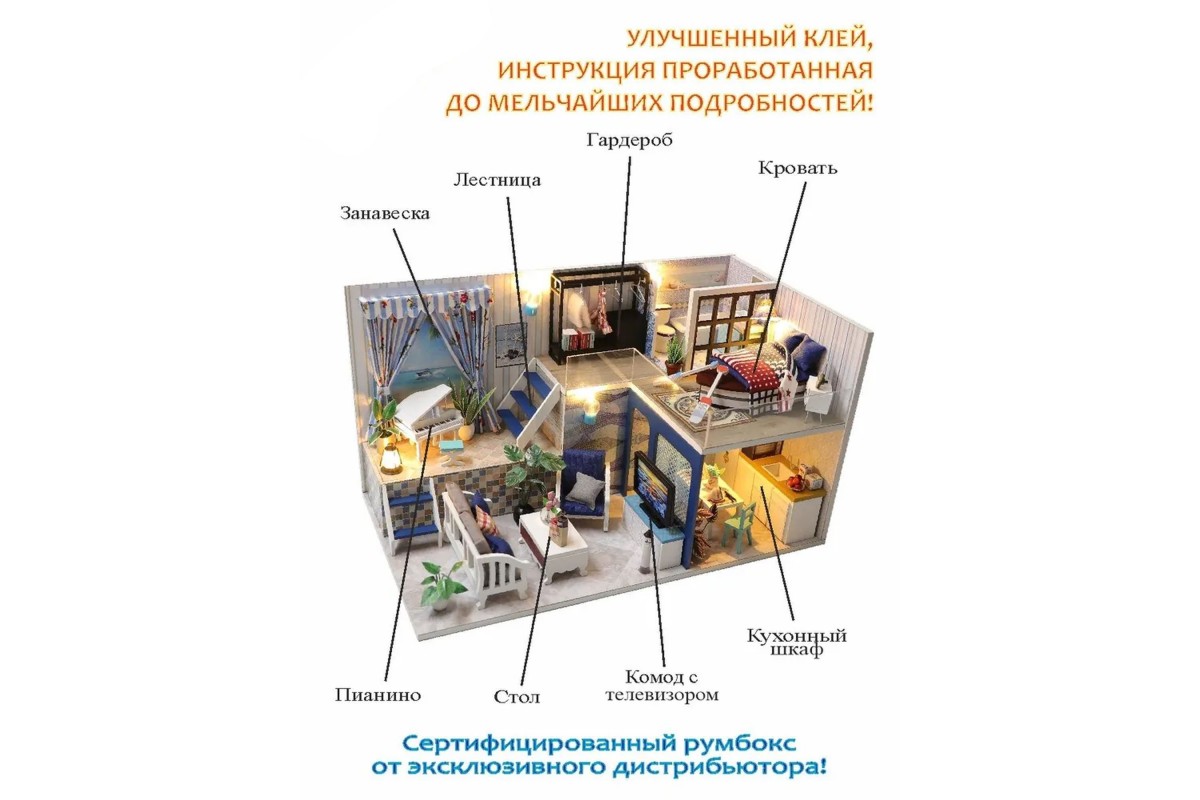 Румбокс - это готовый интерьерный конструктор (инструкция на русском языке!) для творчества от официального дистрибьютера HOBBY DAY. Внутри набора Вы найдете все необходимое, чтобы воссоздать собственными руками кукольный интерьер в миниатюре. Для Вашего удобства разработана новая пошаговая инструкция. Во всех наборах новый усиленный клей без запаха. Светодиодная подсветка. Все детали выполнены из безопасных материалов и необыкновенно реалистичны. Это занимательное увлечение способствует развитию творческих способностей, усидчивости, совместному времяпрепровождению детей и их родителей. Набор подходит для детей в возрасте от 10 до 14 лет, для детей более младшего возраста возможно понадобится помощь взрослого человека. Собранная модель может стать домиком для куколок 5-7 см, необычным предметом интерьера или ночником.