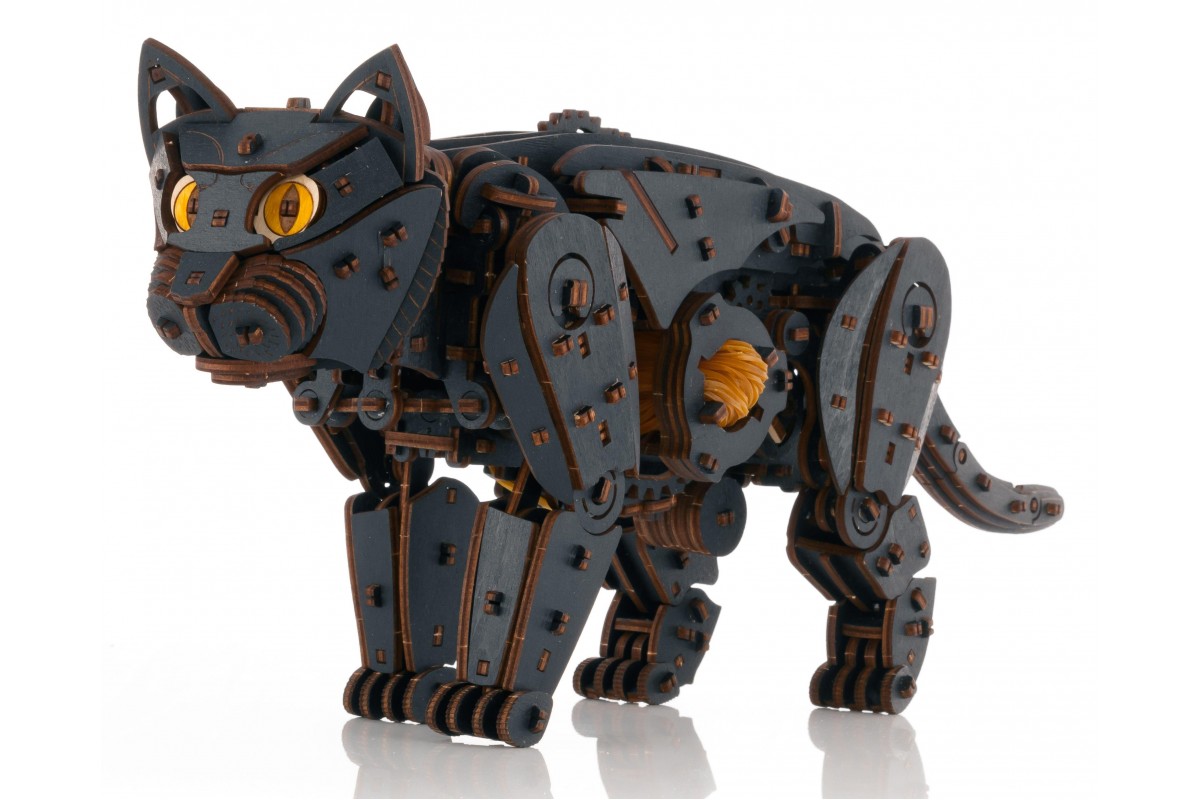Модель из экологически чистых материалов, предназначенная для самостоятельной сборки и имеющая механизм, приводящий в движение. У механизма есть ручная заводка и возможность запускать и останавливать Кота. Конструкция деревянной модели позволяет ей двигаться максимально реалистично: во время движения Кот мило перебирает ножками, машет хвостом, чем вызывает бурю положительных эмоций у детей и взрослых. Это идеальная игрушка, замечательный подарок и достойный предмет коллекционирования для дома и офиса.