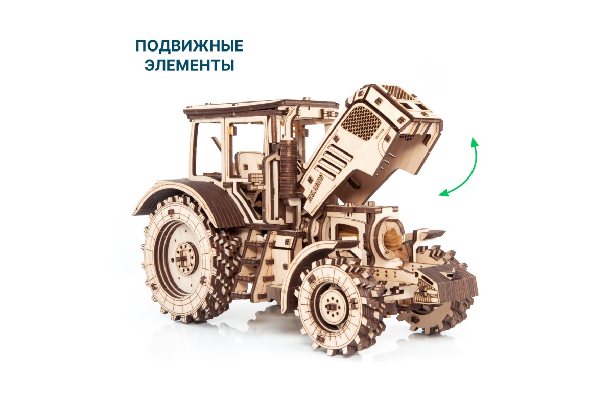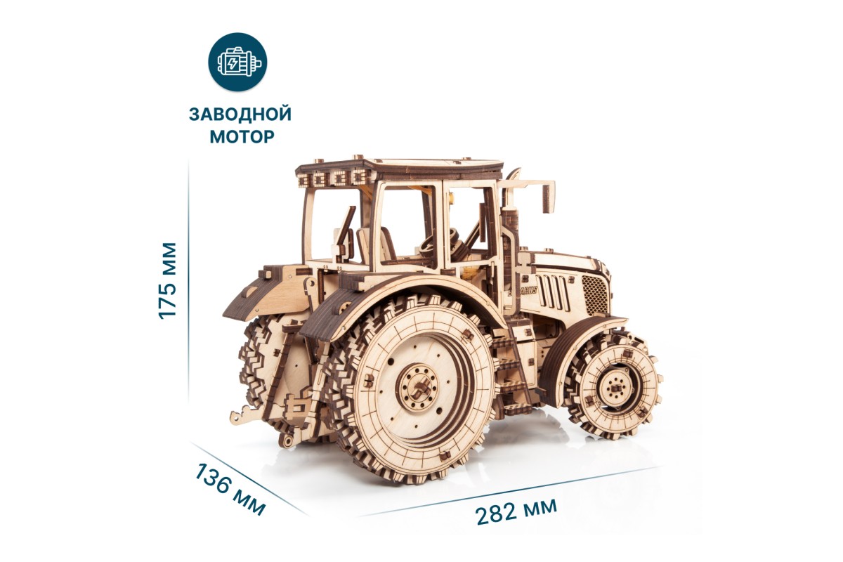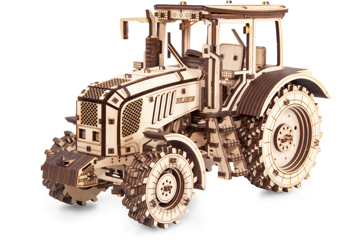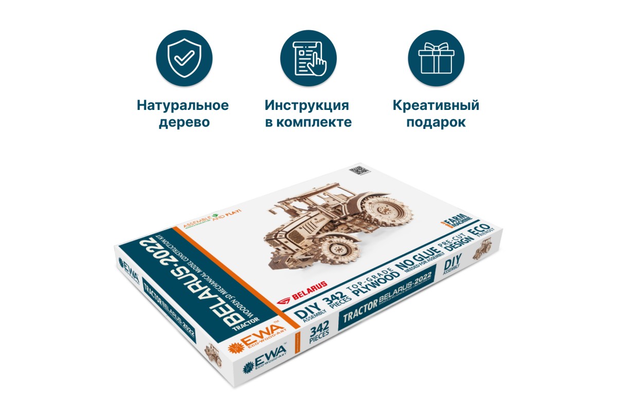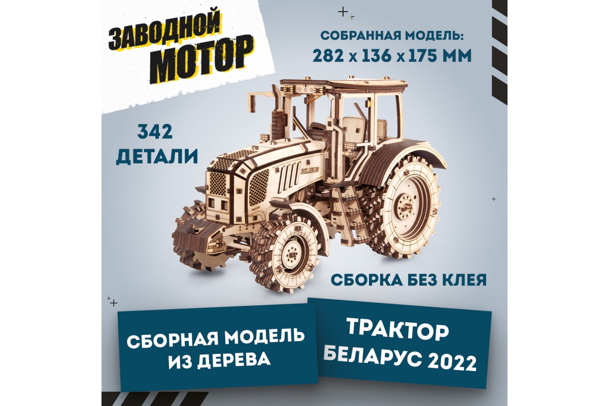 Механическая деревянная сборная модель Eco Wood Art (EWA) Трактор БЕЛАРУС-2022 создан совместно с Минским Тракторным Заводом (МТЗ), официально лицензирован и является полной копией реального трактора. Незабываемый аромат березовой фанеры, душевный настрой и легкая музыка на фоне поможет вам погрузиться в белорусскую глубинку и представить, как трактор вышел на посевную и бороздит бескрайние поля и луга.