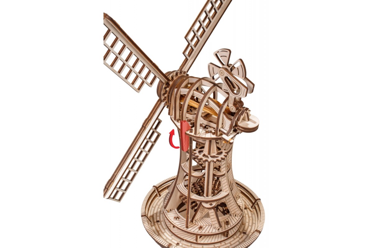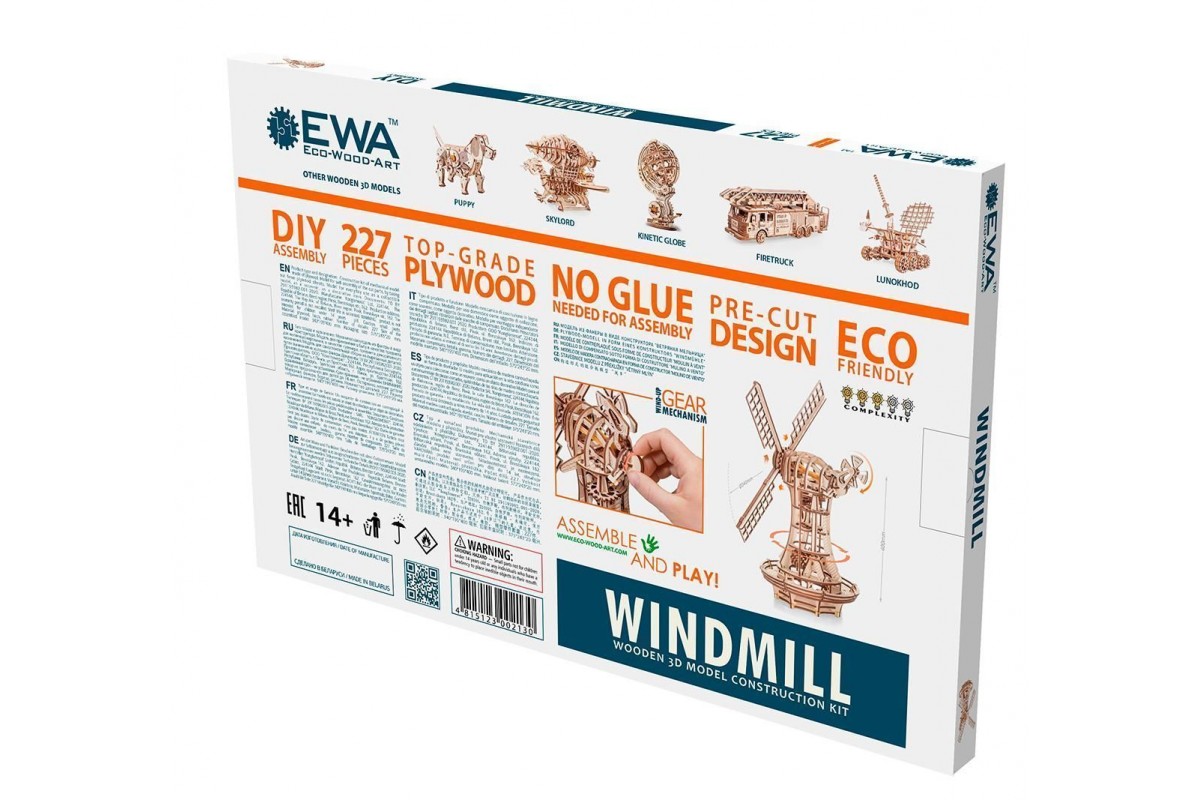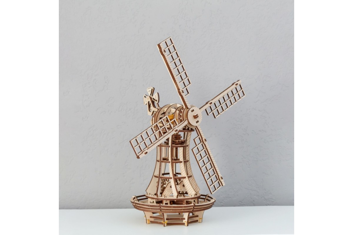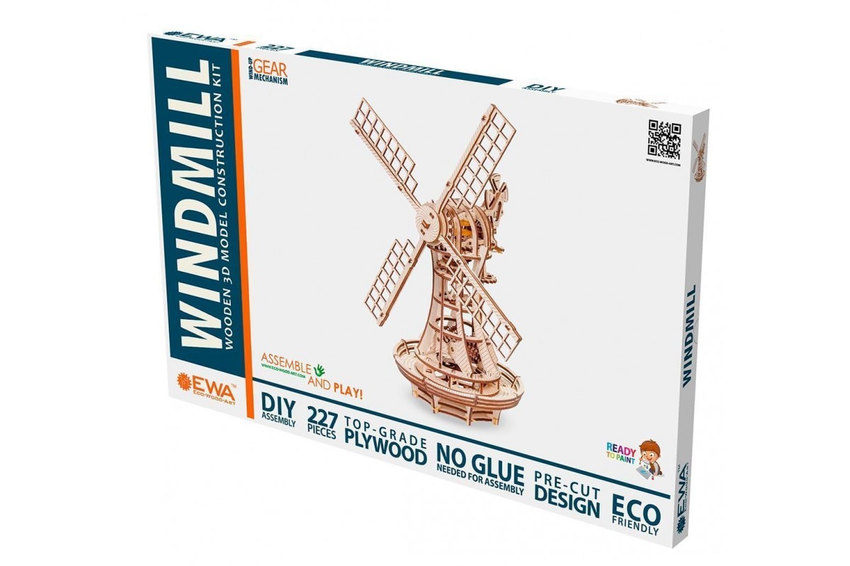 Сборная модель, механический деревянный конструктор Ветряная мельница от EWA Eco Wood Art. Модель имеет заводной механизм поворота парусов на резинке и механизм открывания в башне.