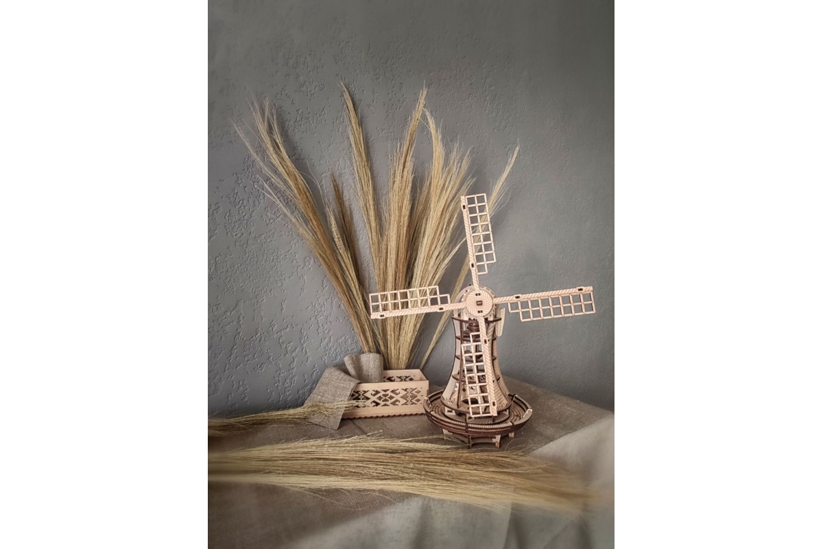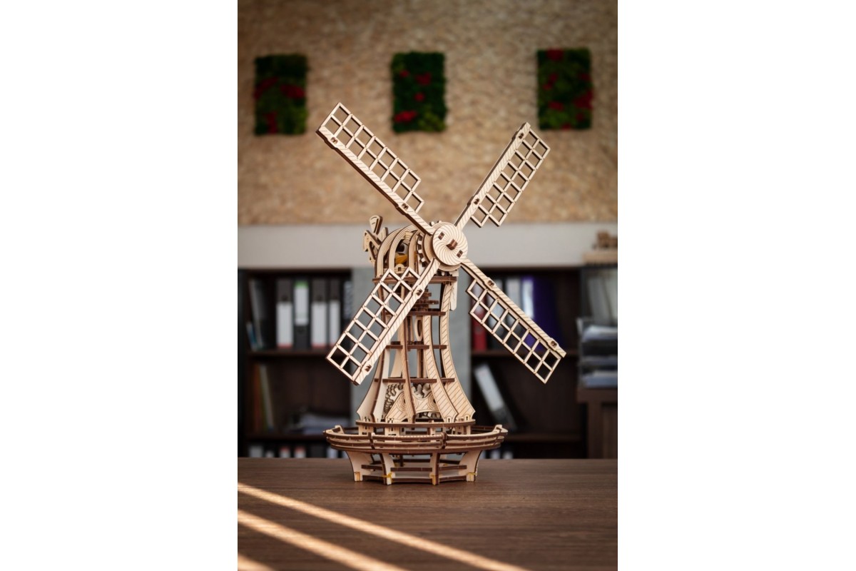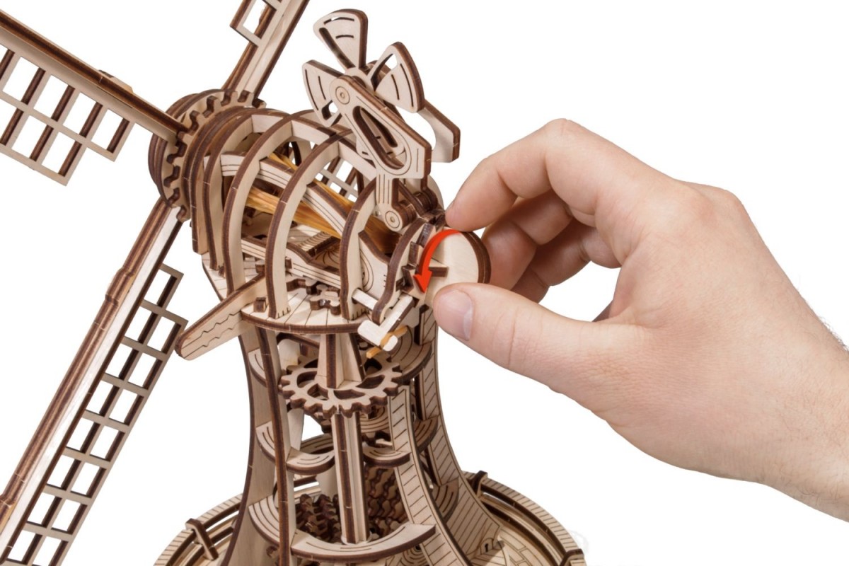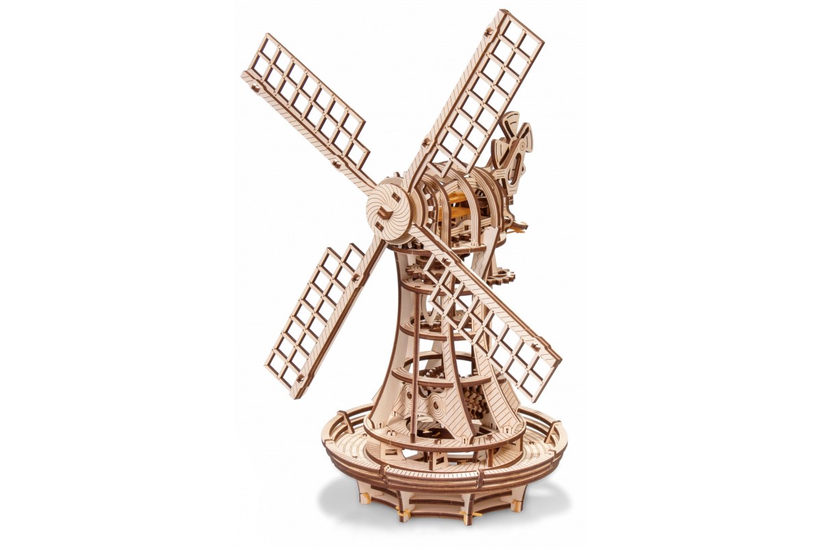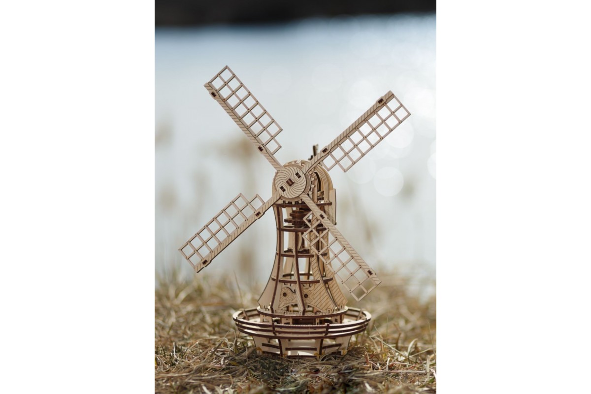Сборная модель, механический деревянный конструктор Ветряная мельница от EWA Eco Wood Art. Модель имеет заводной механизм поворота парусов на резинке и механизм открывания в башне.