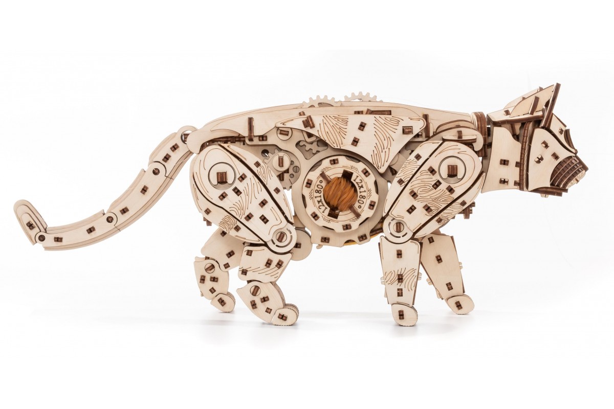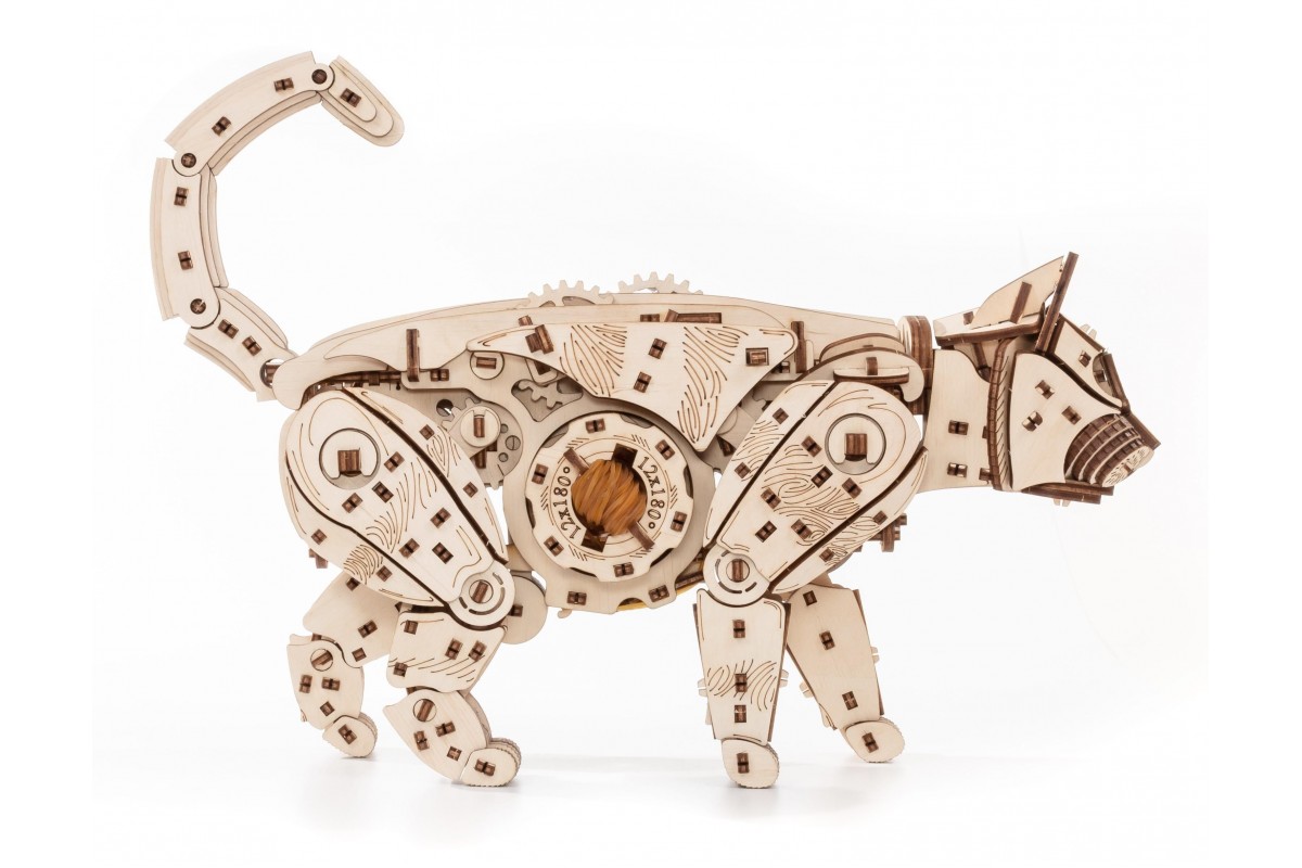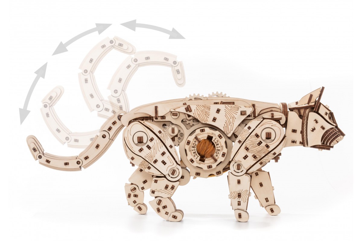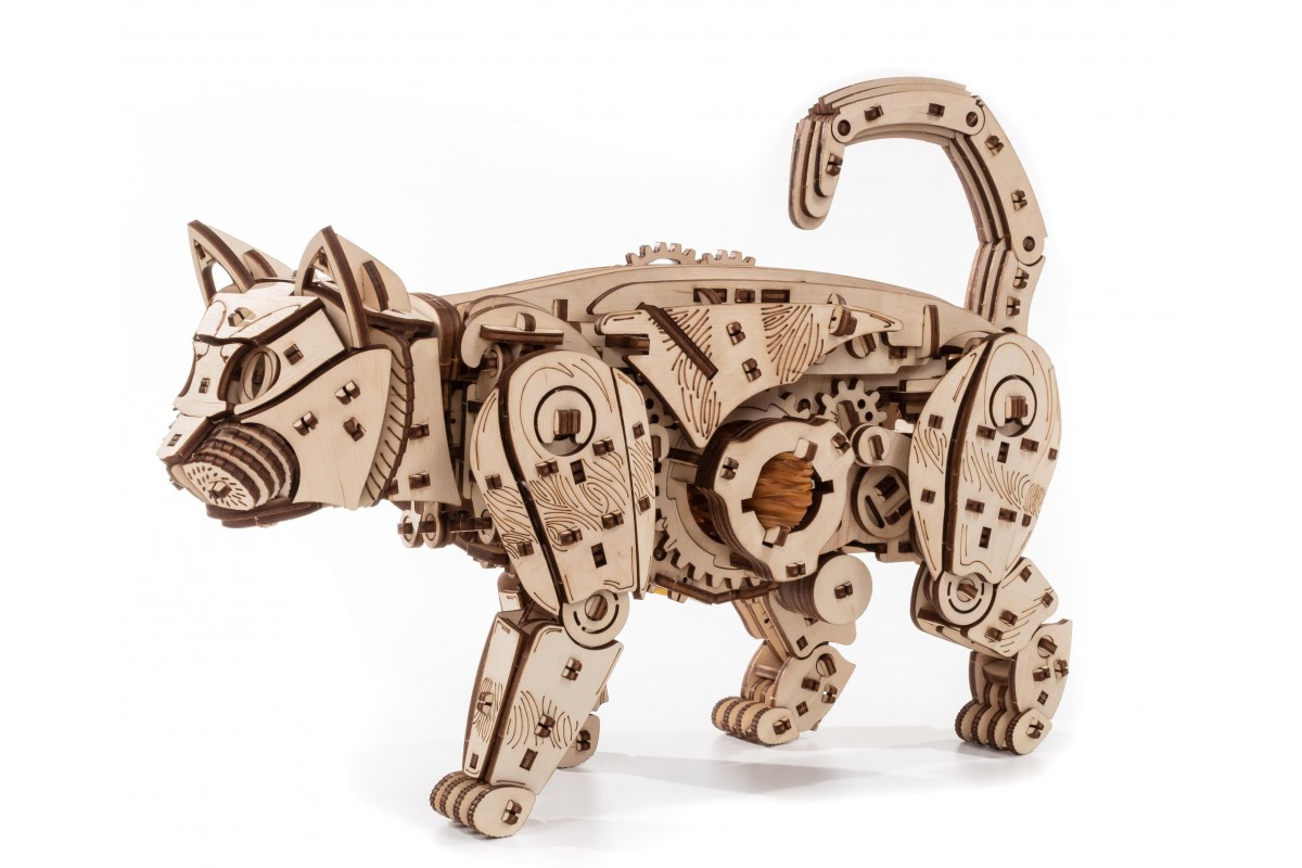 Модель из экологически чистых материалов, предназначенная для самостоятельной сборки и имеющая механизм, приводящий в движение. У механизма есть ручная заводка и возможность запускать и останавливать Кота. Конструкция деревянной модели позволяет ей двигаться максимально реалистично: во время движения Кот мило перебирает ножками, машет хвостом, чем вызывает бурю положительных эмоций у детей и взрослых. Это идеальная игрушка, замечательный подарок и достойный предмет коллекционирования для дома и офиса.