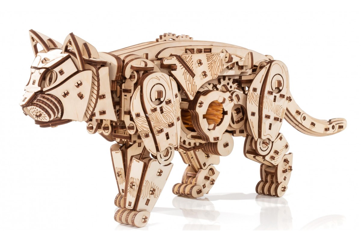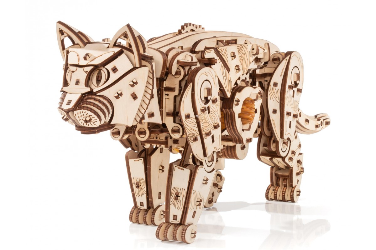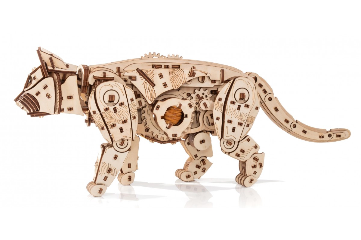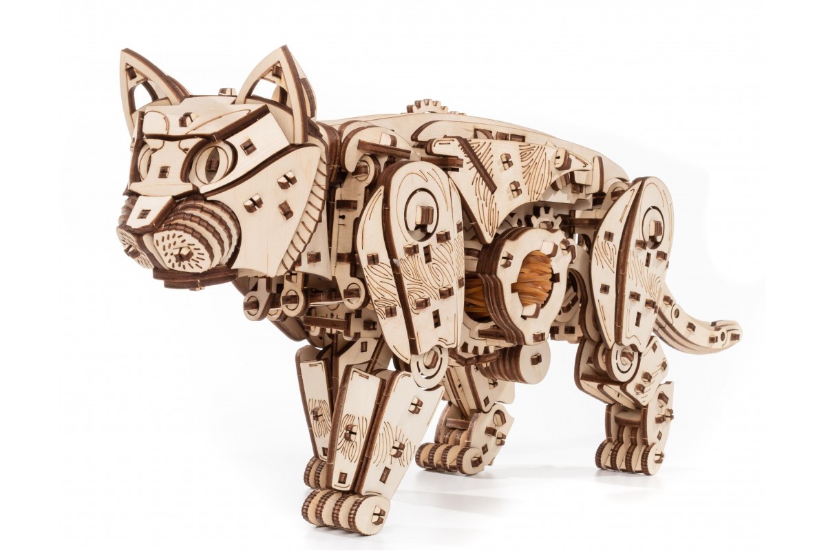 Модель из экологически чистых материалов, предназначенная для самостоятельной сборки и имеющая механизм, приводящий в движение. У механизма есть ручная заводка и возможность запускать и останавливать Кота. Конструкция деревянной модели позволяет ей двигаться максимально реалистично: во время движения Кот мило перебирает ножками, машет хвостом, чем вызывает бурю положительных эмоций у детей и взрослых. Это идеальная игрушка, замечательный подарок и достойный предмет коллекционирования для дома и офиса.