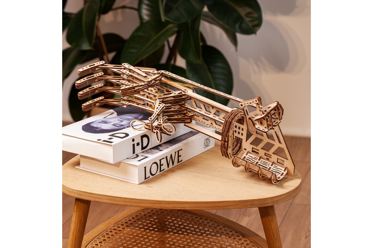 Модель из дерева позволяет захватывать и переносить небольшие предметы. Вы даже можете разыграть друзей: представьте, что со спины им на плечо ляжет огромная тяжелая ладонь! То-то они испугаются! Только вашей фантазии решать, какие применения вы придумаете собранному конструктору.