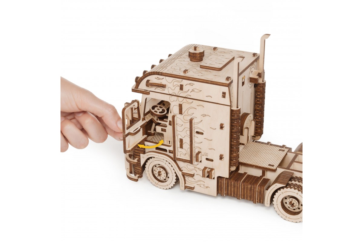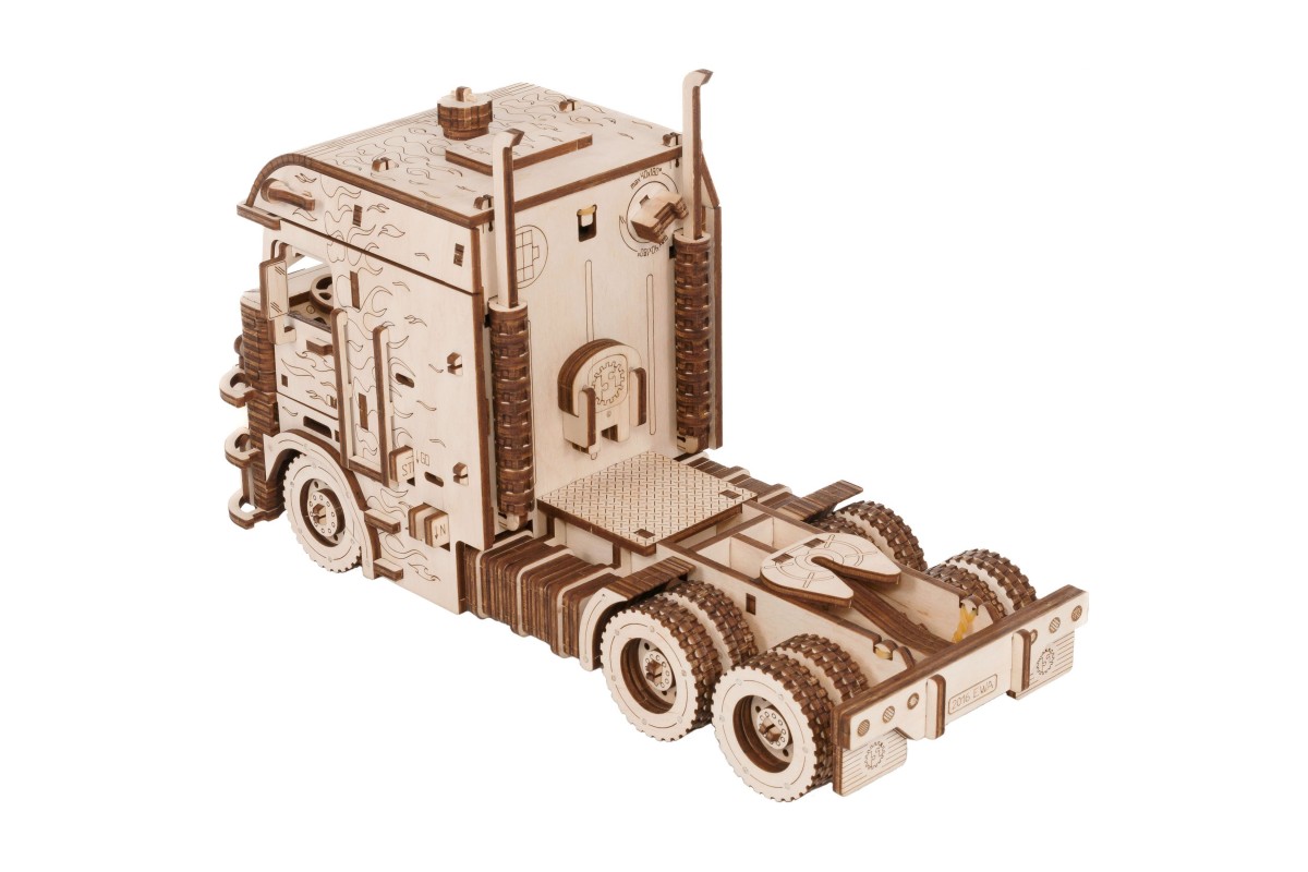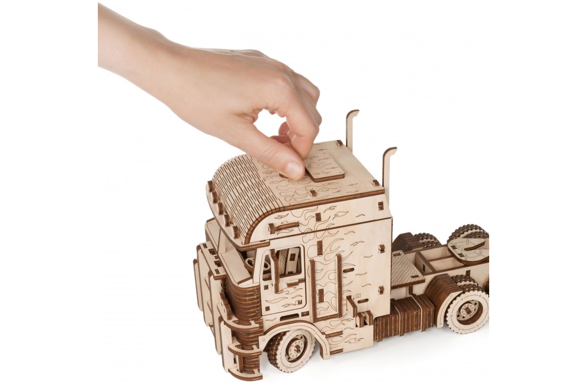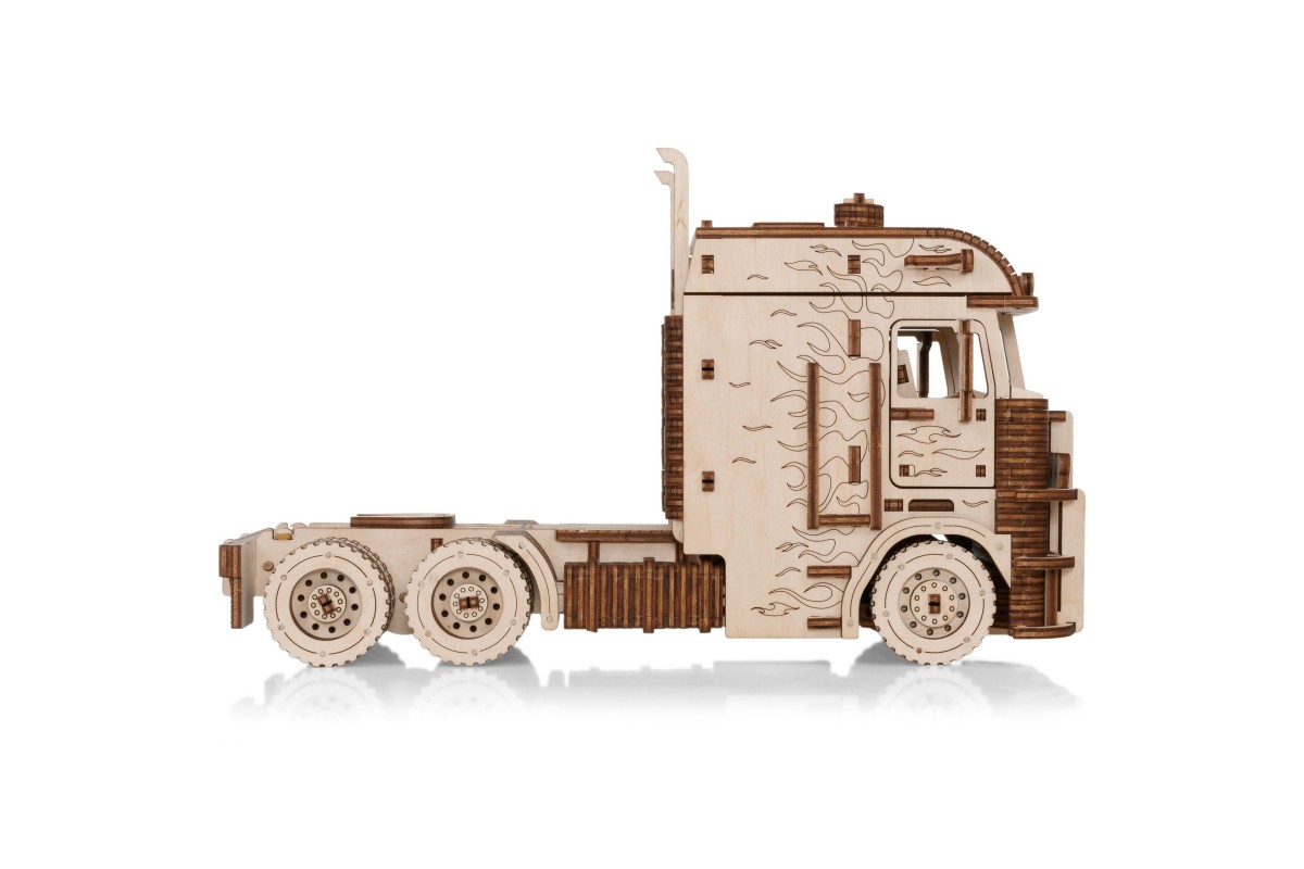 Сборная модель из дерева EWA Грузовой тягач Король дорог – это уникальный деревянный конструктор, который не оставит равнодушным не только детей, но и взрослых. Сборная модель грузовика состоит из 478 деталей, которые вы легко соберёте в реалистичную копию, благодаря подробной иллюстрированной инструкции в комплекте. Модель автомобиля после сборки заводится с помощью резиномотора и едет.