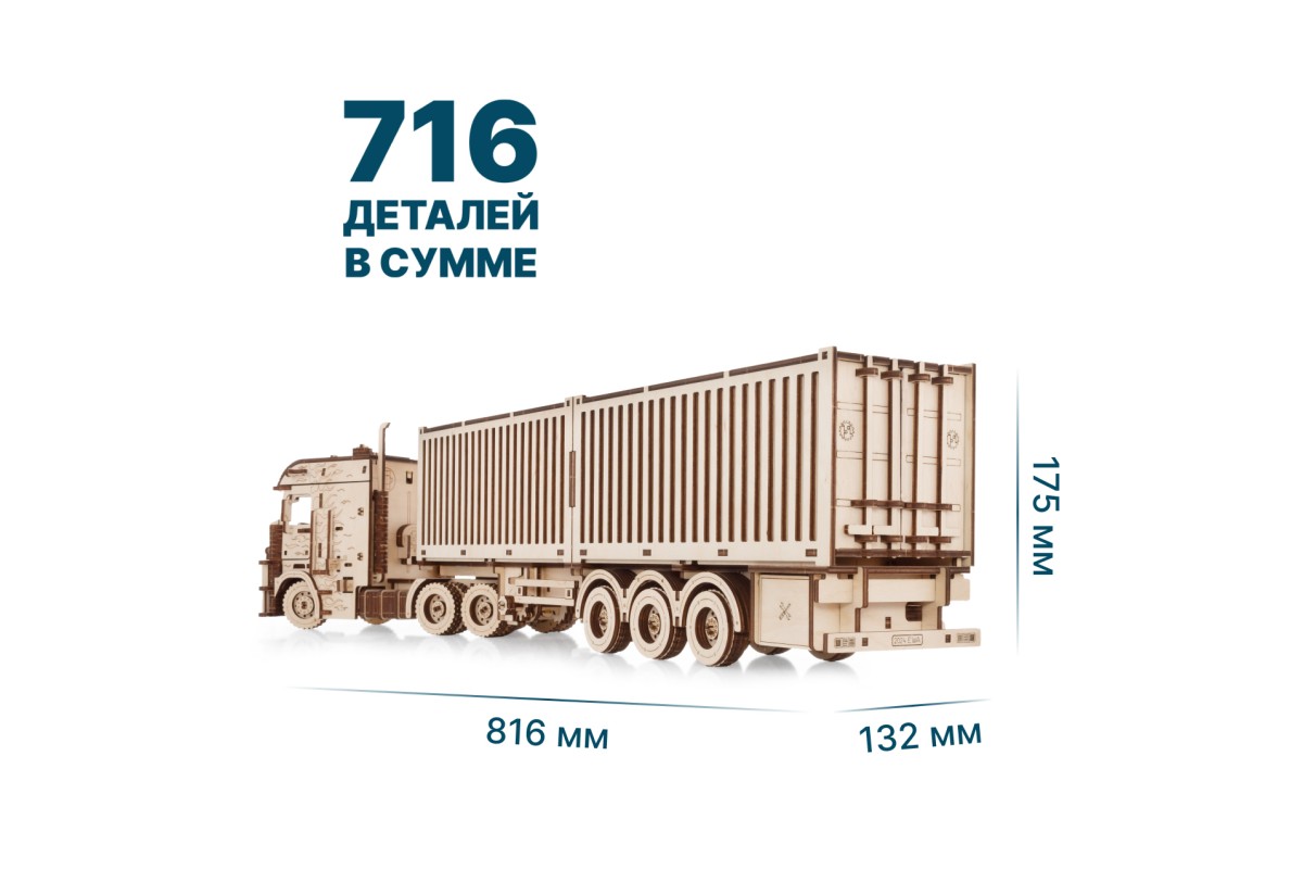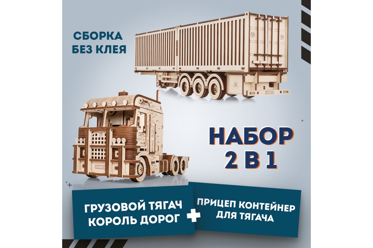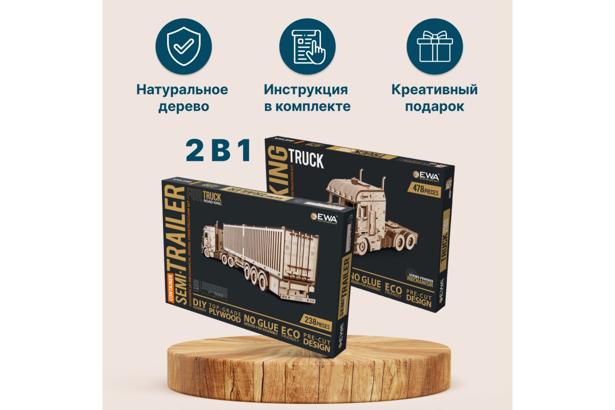 Сборная модель из дерева EWA Грузовой тягач Король дорог + Прицеп Контейнер для тягача - это сразу два набора конструктора в одном.