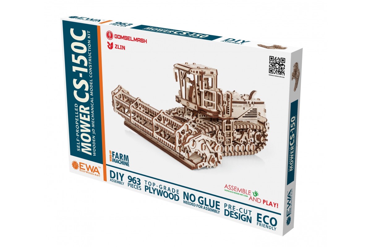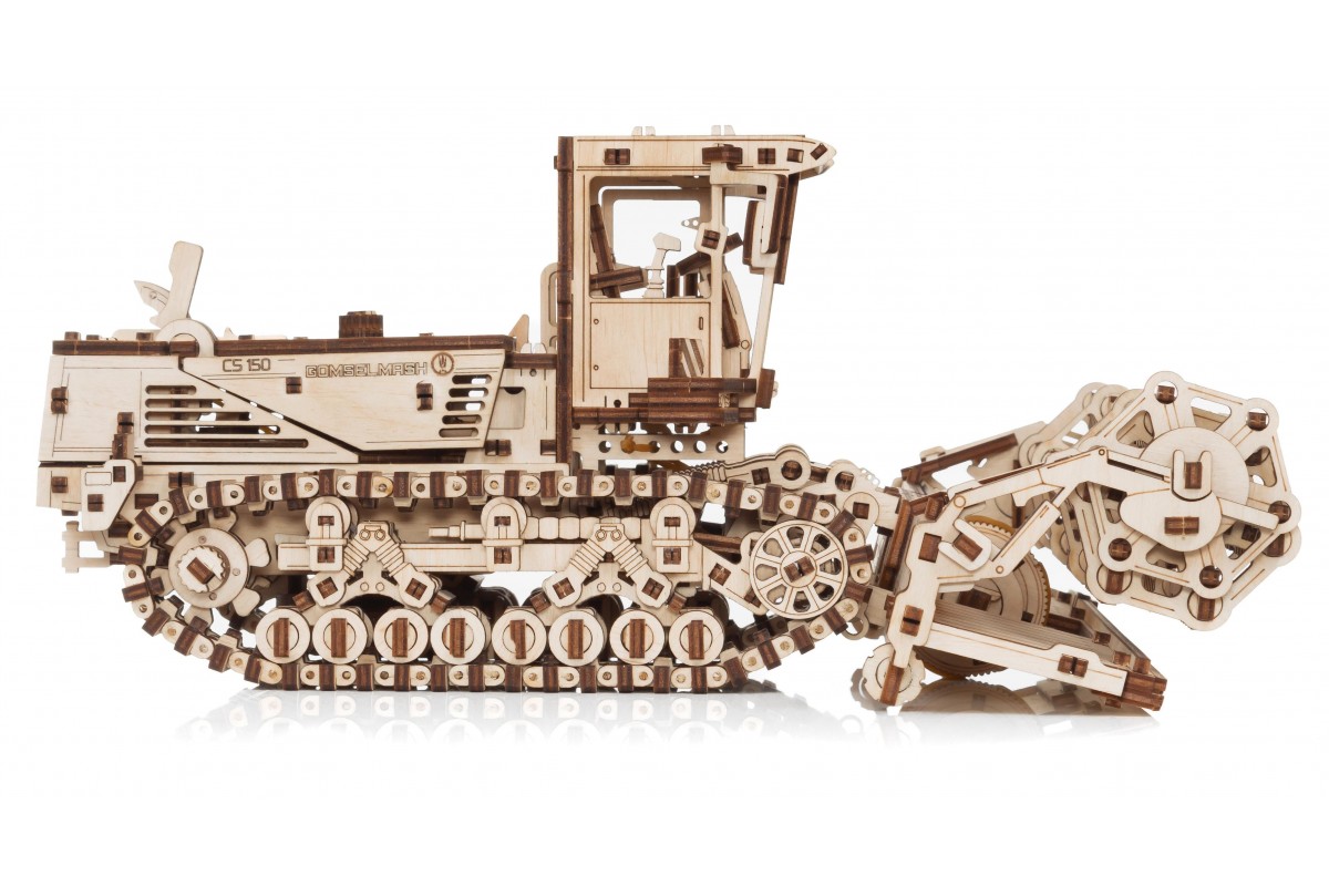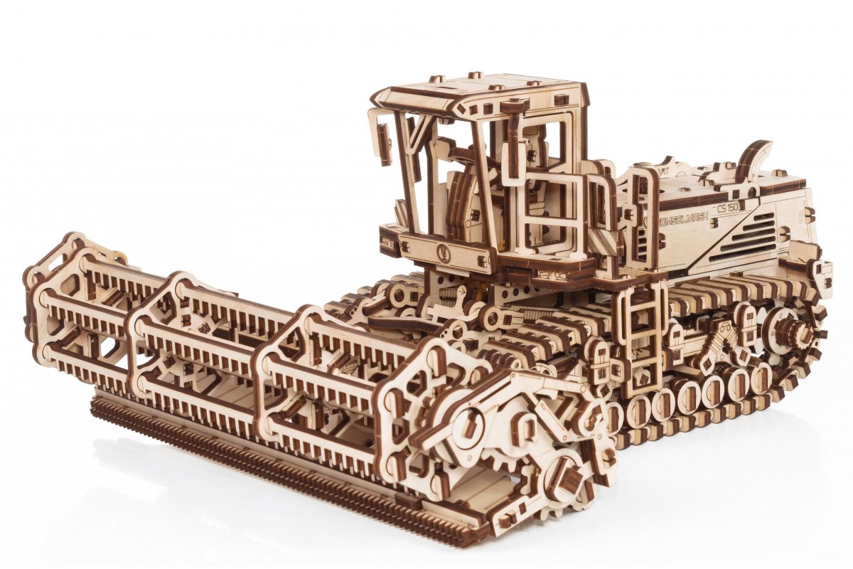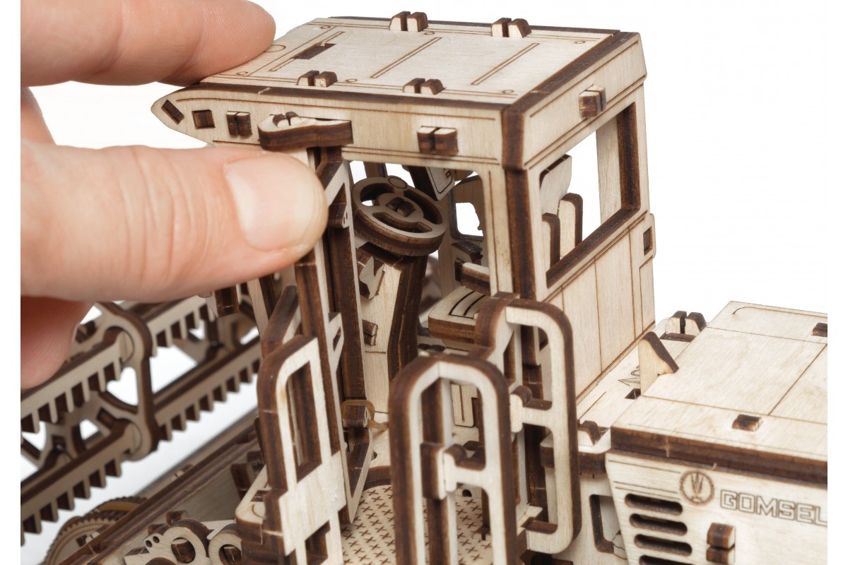 Сборная модель из дерева Косилки самоходной, еще ее можно назвать Комбайн. Модель механическая с заводным мотором на гусеницах, которая может двигаться по полу. Деревянный конструктор для сборки изготовлен в сотрудничестве с белорусскими машиностроительными заводами "Гомсельмаш" и "Злин".