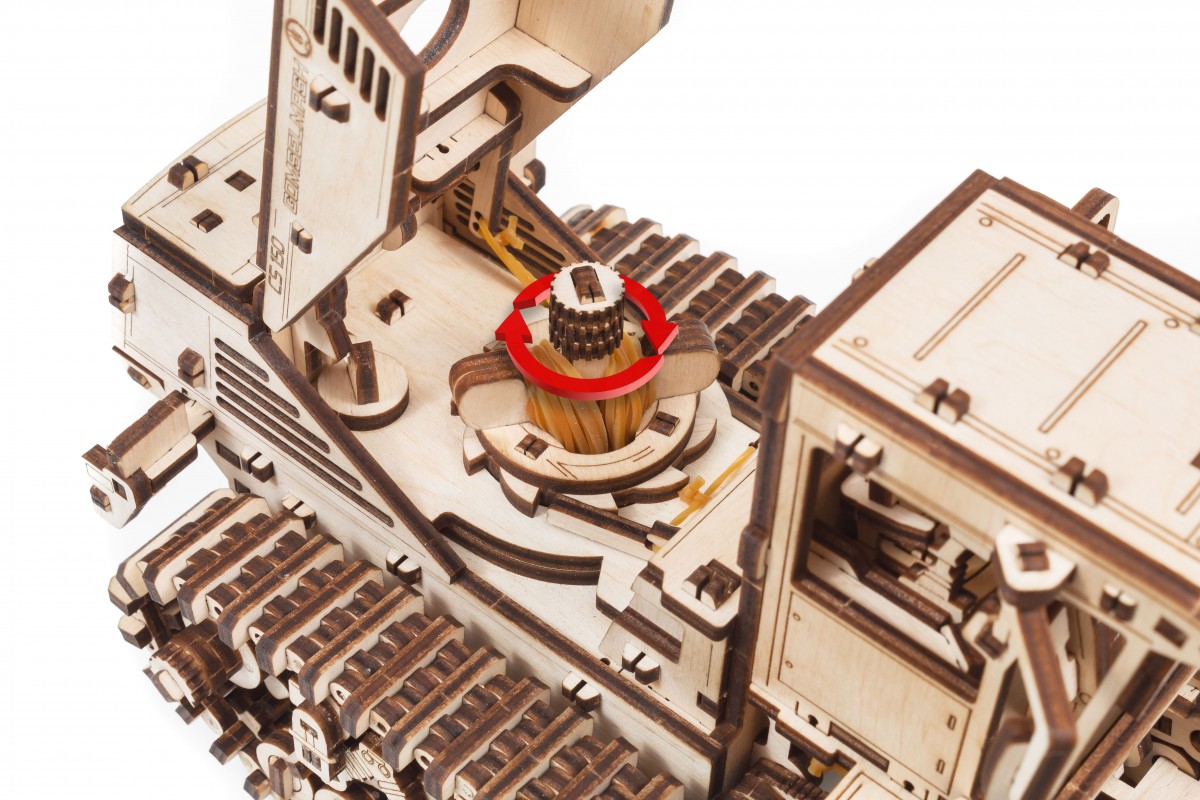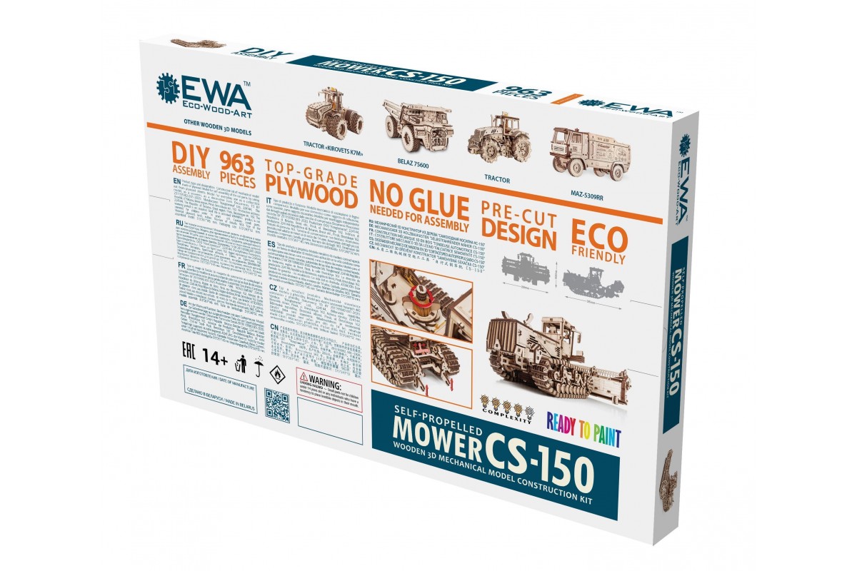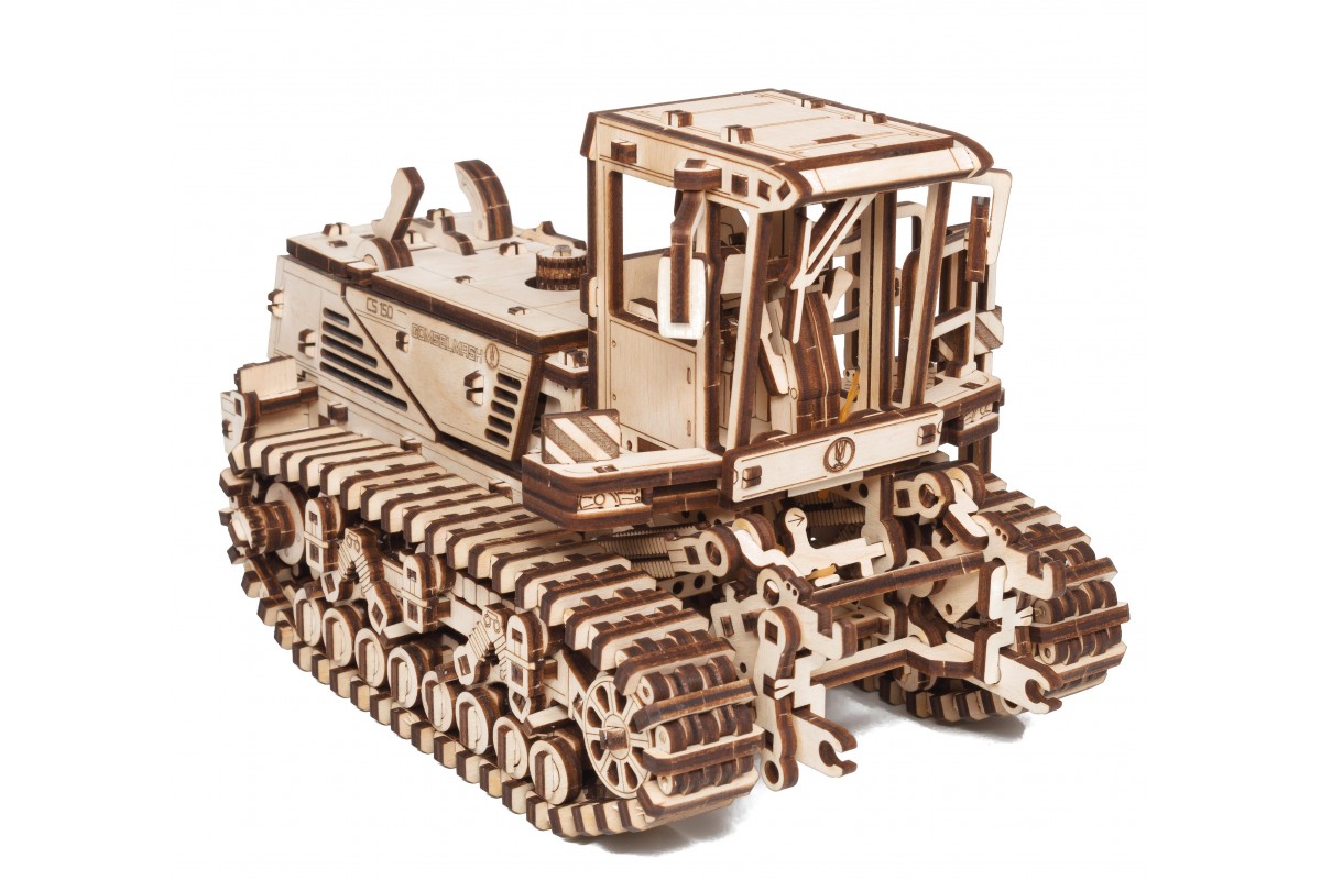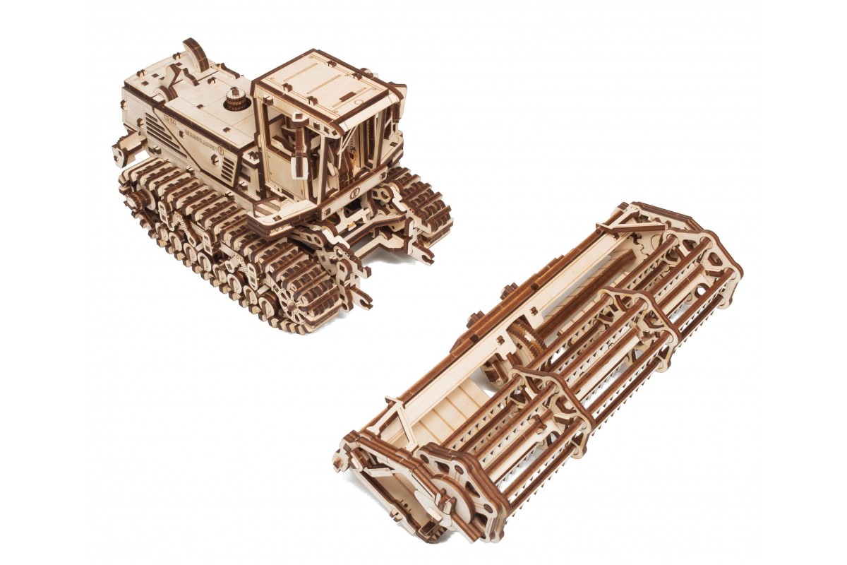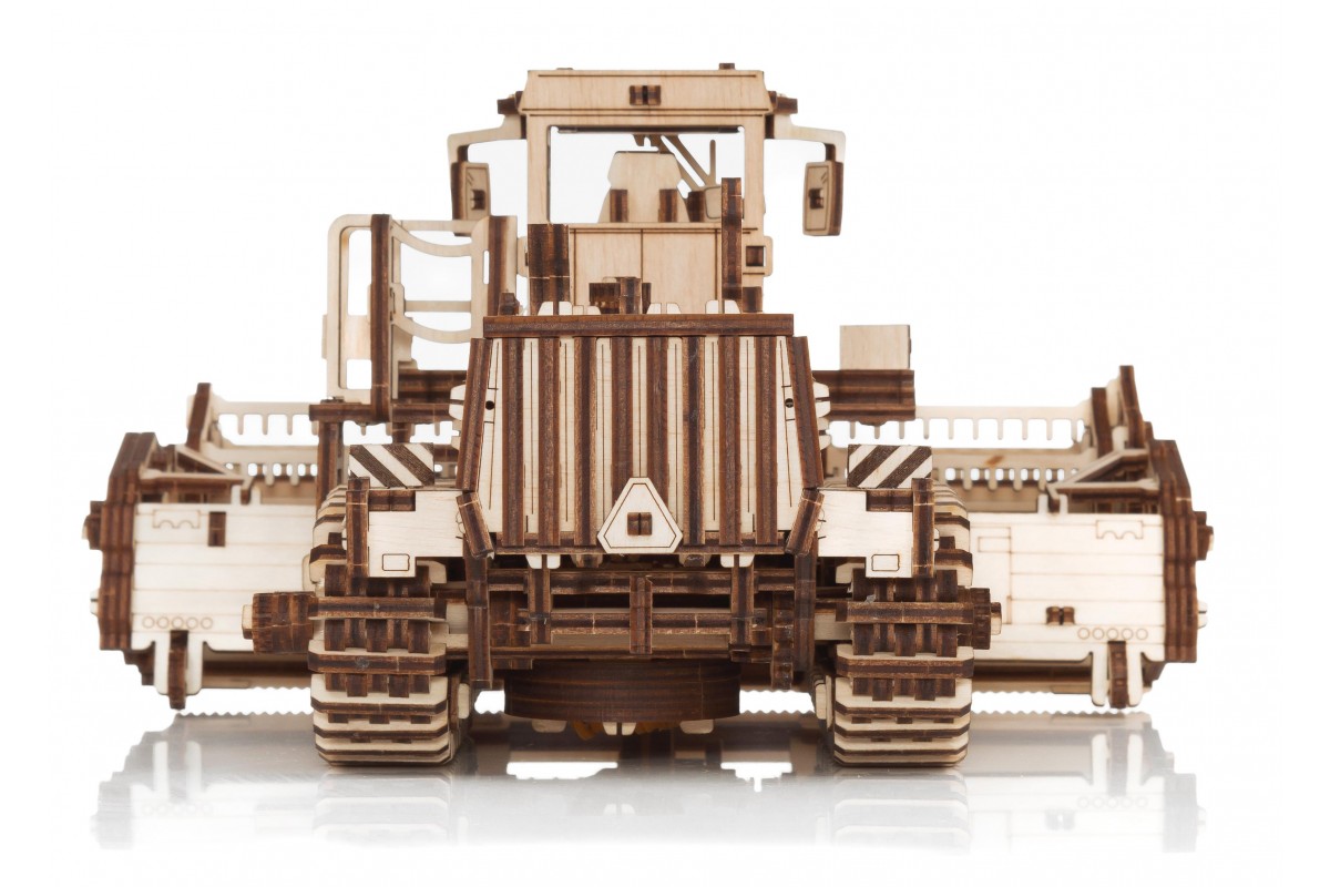 Сборная модель из дерева Косилки самоходной, еще ее можно назвать Комбайн. Модель механическая с заводным мотором на гусеницах, которая может двигаться по полу. Деревянный конструктор для сборки изготовлен в сотрудничестве с белорусскими машиностроительными заводами "Гомсельмаш" и "Злин".