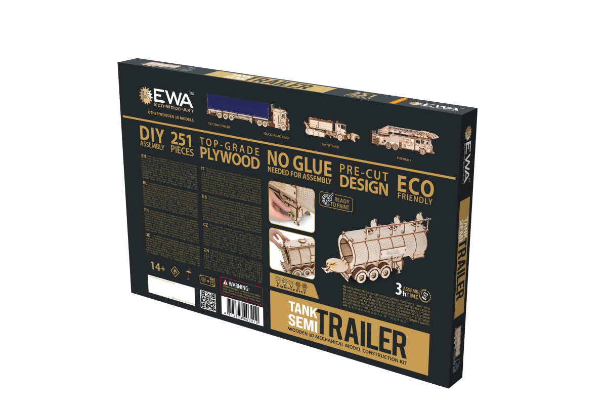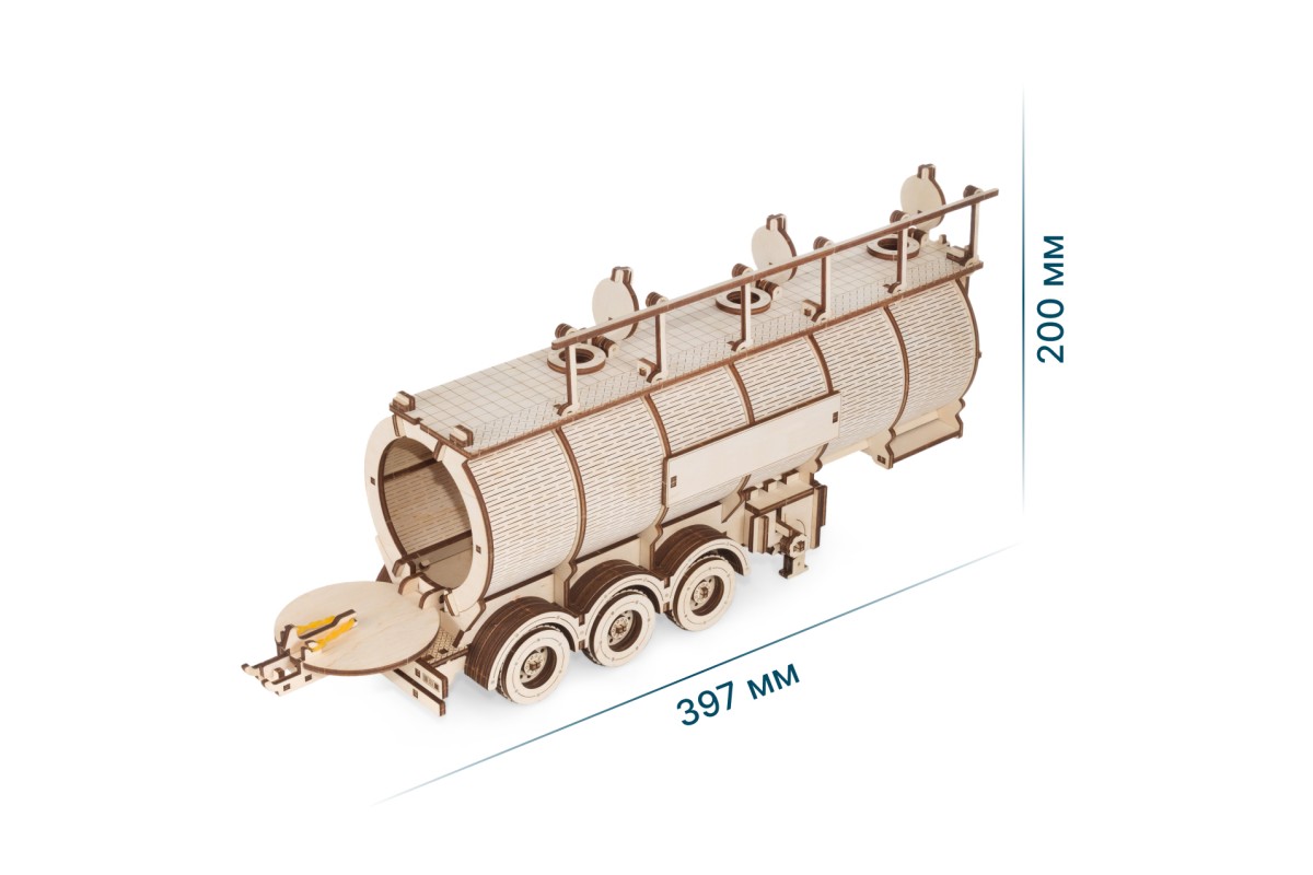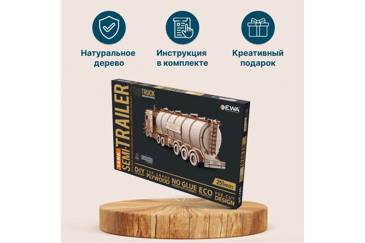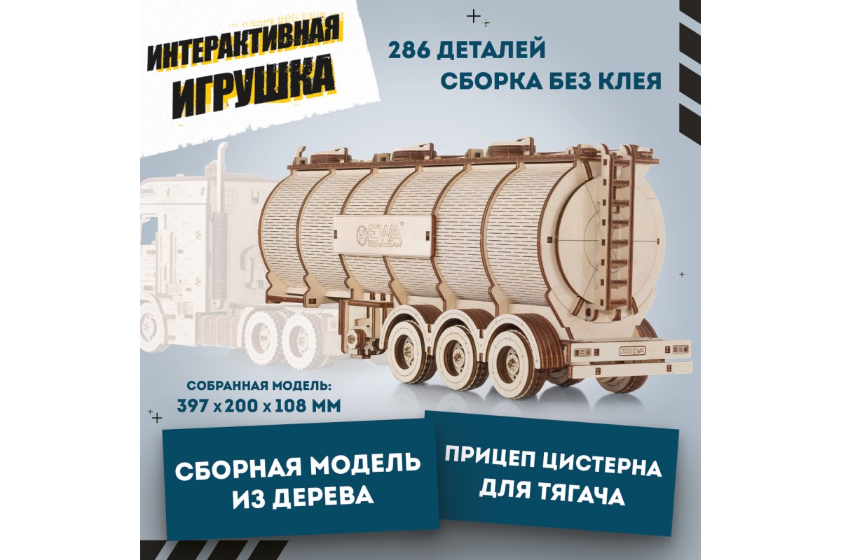 Сборная модель из дерева EWA Прицеп Цистерна для тягача - это прекрасное дополнение к сборной модели из дерева EWA Грузовой тягач Король дорог. Деревянный конструктор состоит из 286 деталей, которые вы легко соберёте в реалистичную копию, благодаря подробной иллюстрированной инструкции в комплекте.