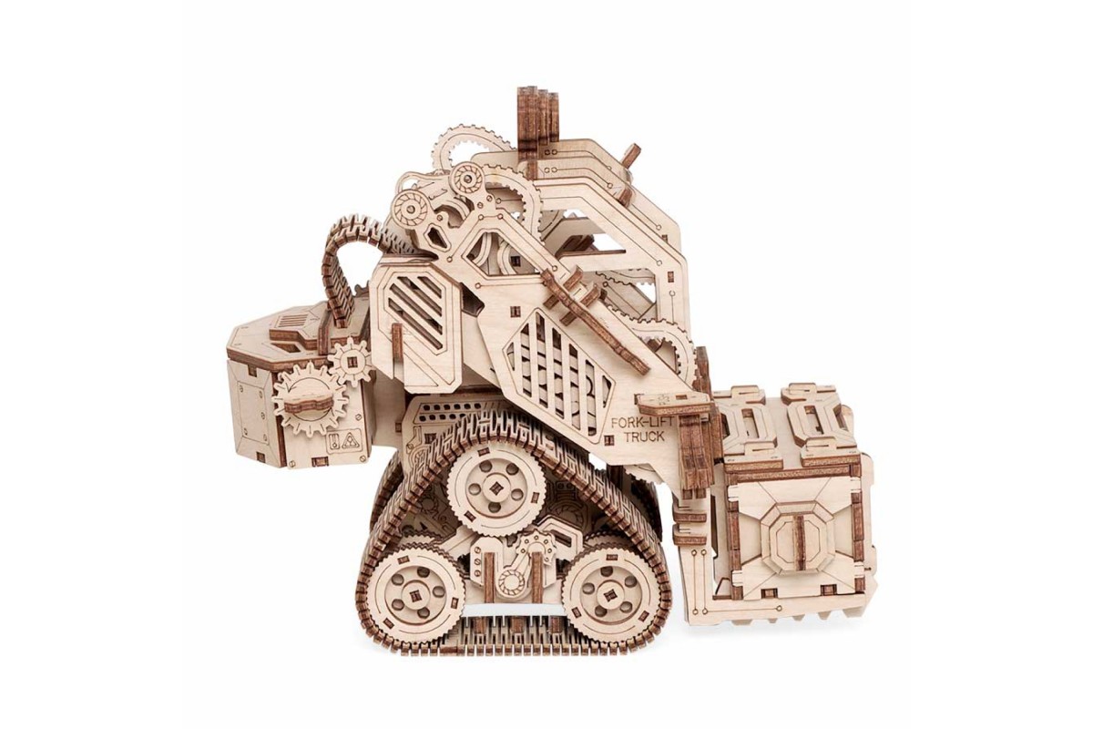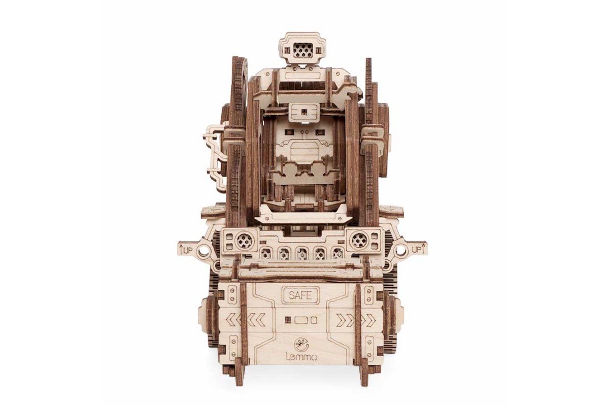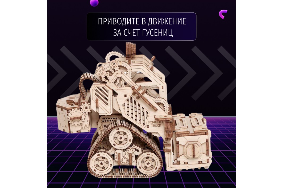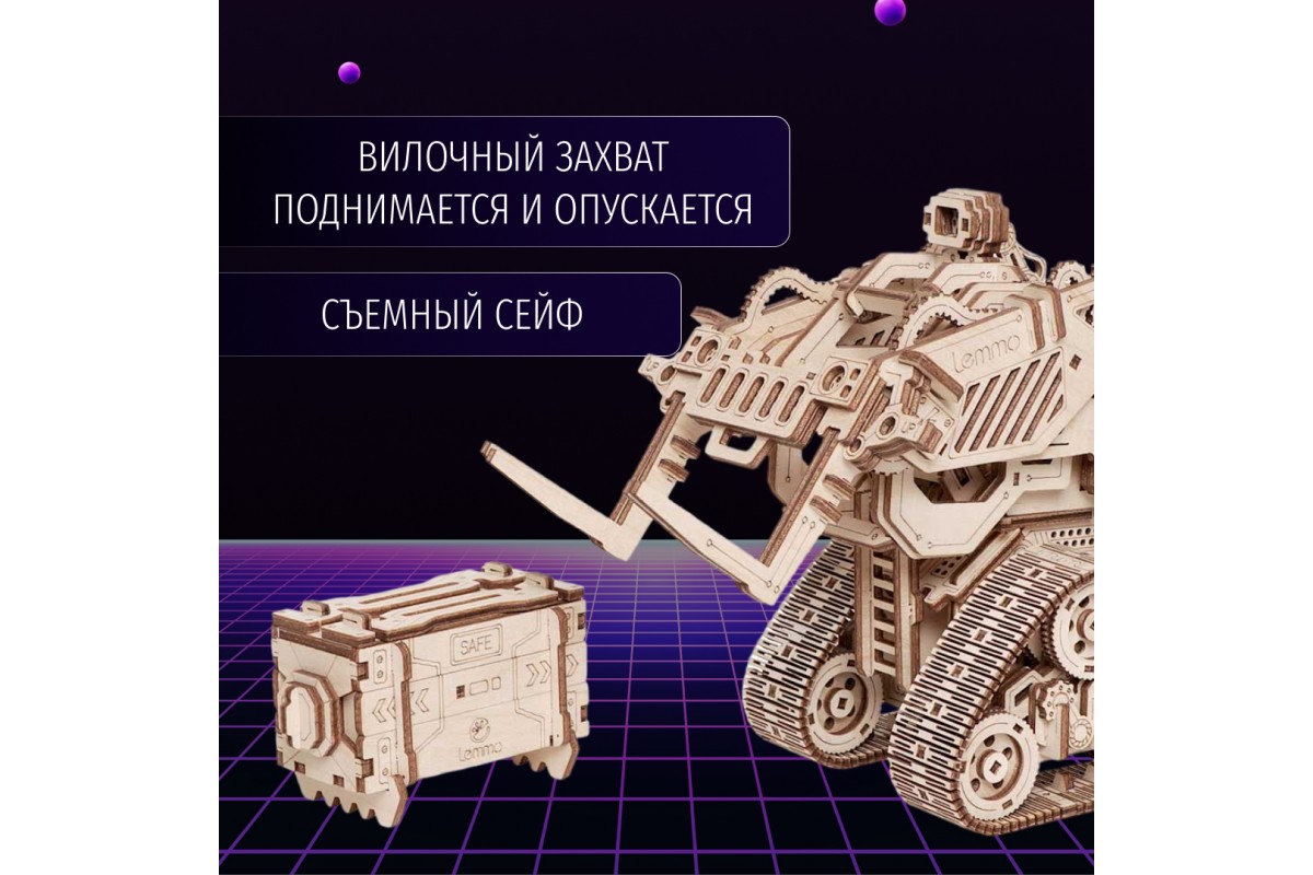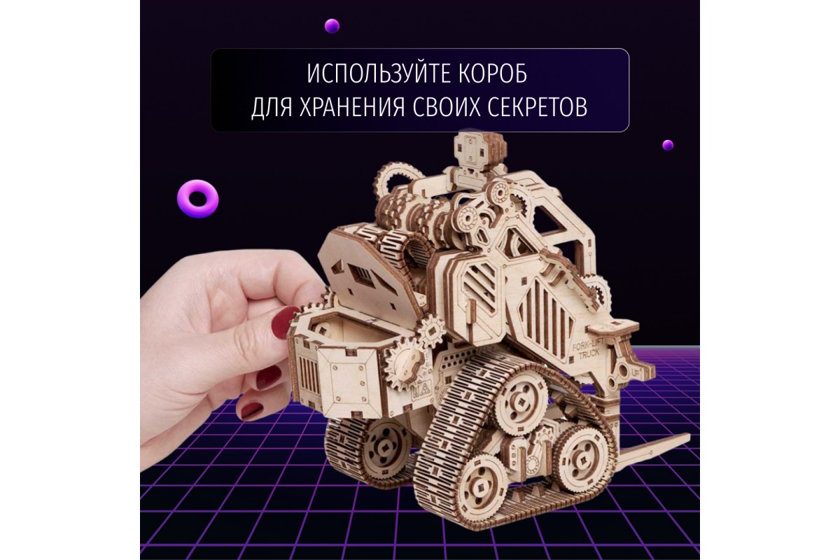 Собирайте вместе с детьми деревянный конструктор с потрясающей детализацией и играйте со множеством подвижных деталей, ведь он как терминатор. У собранной модели вращаются гусеницы, открывается крышка короба и кабина водителя, поднимается и опускается вилочный захват. Сейф-головоломка открывается путём определенной последовательности.