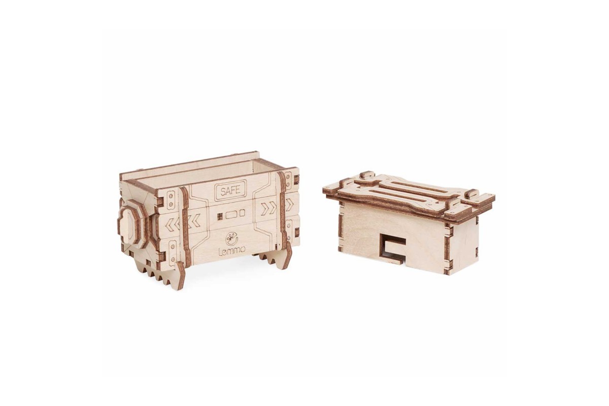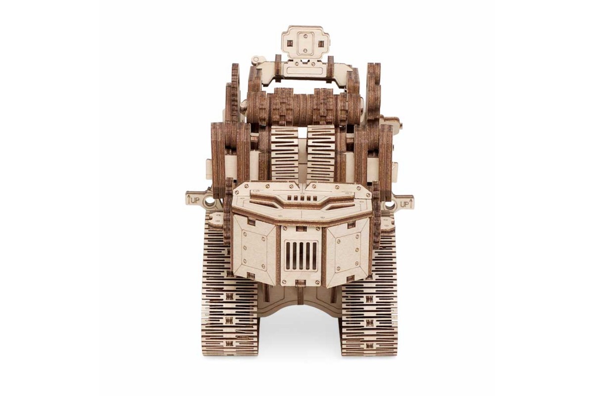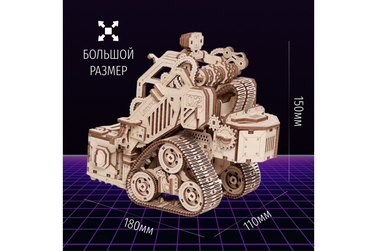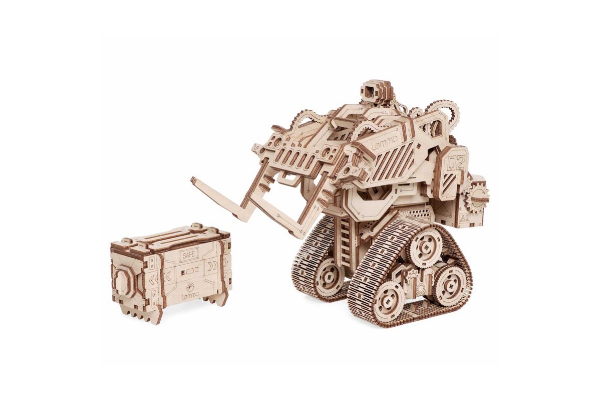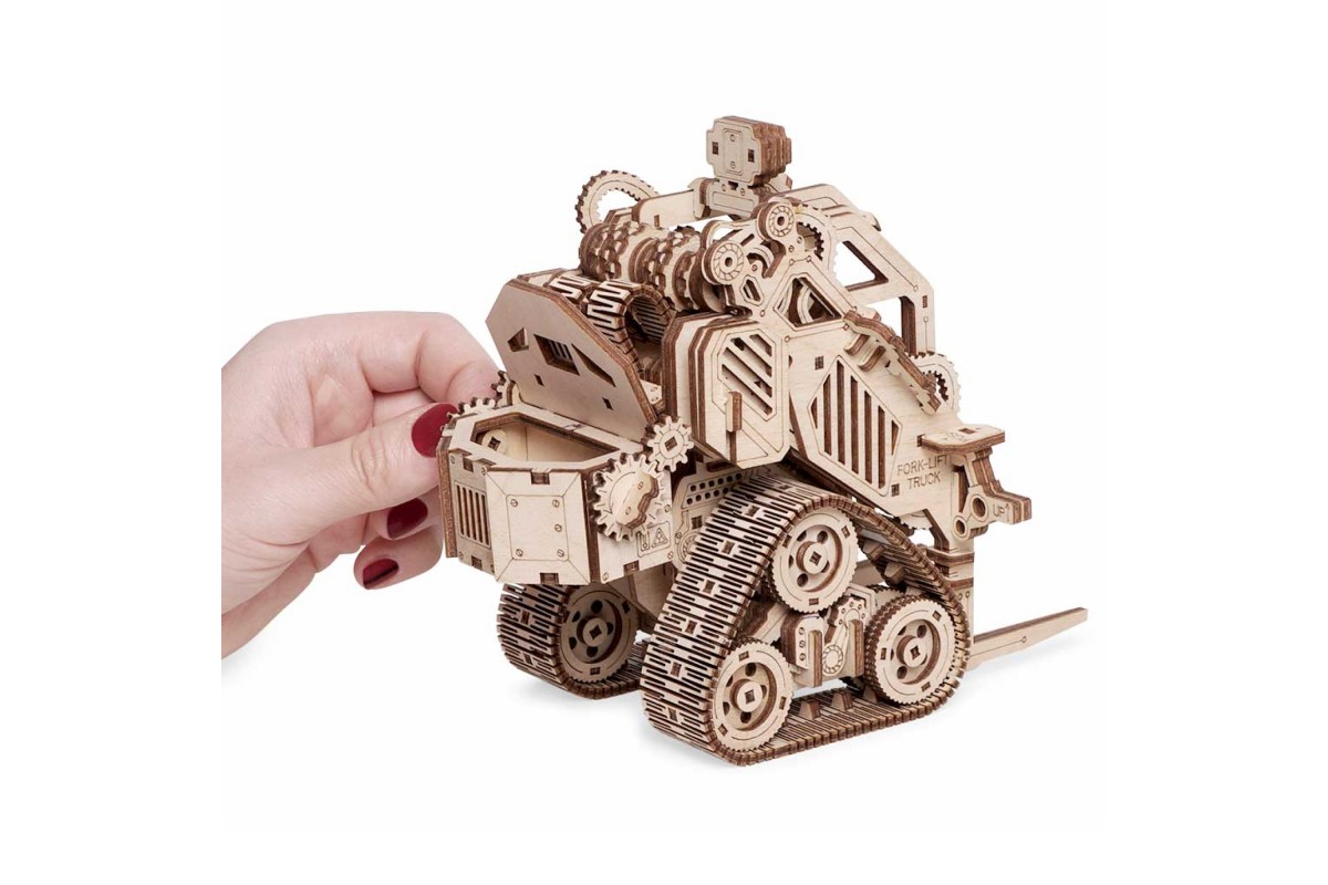 Собирайте вместе с детьми деревянный конструктор с потрясающей детализацией и играйте со множеством подвижных деталей, ведь он как терминатор. У собранной модели вращаются гусеницы, открывается крышка короба и кабина водителя, поднимается и опускается вилочный захват. Сейф-головоломка открывается путём определенной последовательности.