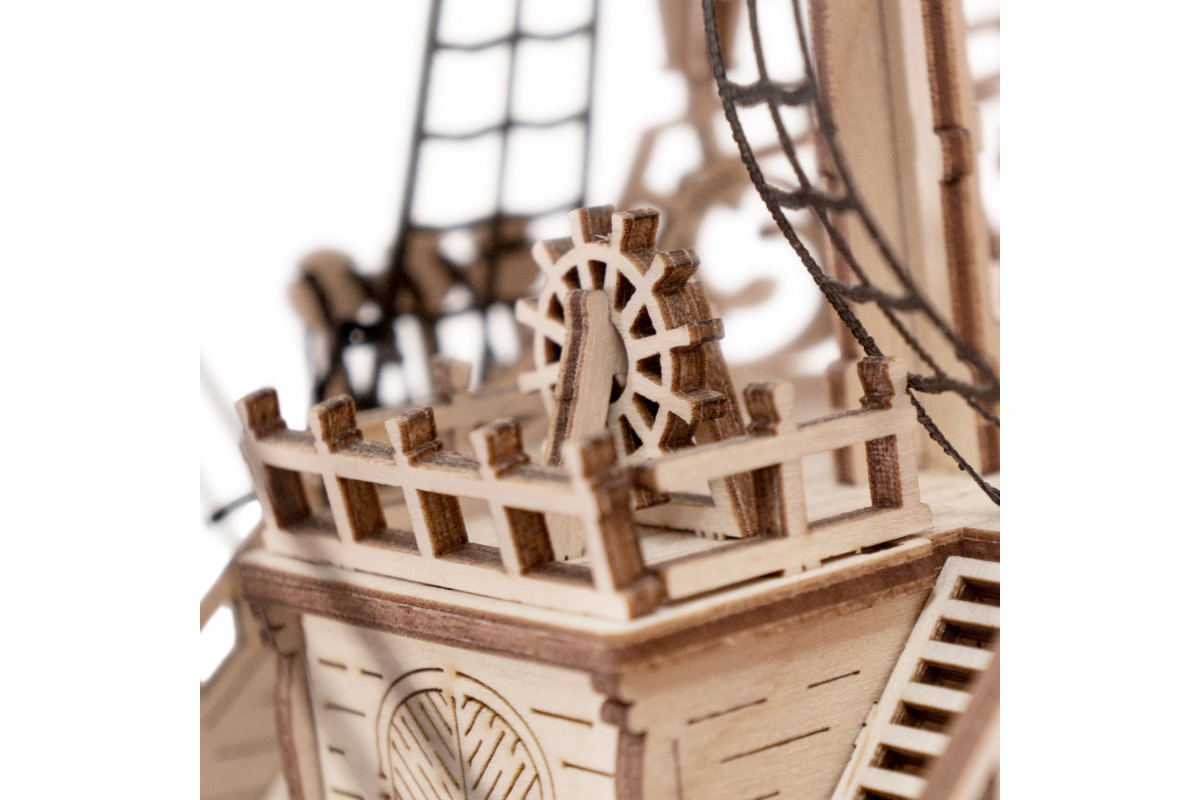 Модель оснащена вращающимся штурвалом, что добавляет интерактивности и ощущения управления настоящим кораблем. С 10 тканевыми парусами и 50 метрами канатной нити, вы сможете создать величественный облик корабля, который будет радовать глаза и вдохновлять на новые морские приключения.