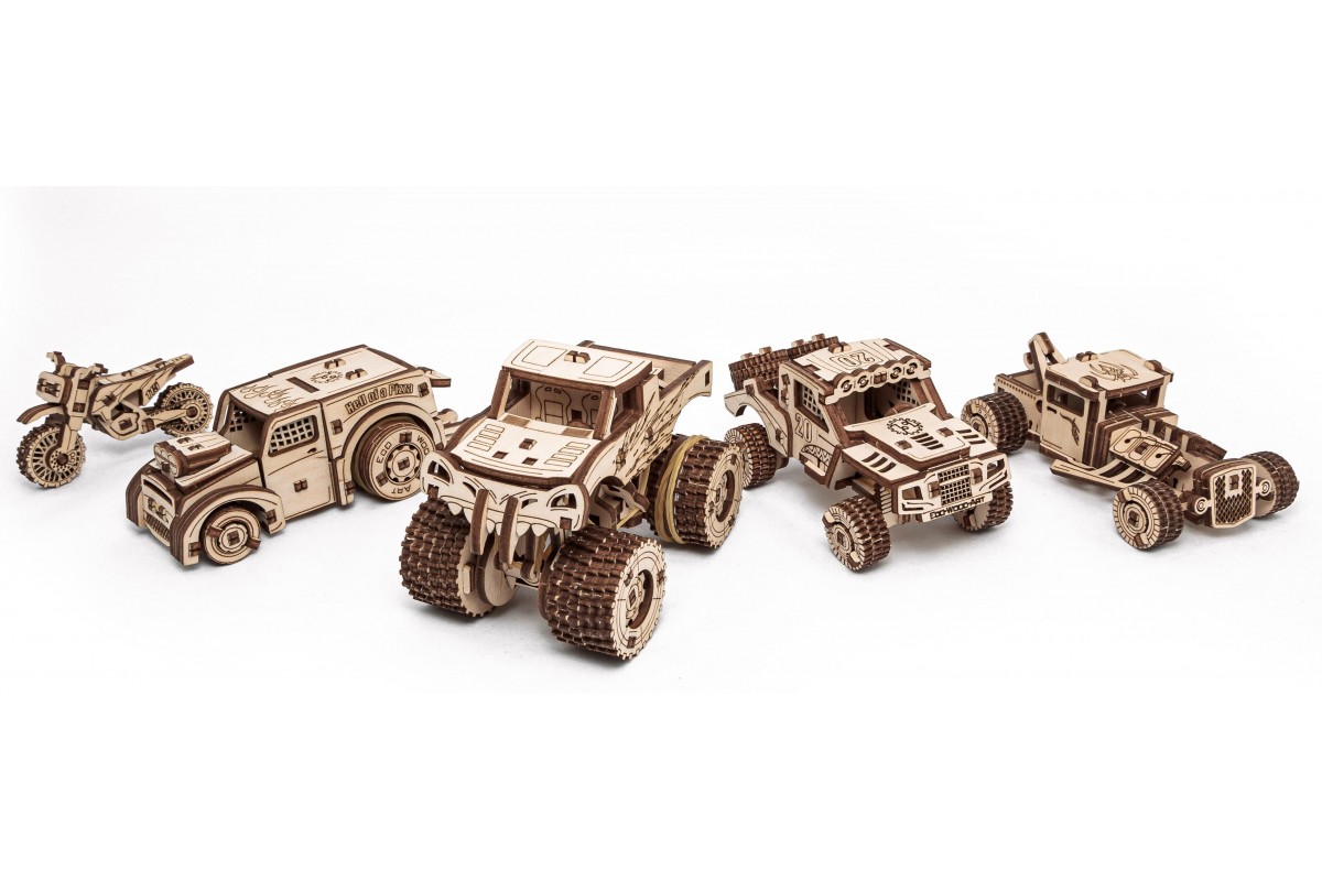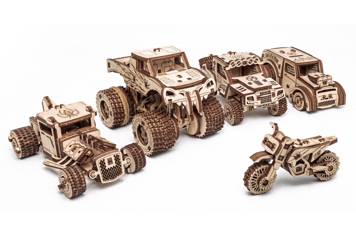 В комплект входит Хот Род, Монстр Трак, Драгстер, Мотоцикл для кросса и Прераннер. Длина машинок и мотоцикла от 10 до 12 см. Проработаны мельчайшие подробности. Собранные модели могут ездить, также вы можете их раскрасить и выставить в коллекцию. Сборка без клея.