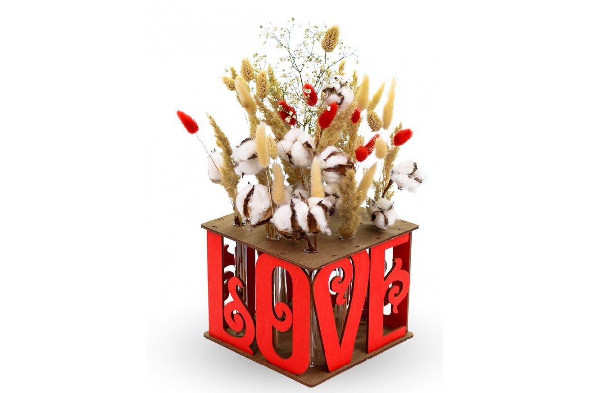 Креативная и оригинальная интерьерная ваза с колбами для оформления подарка любимым. Ваза с пробирками может быть хорошим подарком для любимой или любимому или любой праздник. Стильное сочетание деревянной основы и стеклянных колб с надписью "LOVE" создает оригинальную цветочную композицию для подарка, которая порадует ваших любимых, мужа или жену, но и станет стильным элементом для декора и интерьера дома. Подарочный набор может стать оригинальным подарком для девушки, супруге или для женщины на день рождения.