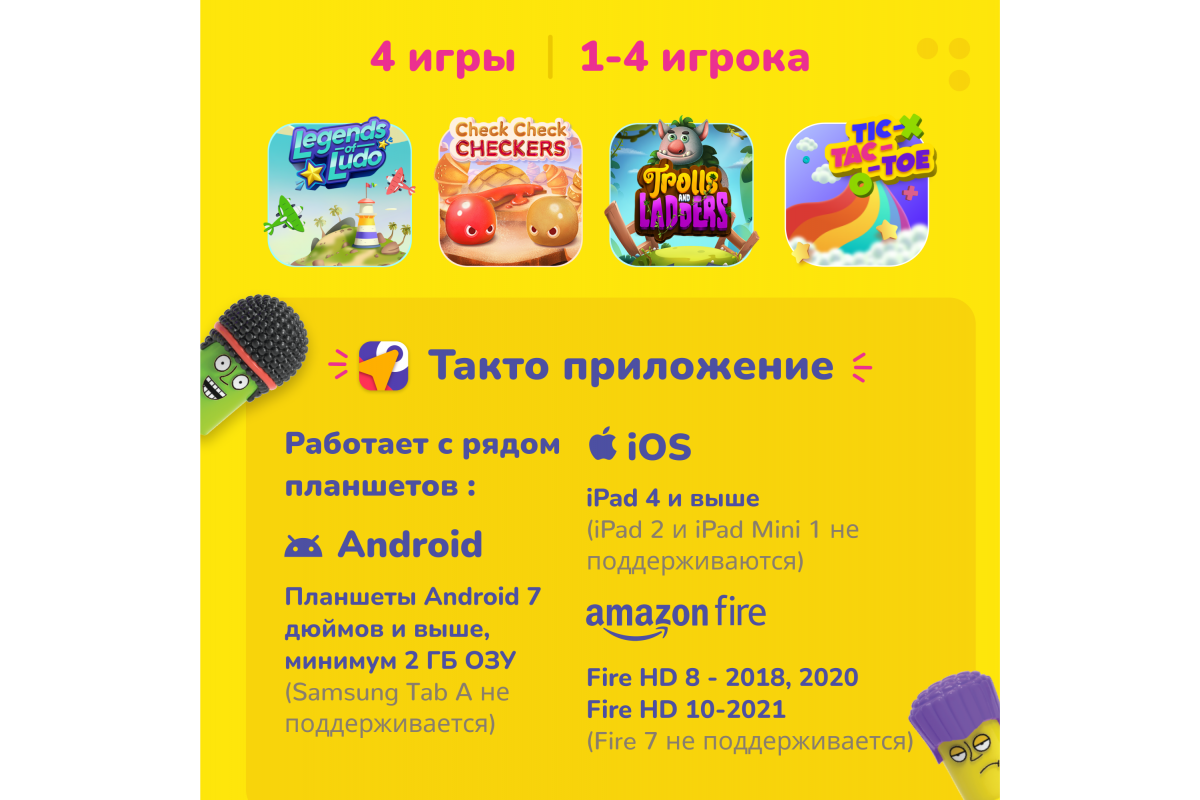 В каждом наборе есть персонажи и игровое оборудование, так что вы можете управлять игрой, перемещая персонажей по экрану. Приложение воспринимает движения персонажей, а затем изменяет ход игры, анимацию и создает новые задачи, в зависимости от того, как вы решите играть со своими физическими персонажами. Существует несколько различных вариантов Такто, и у каждого варианта есть свои собственные уникальные фигуры.