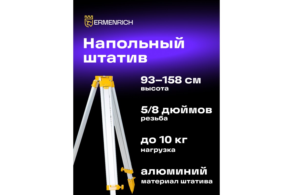 Штатив Ermenrich PLT30 предназначен для установки строительного или геодезического оборудования: нивелиров, рулеток и проч. Телескопическая конструкция позволяет варьировать высоту от 930 до 1580 миллиметров. Ножки из алюминия оснащены упорами для установки на грунт. Несмотря на легкость конструкции, штатив выдерживает оборудование весом до 10 кг.
