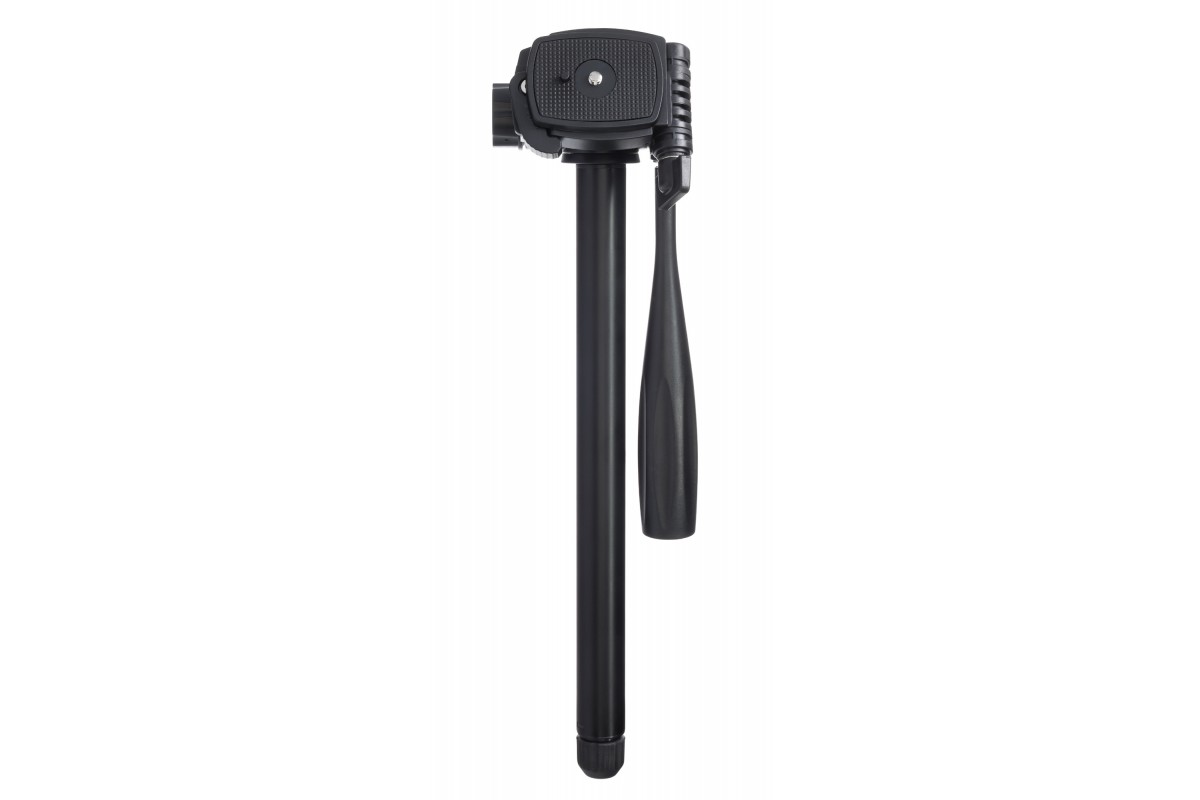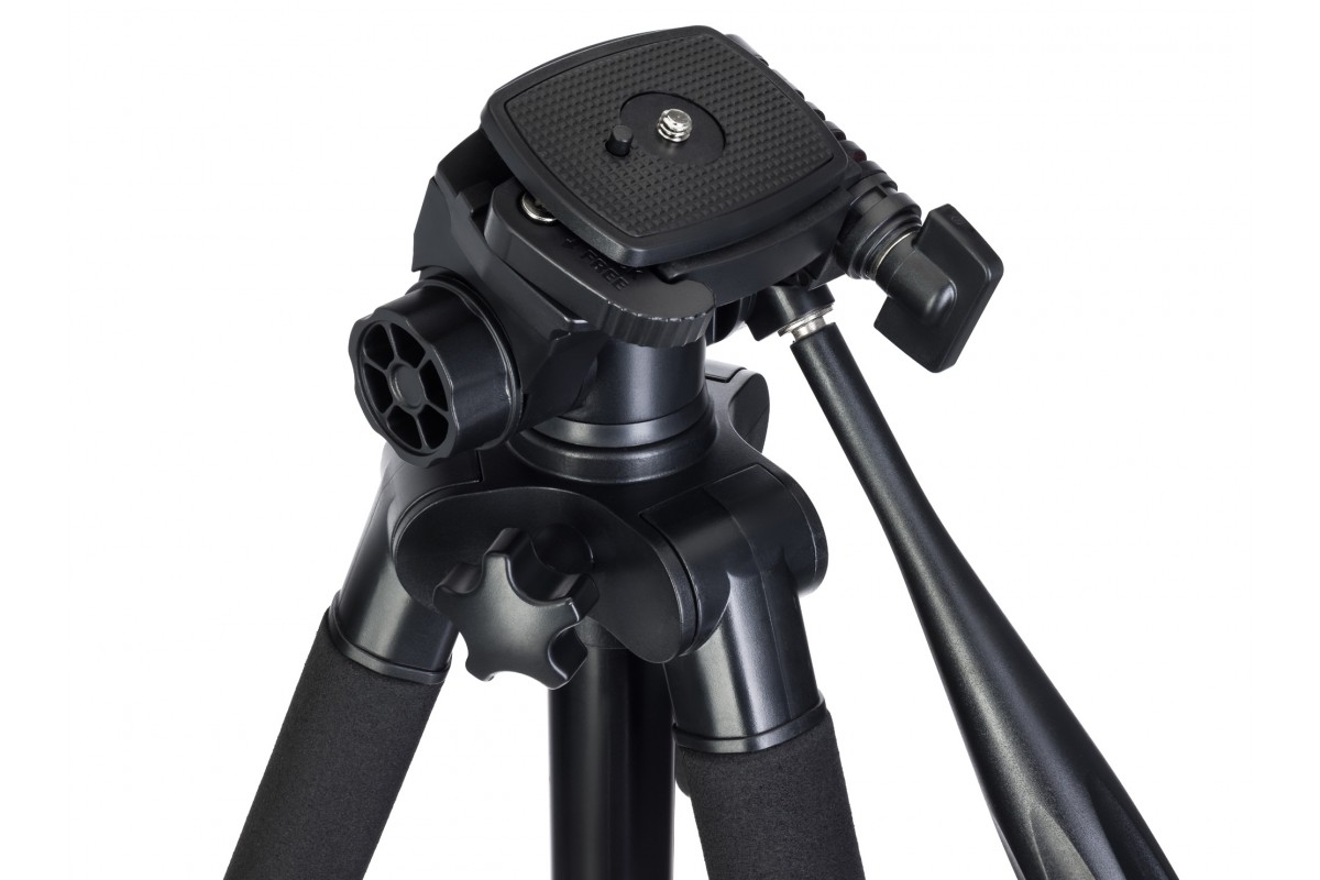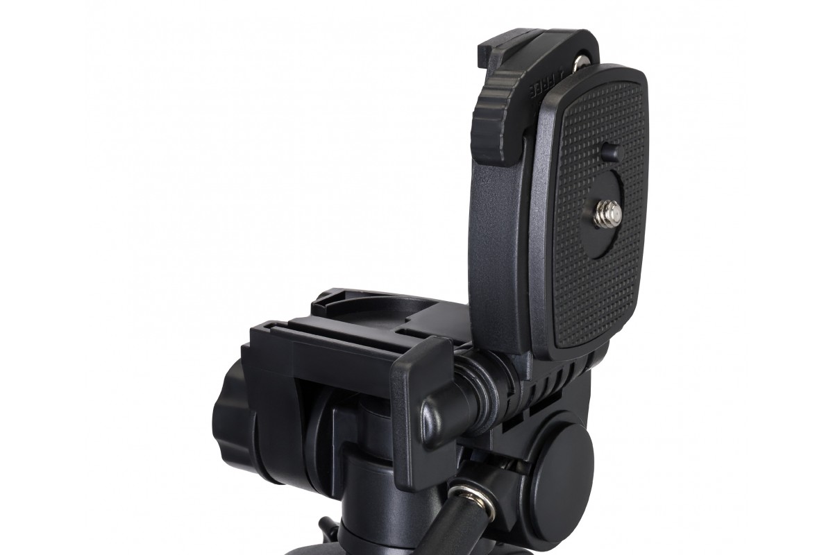 Поворотная головка обеспечит идеальное расположение прибора на штативе: по горизонтали она вращается вокруг себя на 360°, также доступны наклоны вперед и назад, фиксатор отклоняется до 90° вбок. Центральный сегмент штатива можно использовать как отдельный монопод.