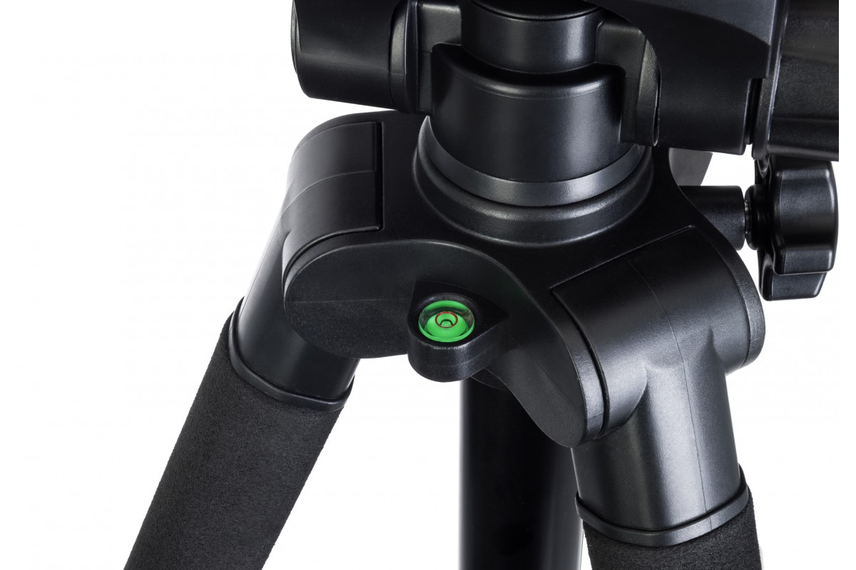 Высота штатива регулируется двумя способами: изменением длины ножек или вертикальным перемещением центральной штанги. Надежные флип-замки гарантируют устойчивость всей конструкции, а крюк для утяжелителя позволит подвесить дополнительный стабилизирующий вес при необходимости. Резиновое покрытие ножек предотвратит скольжение по гладкому полу. Правильность установки можно оценить при помощи встроенного пузырькового уровня.