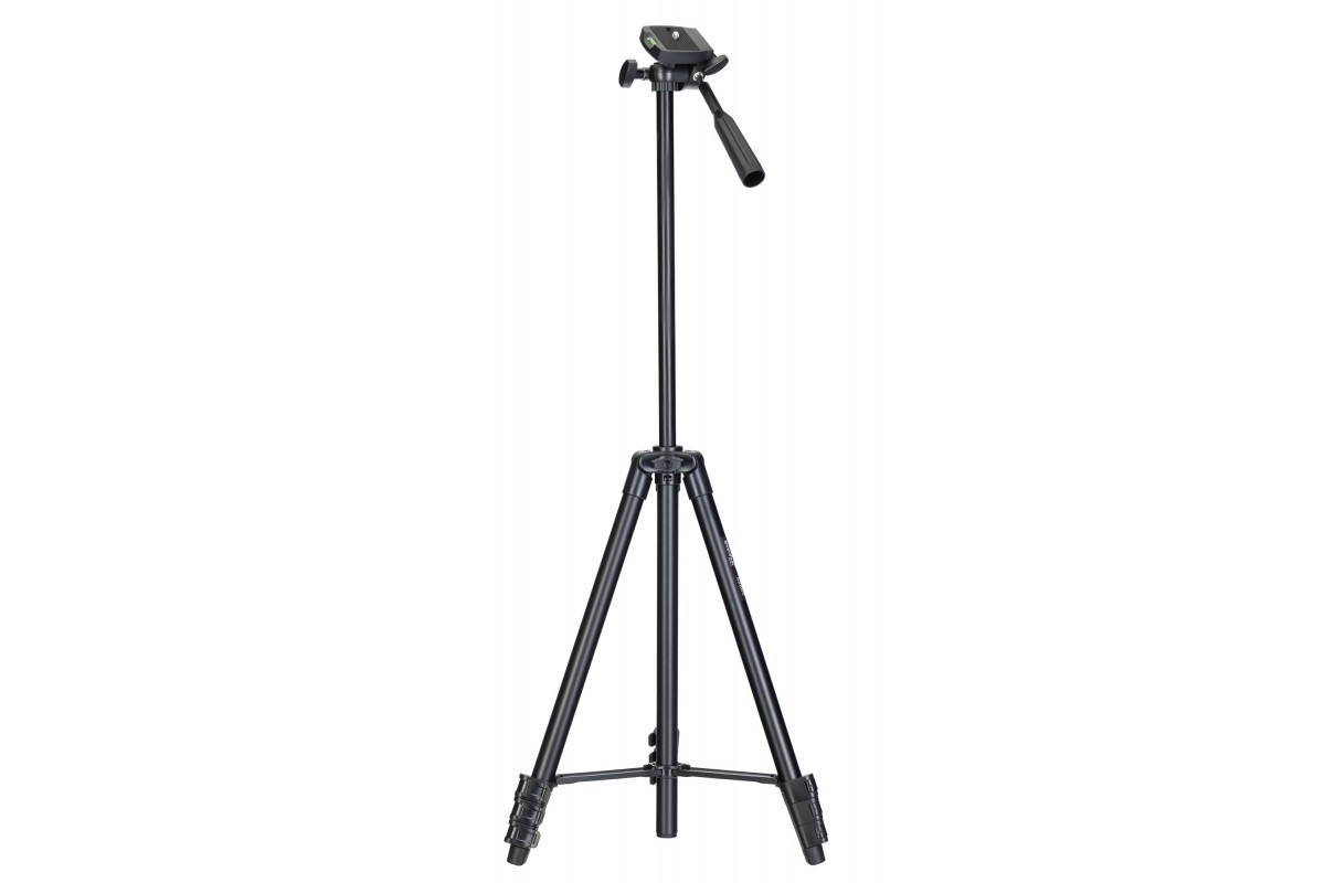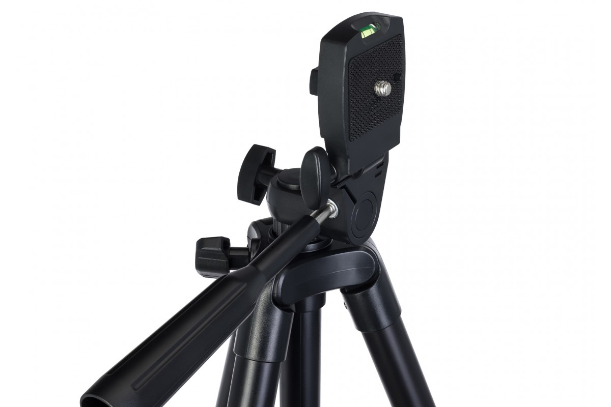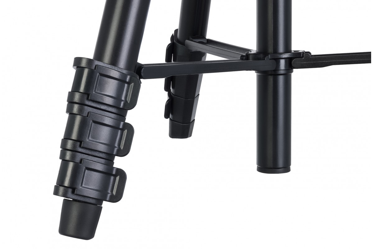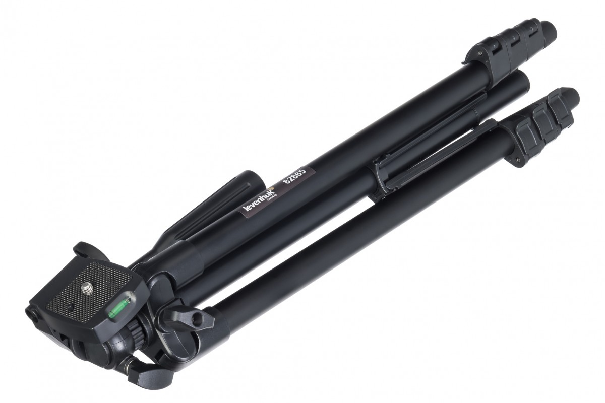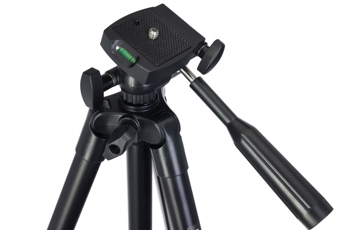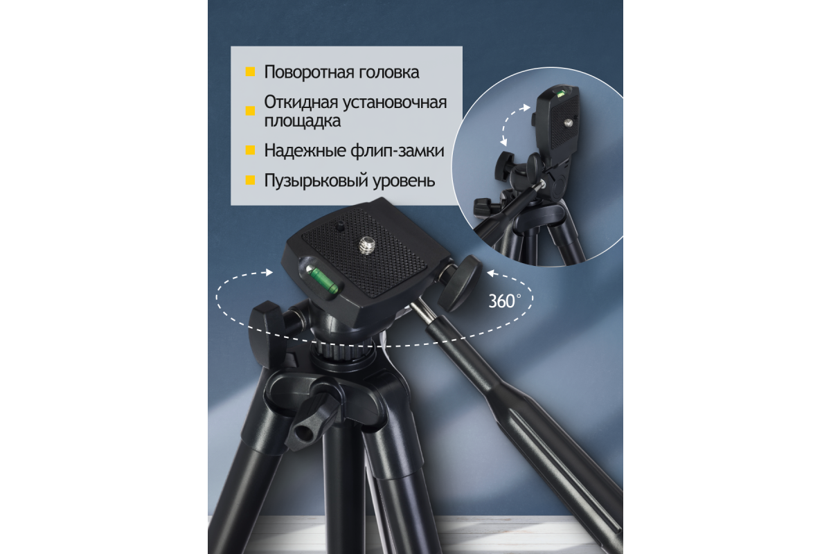 Благодаря поворотной головке пользователь может расположить выбранный прибор под нужным ему углом, поворачивая его в горизонтальной плоскости и наклоняя вперед и назад. Установочная площадка несъемная и откидывается вбок на угол 90° для установки оборудования в оптимальное положение. Высота штатива регулируется: это можно сделать как с помощью выдвижения ножек, так и вытянув центральную штангу. Надежные флип-замки обеспечивают устойчивость конструкции, обрезиненные ножки предотвращают скольжение. Проверить, насколько ровно установлен штатив, пользователь может при помощи встроенного пузырькового уровня.