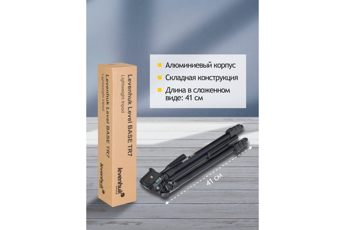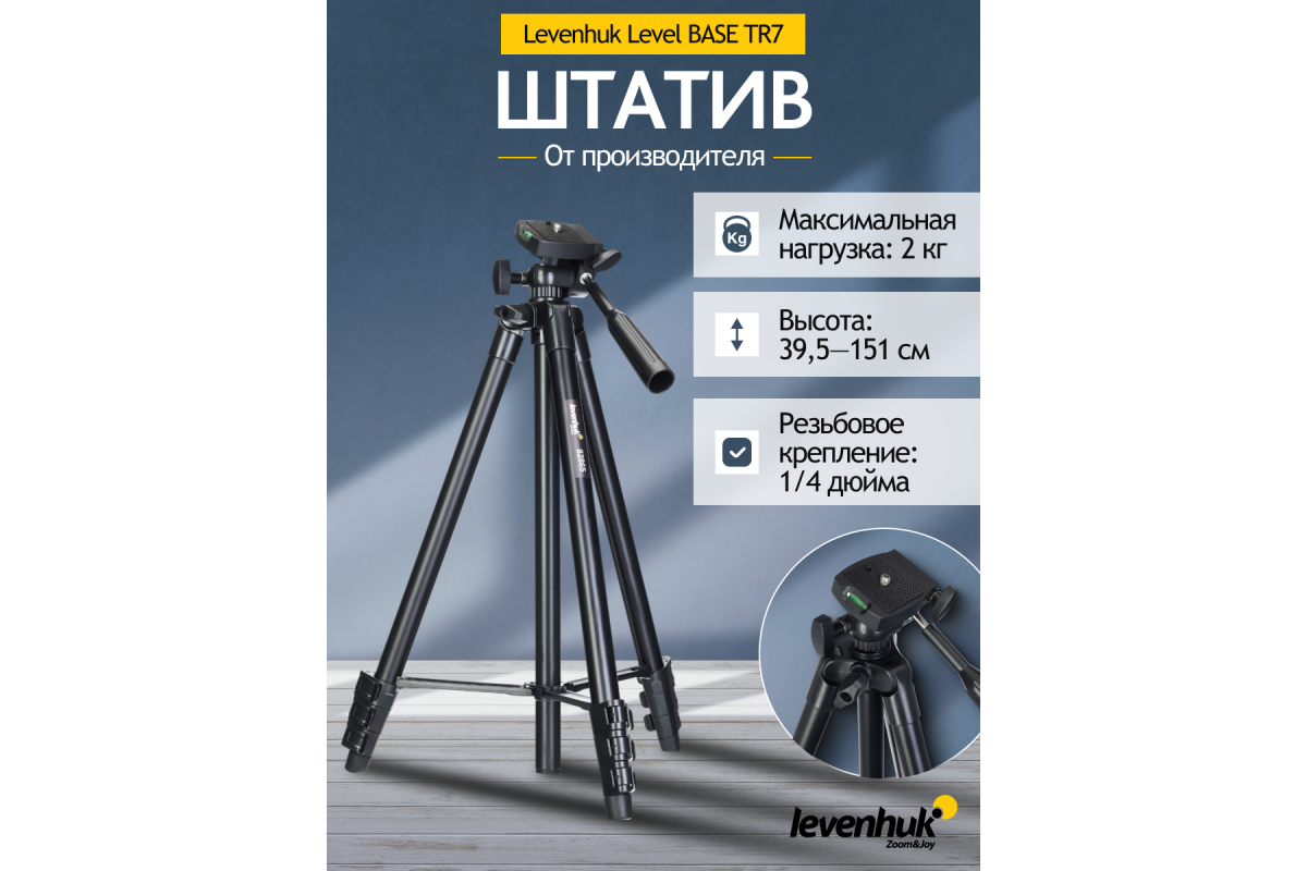 Штатив Levenhuk Level BASE TR7 универсален в своем применении. Его можно использовать с фото- и видеооборудованием, проекторами, осветительными приборами, наблюдательной оптикой и проч. Он рассчитан на нагрузку до 2 кг и имеет крепление под стандартную резьбу 1/4 дюйма (в некоторых случаях может понадобиться дополнительный адаптер).