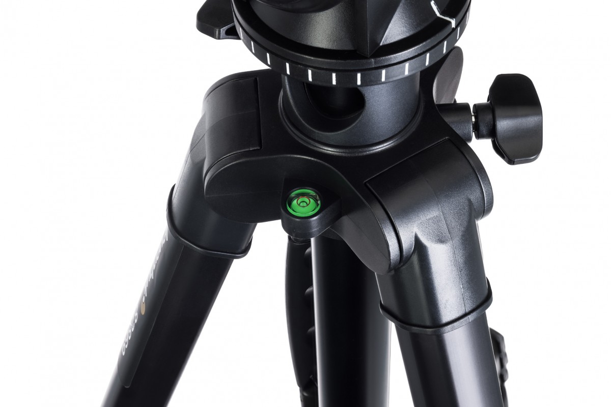 Штатив регулируется по высоте (для этого меняется высота ножек и выдвигается центральная штанга), а флип-замки надежно фиксируют его, гарантируя устойчивость. Ножки штатива прорезины – он не будет скользить по полу. Конструкцию можно дополнительно стабилизировать с помощью груза – для этого предусмотрен специальный крюк. Встроенный пузырьковый уровень поможет правильно оценить, насколько ровно установлена конструкция.