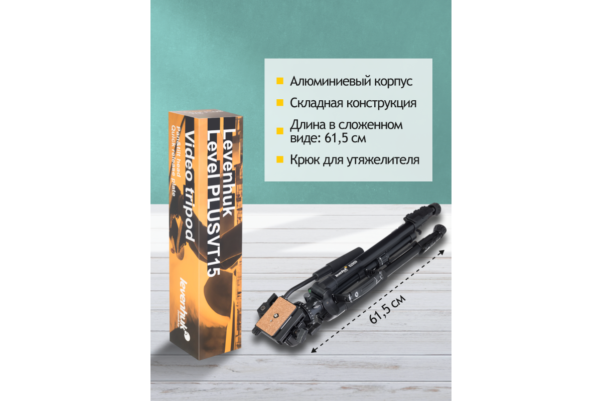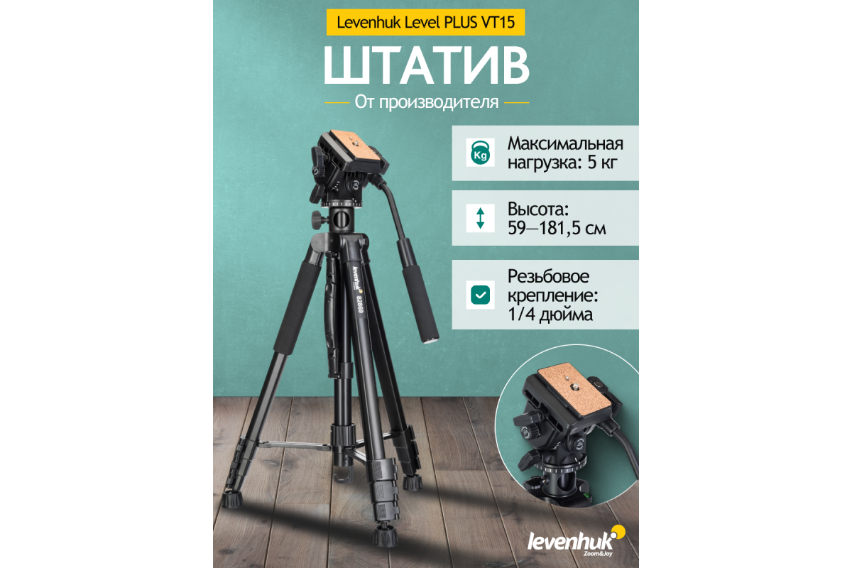 Штатив Levenhuk Level PLUS VT15 предназначен для установки оборудования весом до 5 кг, имеющего стандартную резьбу 1/4 дюйма. Он подойдет как для установки съемочной аппаратуры, так и наблюдательной оптики, а также света или проекторов. Для некоторых приборов может понадобиться адаптер, которого нет в комплекте поставки. Центральный сегмент штатива можно использовать самостоятельно – в качестве монопода, а также как горизонтальное крепление для съемки сверху вниз.