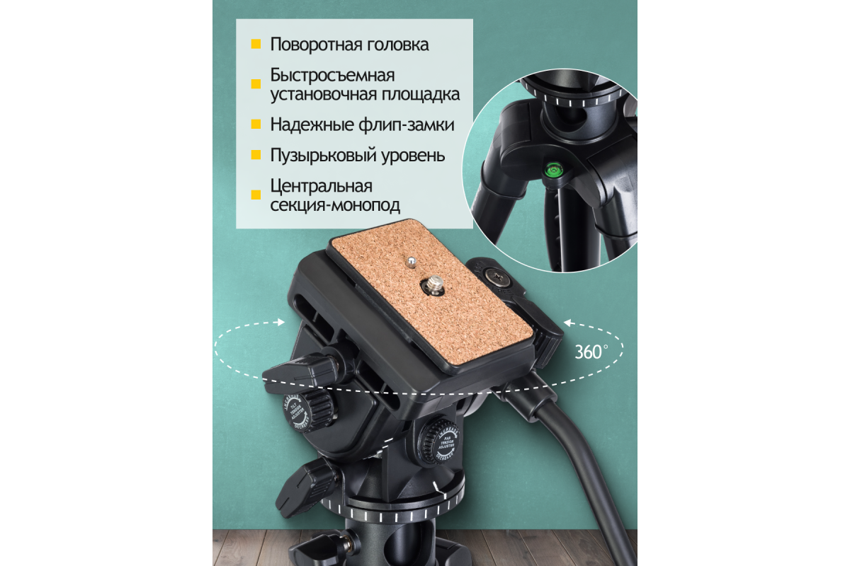 • Регулируемая высота, вращающаяся головка с возможностью наклона, быстросъемная площадка-фиксатор
