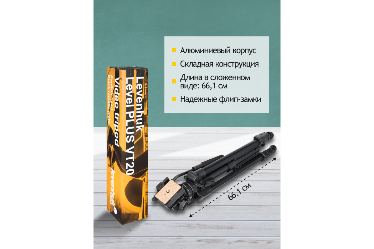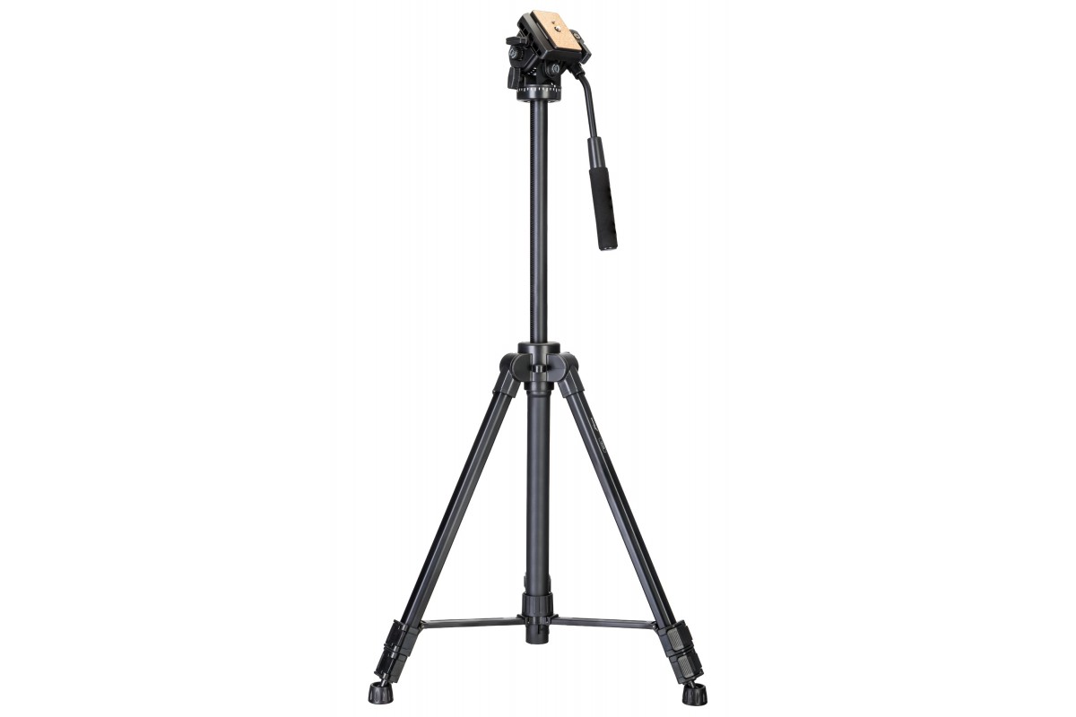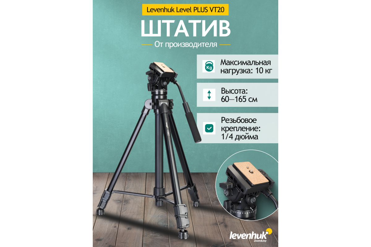 Штатив Levenhuk Level PLUS VT20 предназначен для установки оптической, фото- или видеотехники весом до 10 кг. Он сделан из алюминия, достаточно компактен в сложенном состоянии, имеет стандартное резьбовое крепление 1/4 дюйма. Его основная особенность – жидкостные демпферы, благодаря которым повороты и наклоны штативной головки происходят более мягко и без рывков. Это особенно полезно, если штатив планируется использовать для видеосъемки, так как ролики станут более плавными.