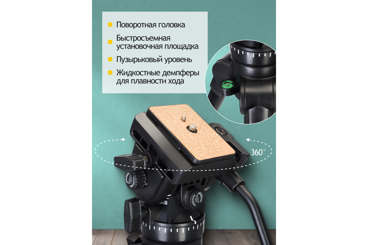Штатив обеспечивает панорамный обзор, т. е. в горизонтальной плоскости головку можно поворачивать на 360°. Также ее можно наклонять вверх и вниз. Чтобы управление было максимально удобным, штатив дополнен ручкой наведения и быстросъемной установочной площадкой. Последняя обеспечивает быстрый доступ к закрепленной технике, так как легко отщелкивается и снимается со штатива.